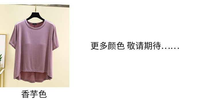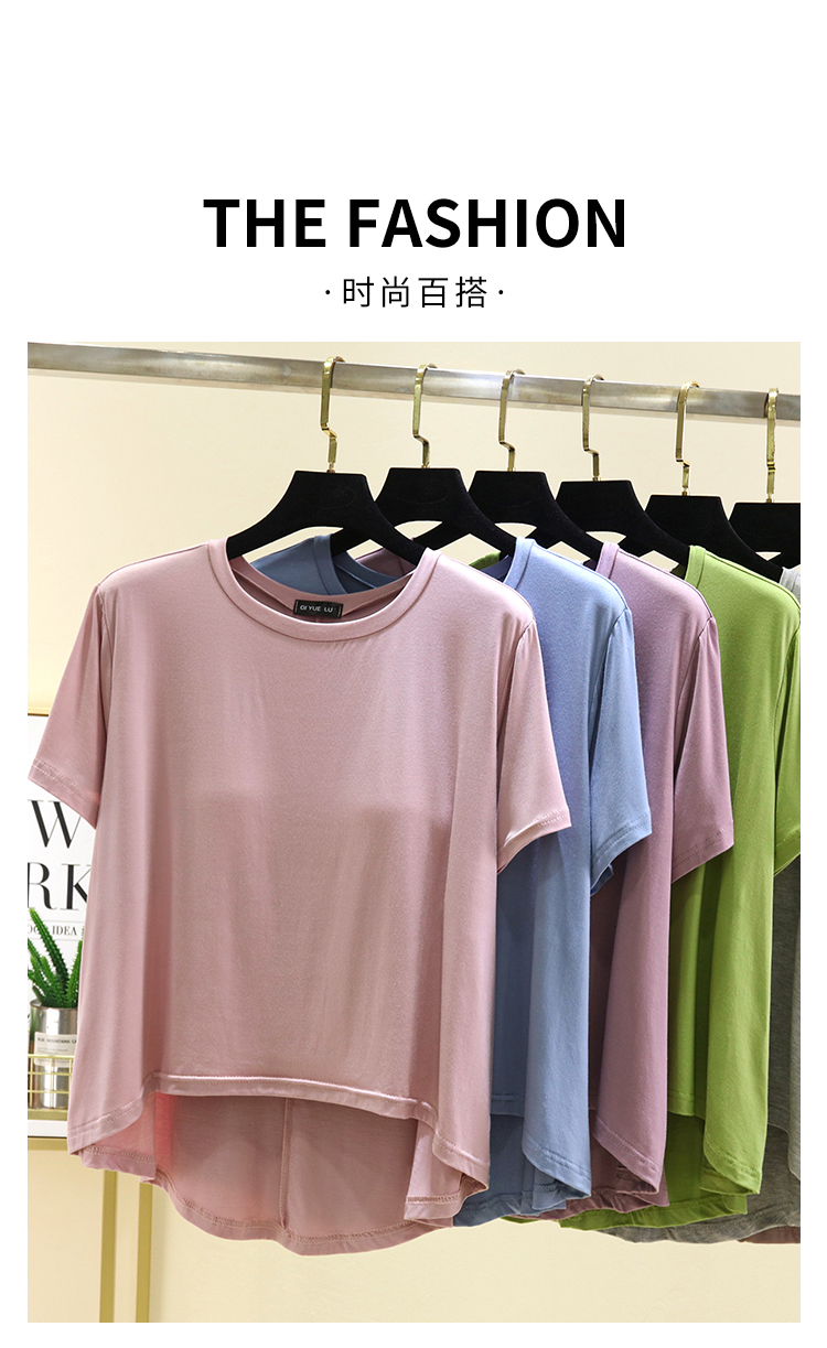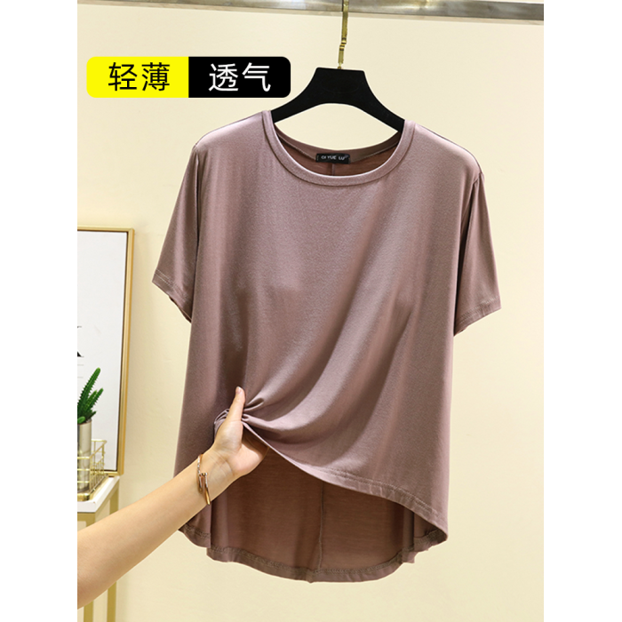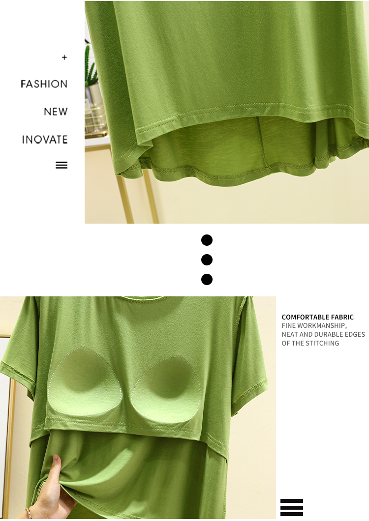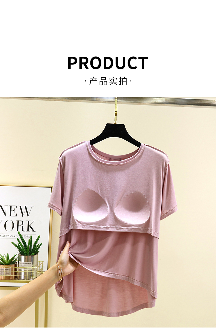 夏季大碼圓領胸墊上衣薄款莫代爾免文胸家居服外穿百搭短袖T恤衫