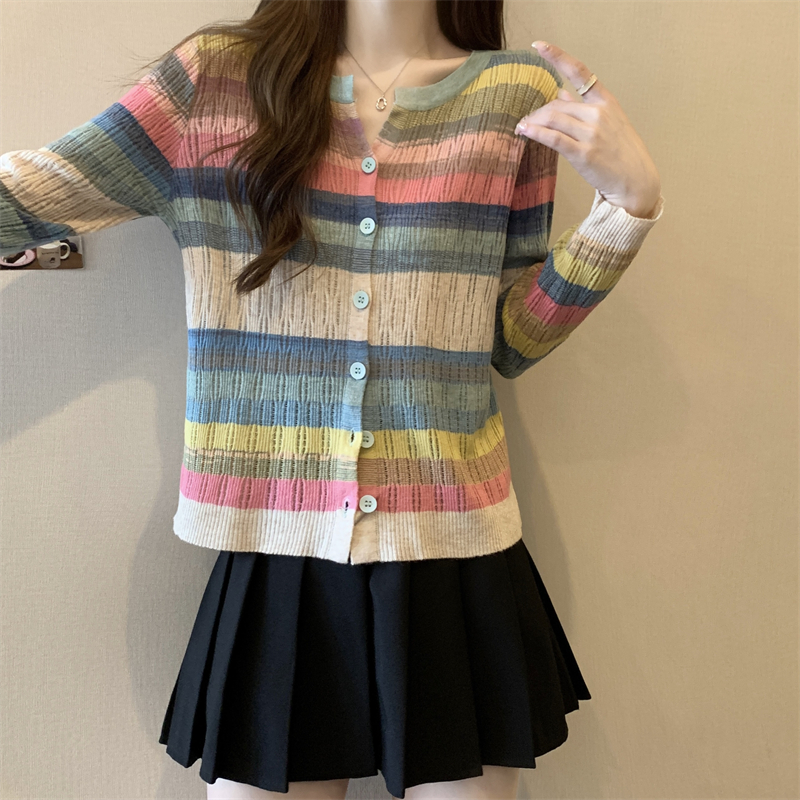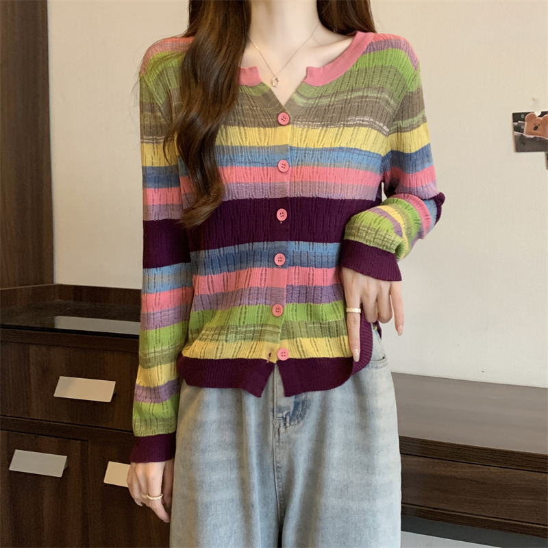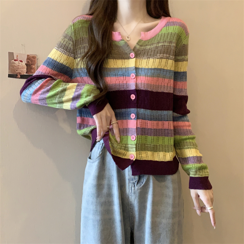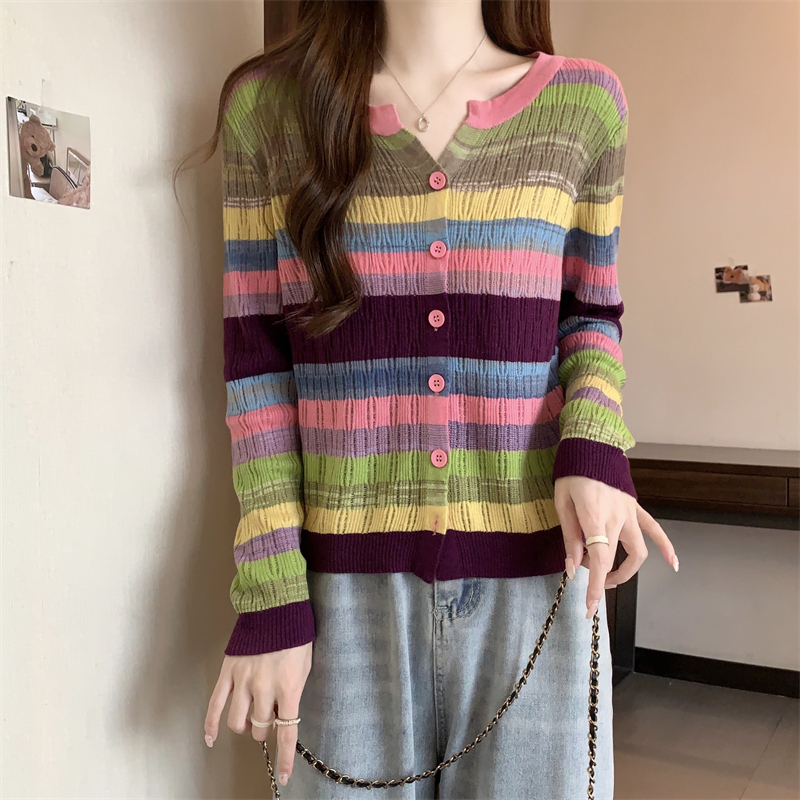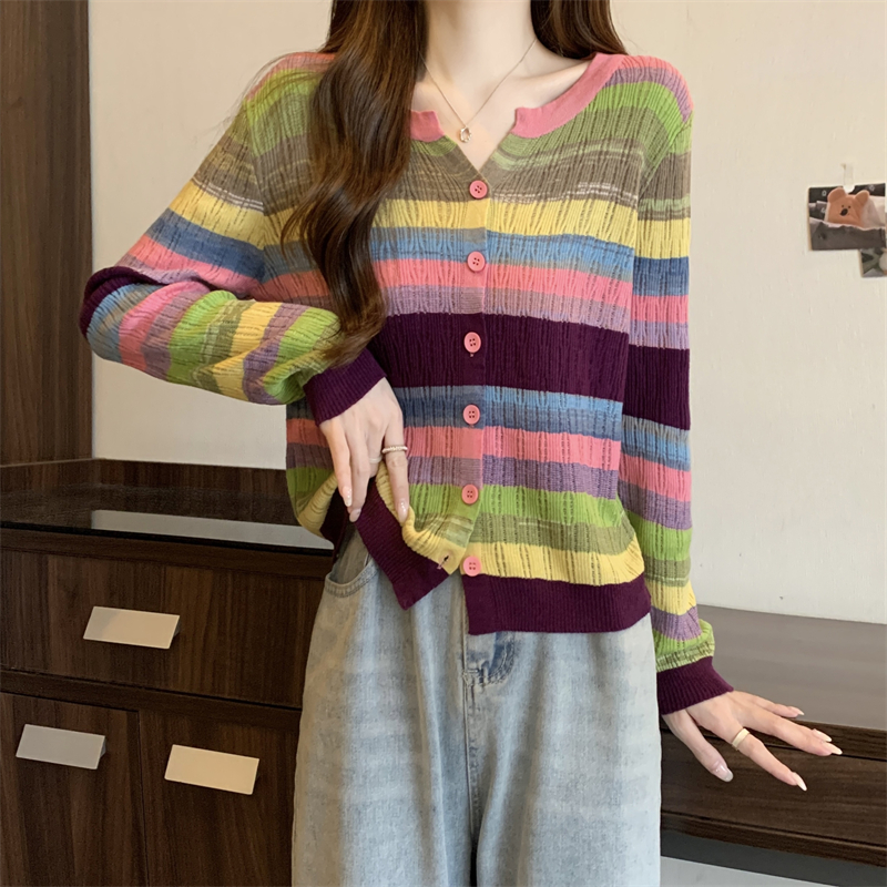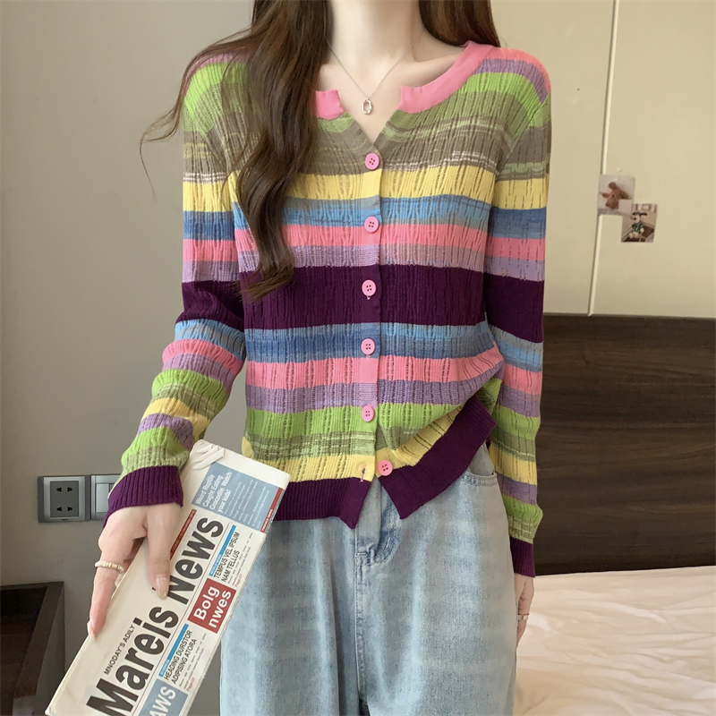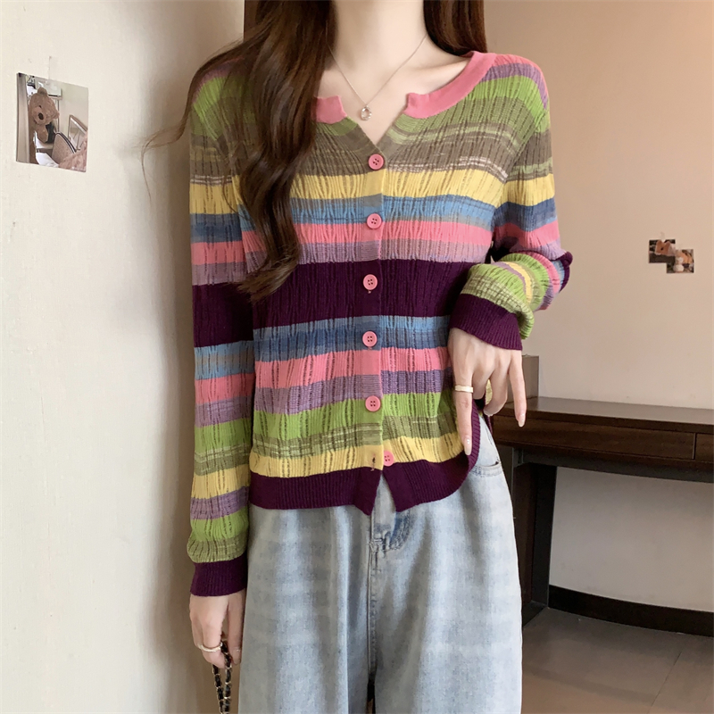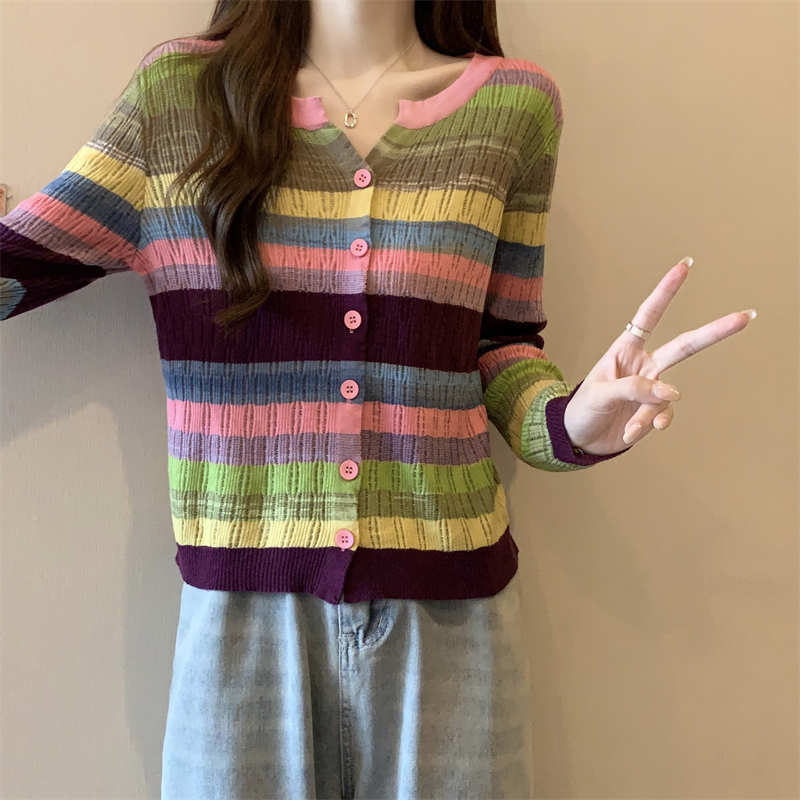 大碼女裝胖MM設計感小衆V領彩虹條紋長袖上衣秋季拼色針織衫T恤女