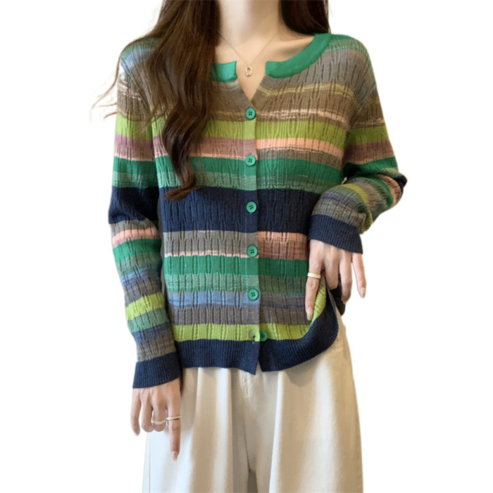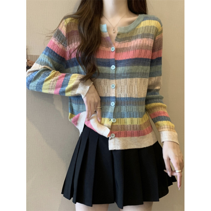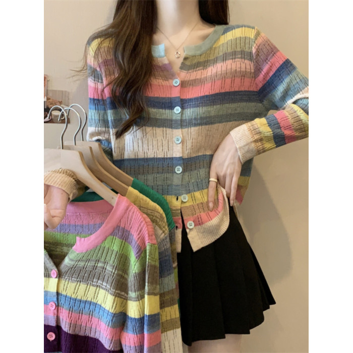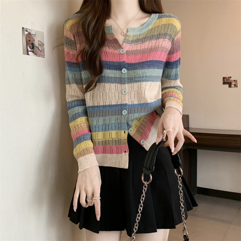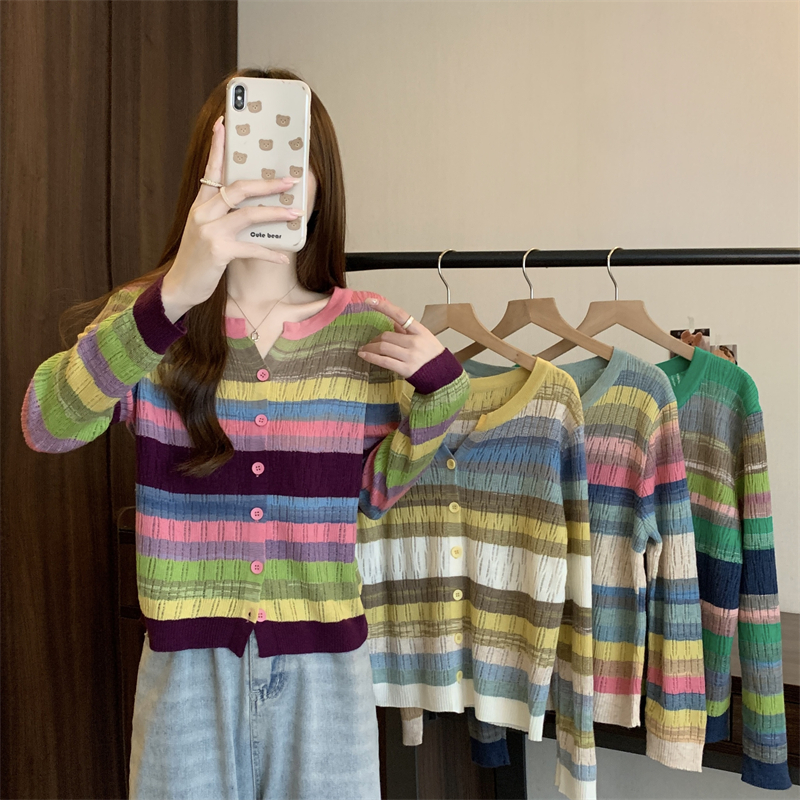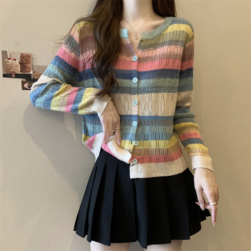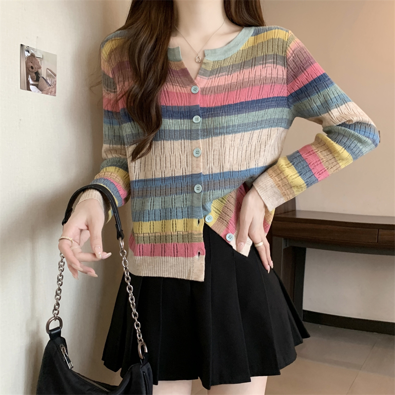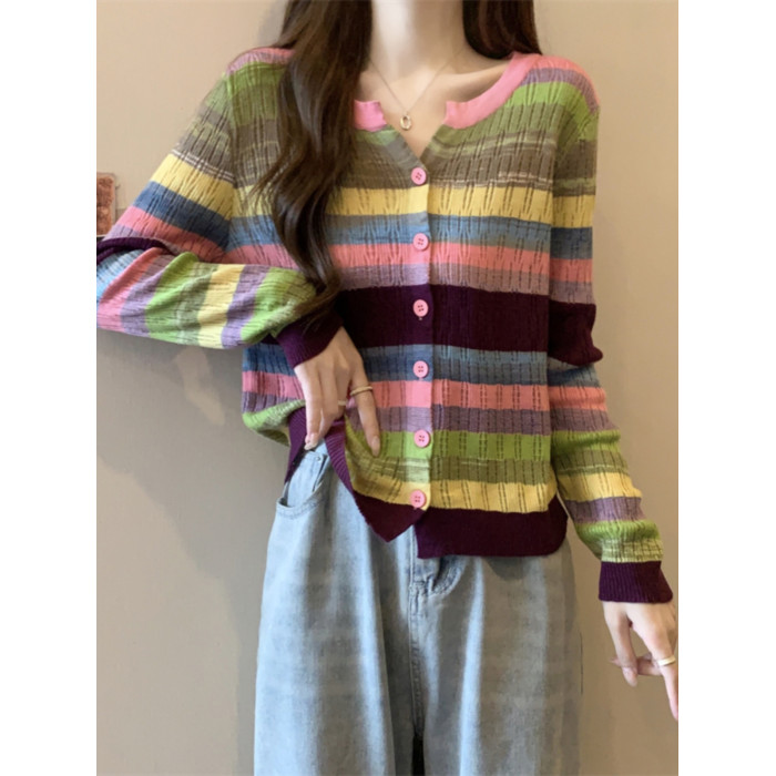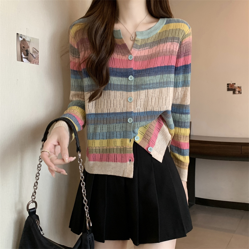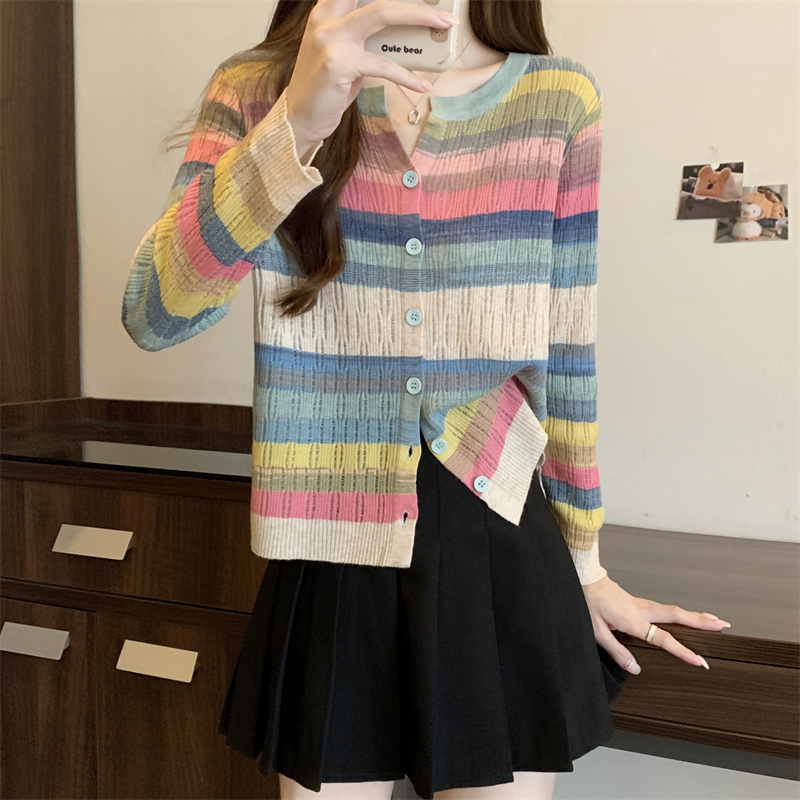 大碼女裝胖MM設計感小衆V領彩虹條紋長袖上衣秋季拼色針織衫T恤女