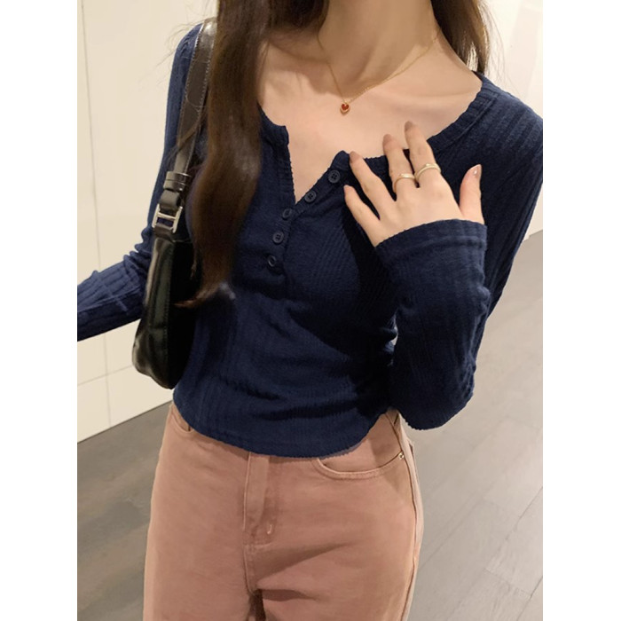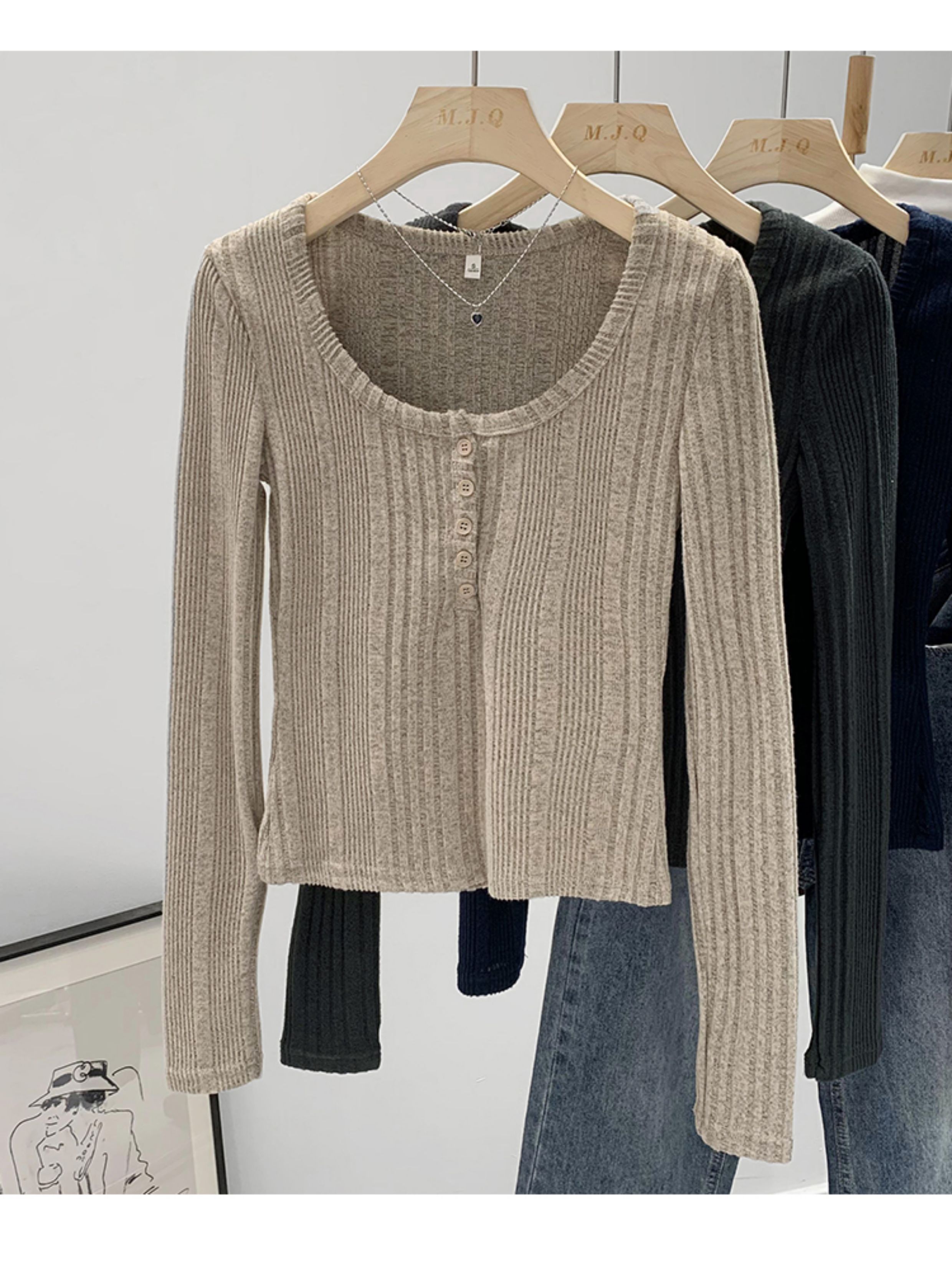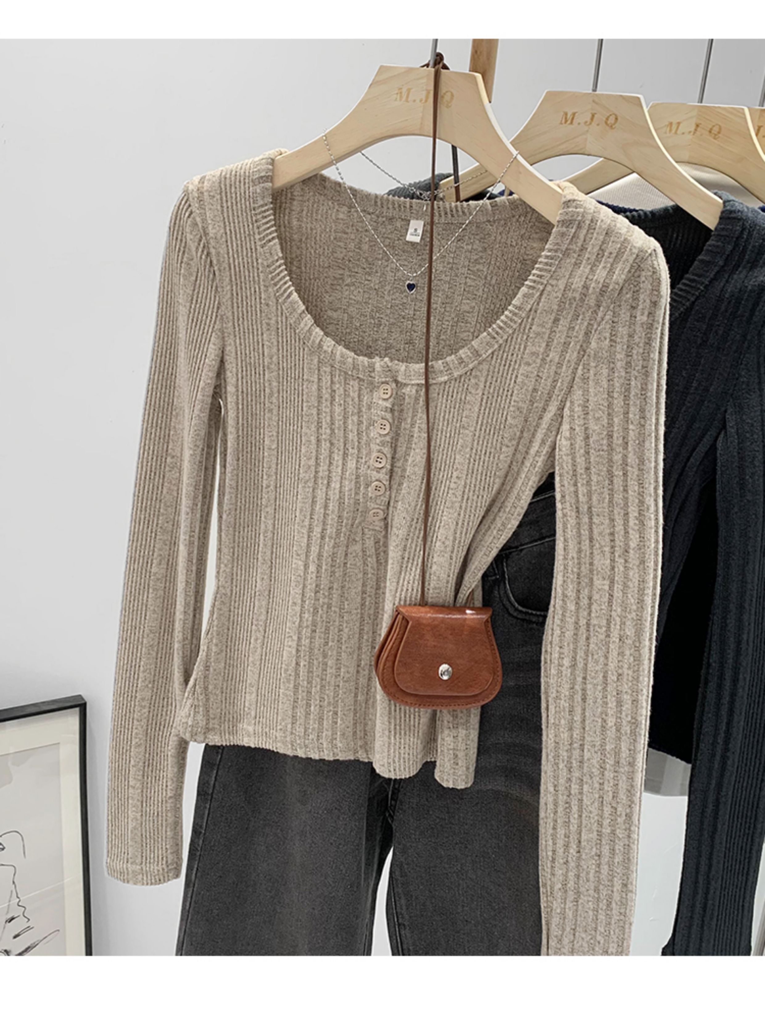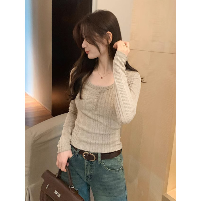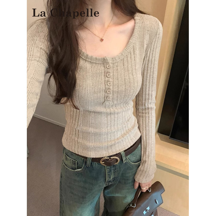 拉夏貝爾韓系u領針織長袖t恤女2025新款秋冬季修身內搭打底衫上衣