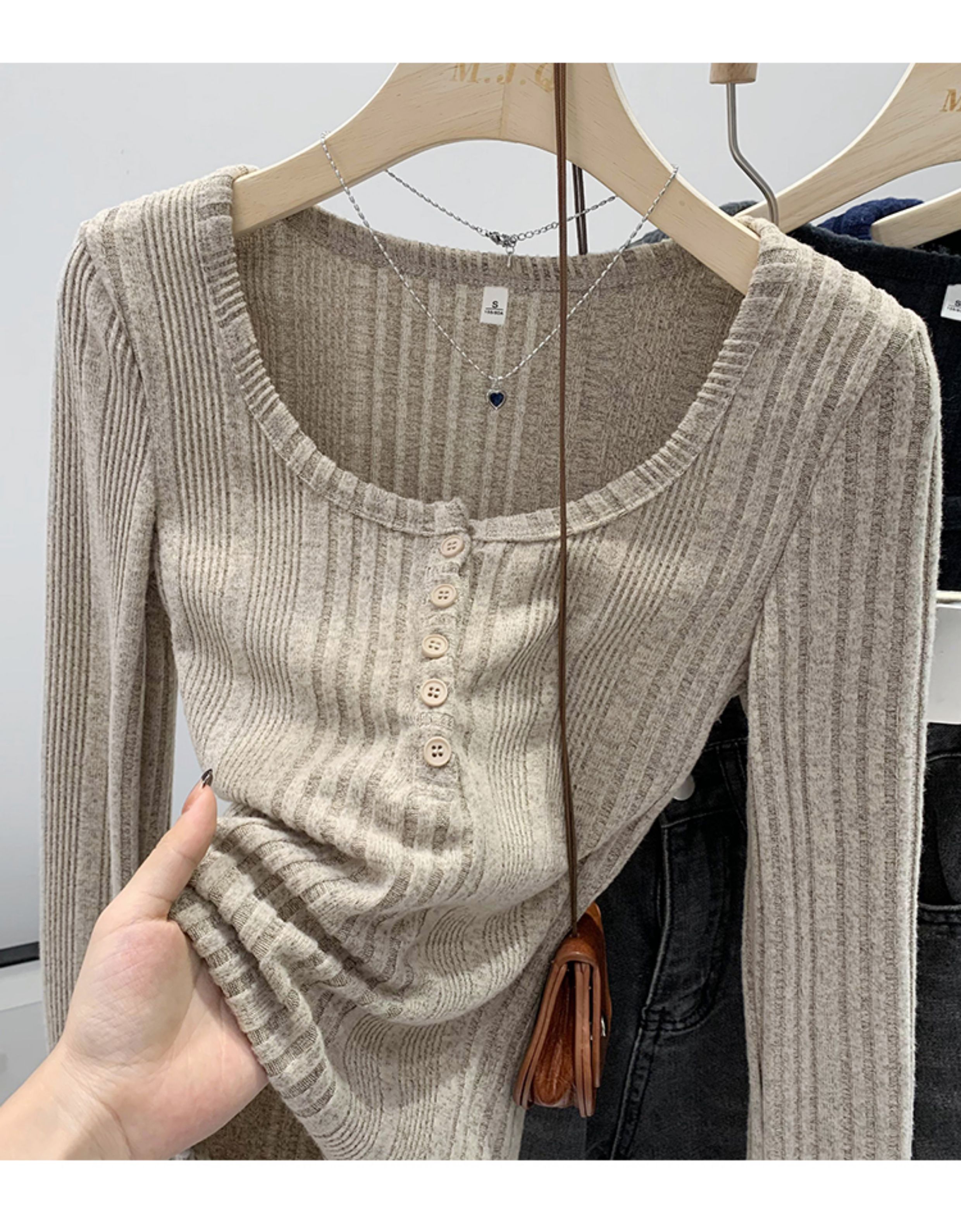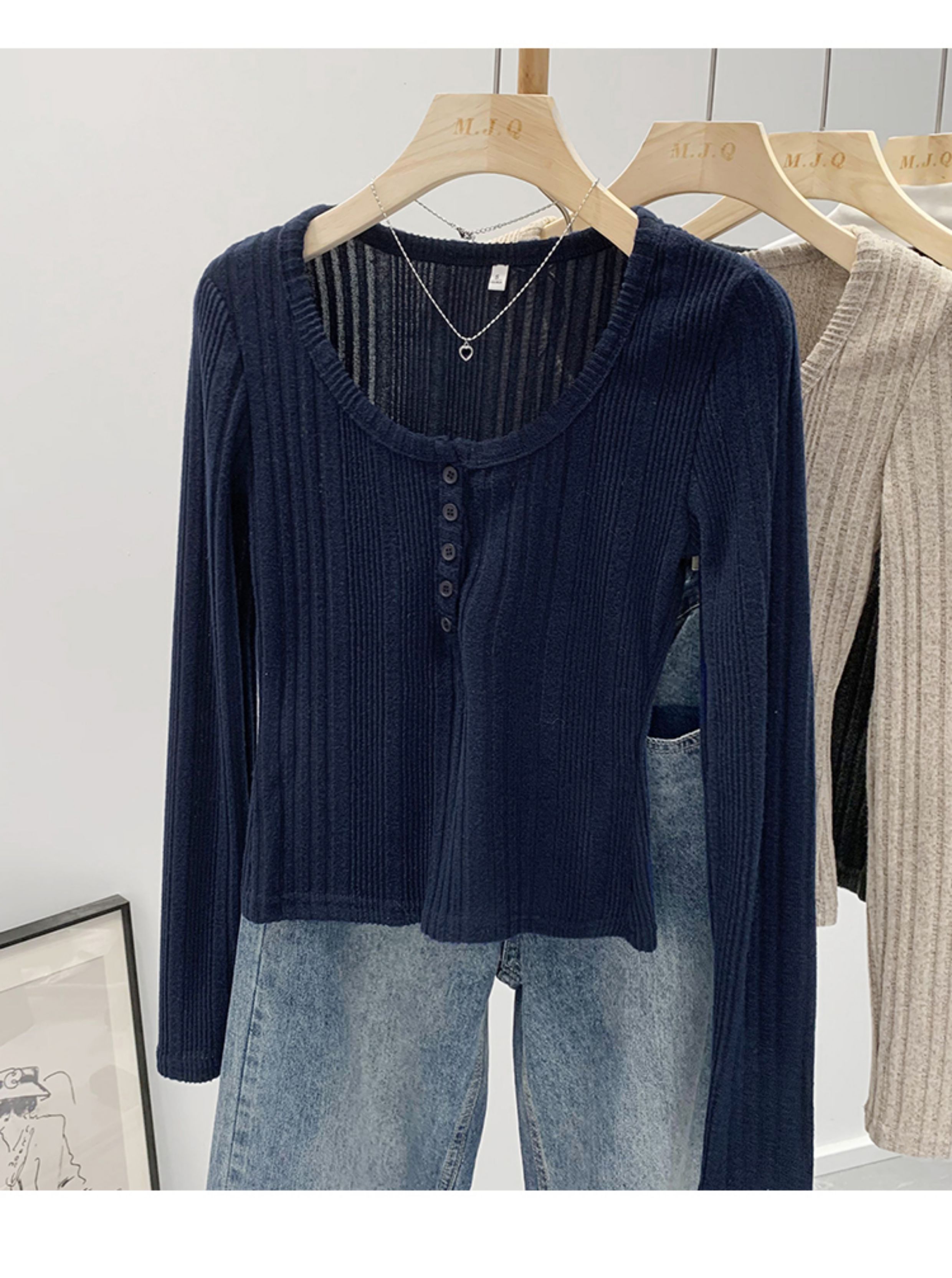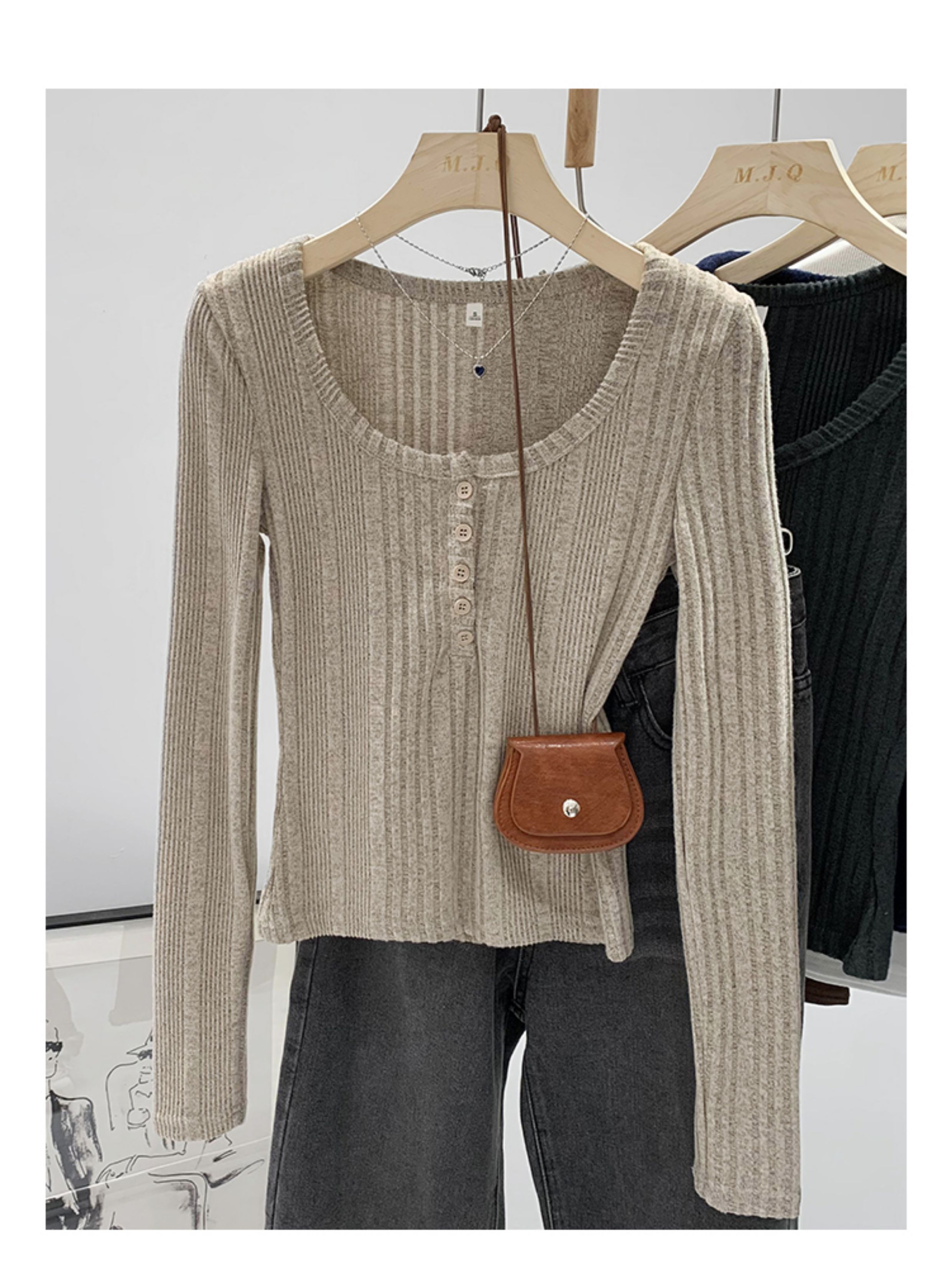 拉夏貝爾韓系u領針織長袖t恤女2025新款秋冬季修身內搭打底衫上衣