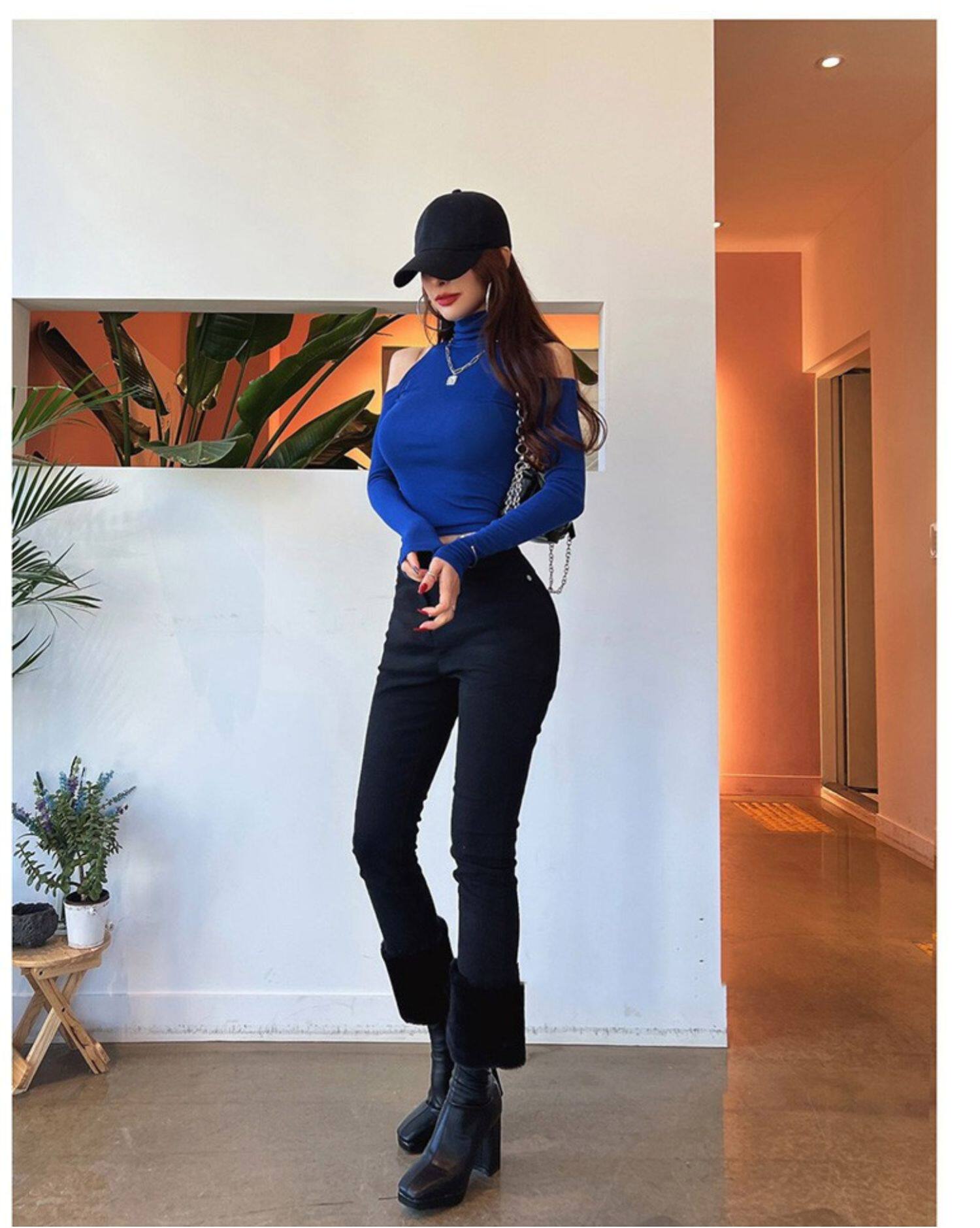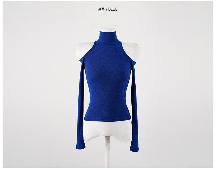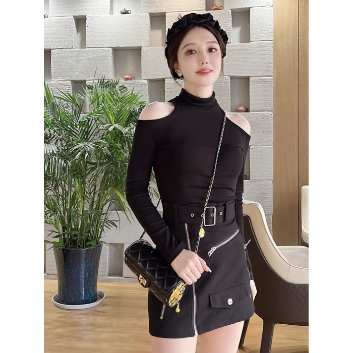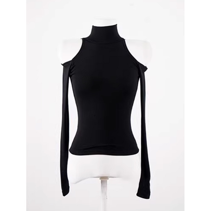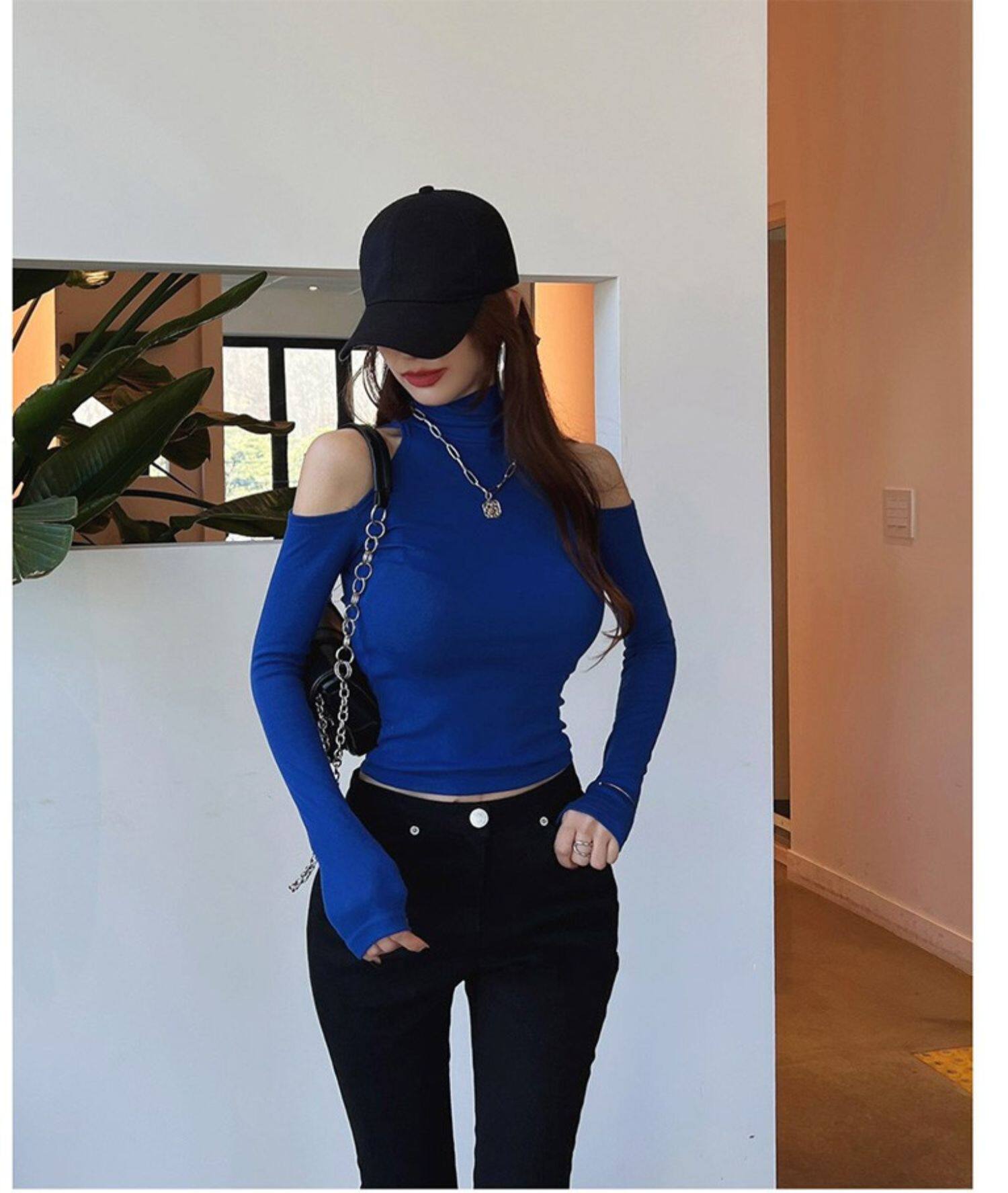 辣妹高領露肩長袖T恤女秋設計感小衆內搭打底衫短款性感緊身上衣