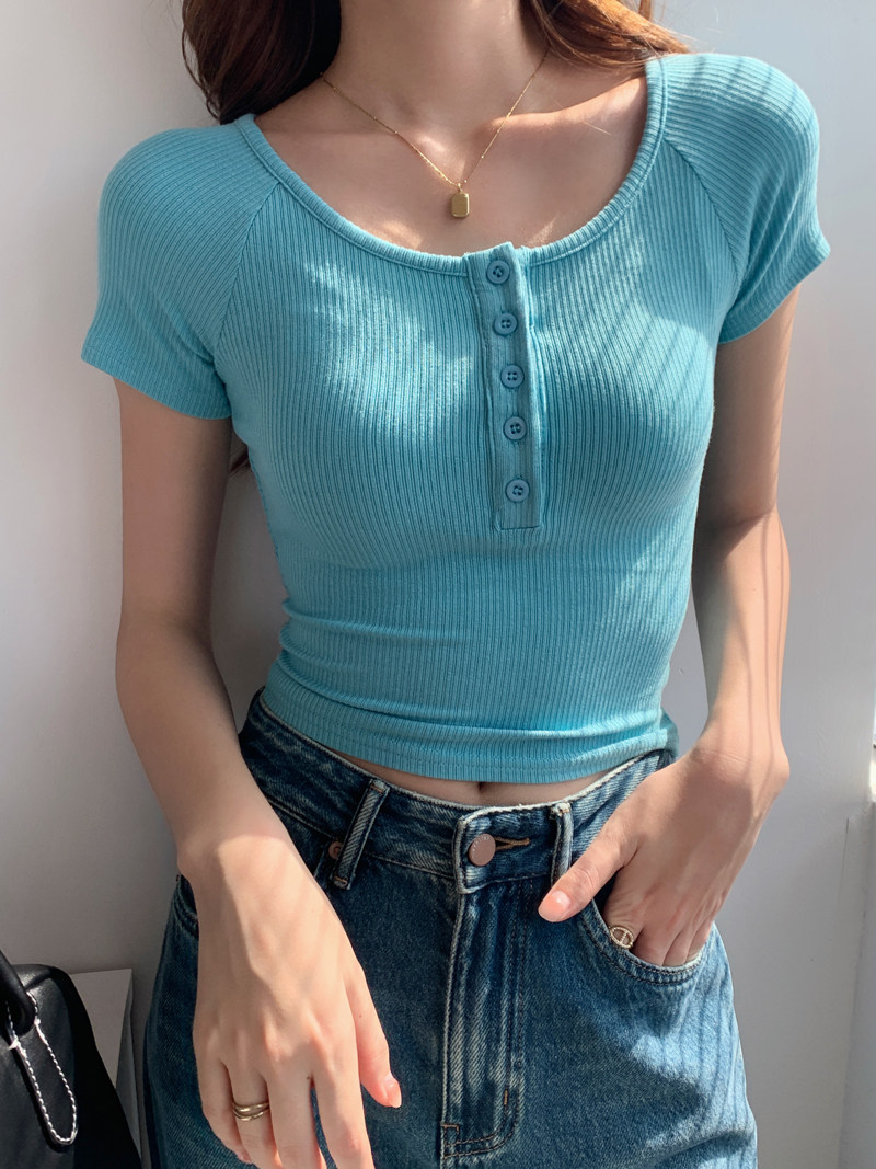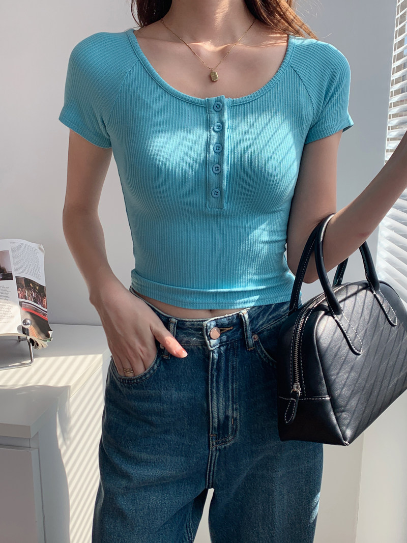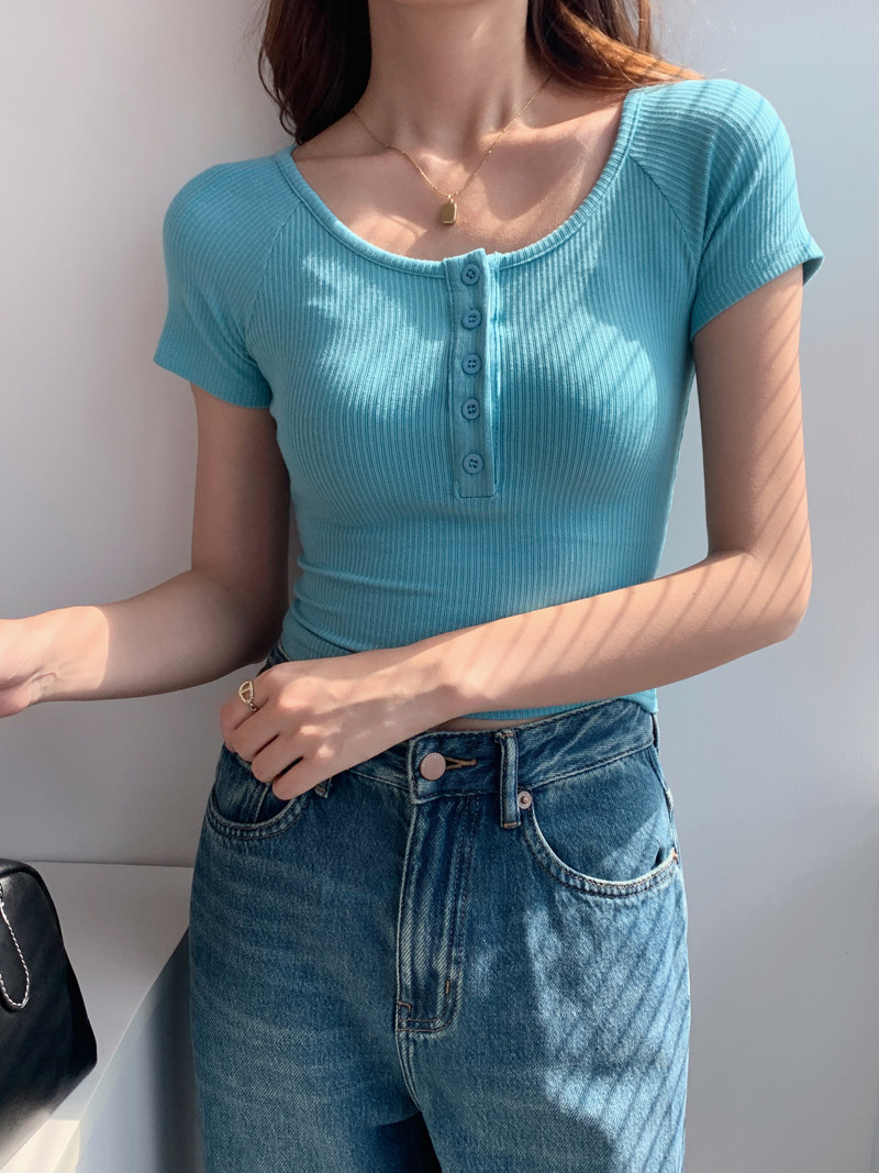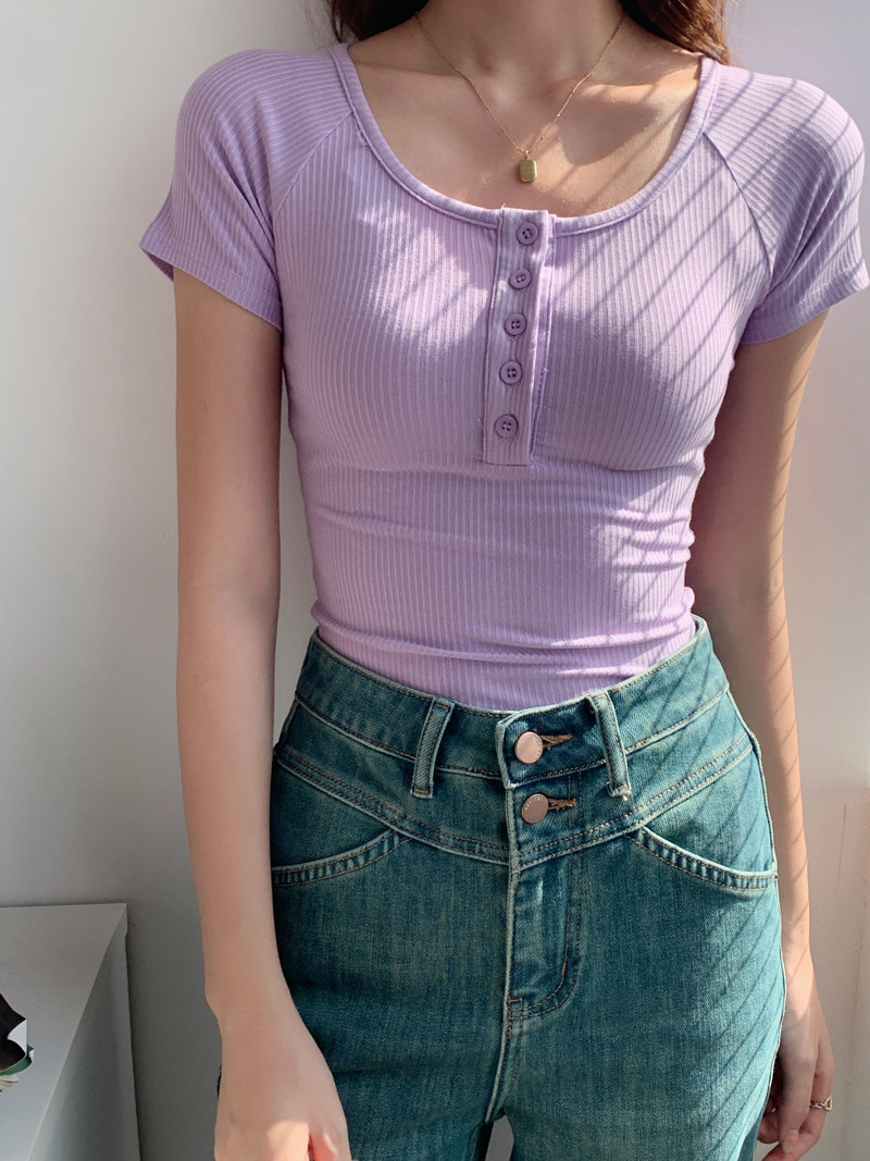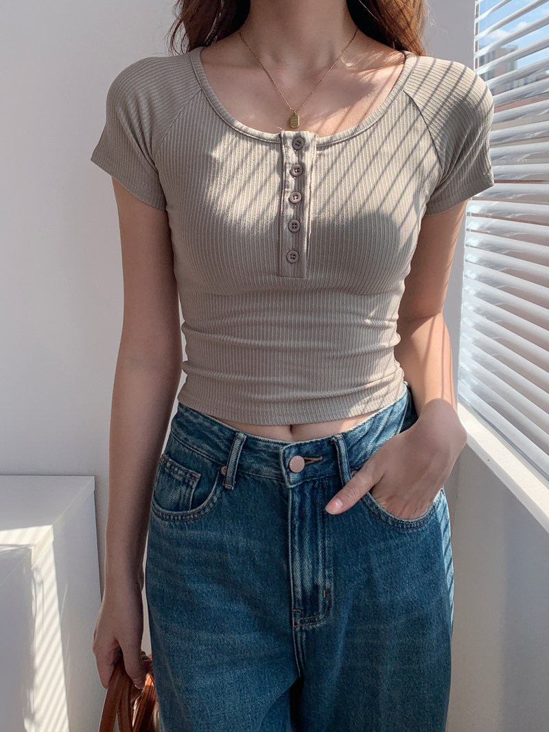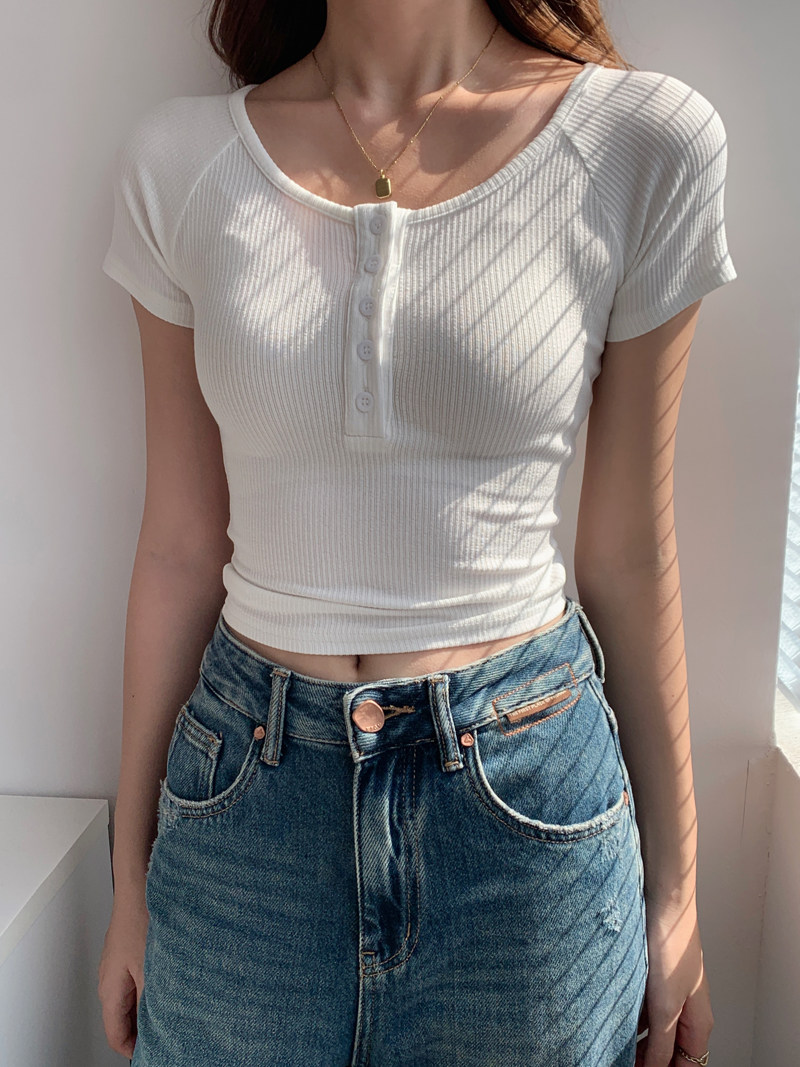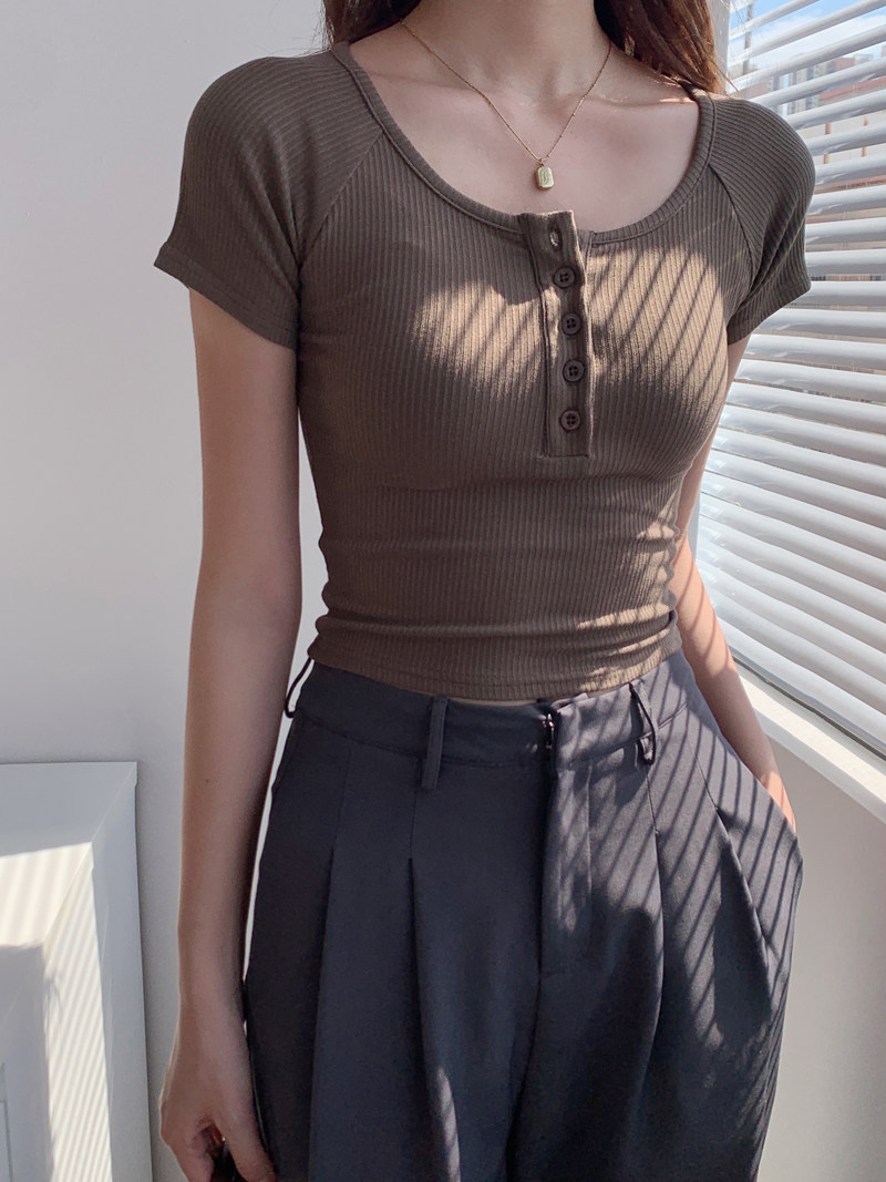 純欲風高腰圓領短款百搭修身打底單排釦性感緊身顯瘦短袖T恤上衣