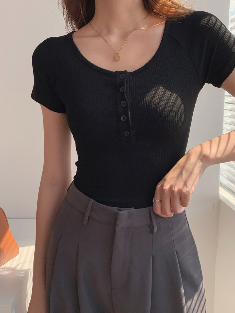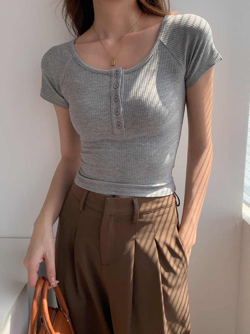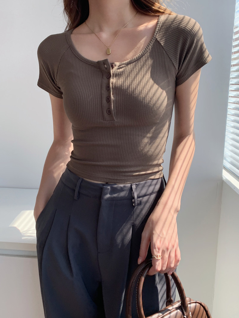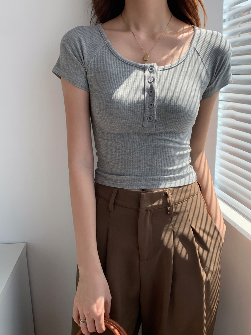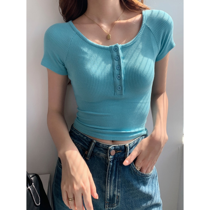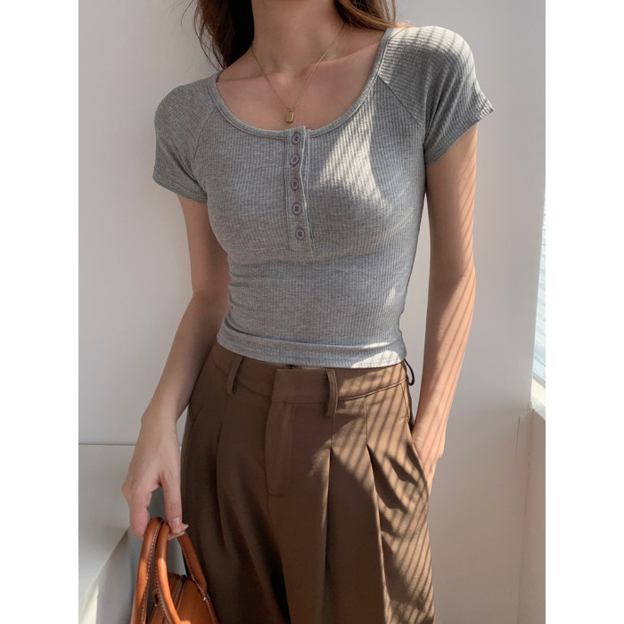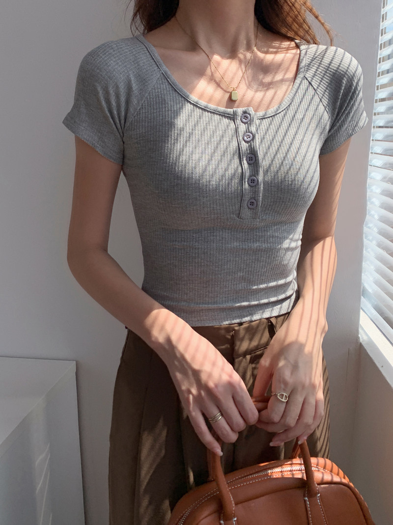 純欲風高腰圓領短款百搭修身打底單排釦性感緊身顯瘦短袖T恤上衣