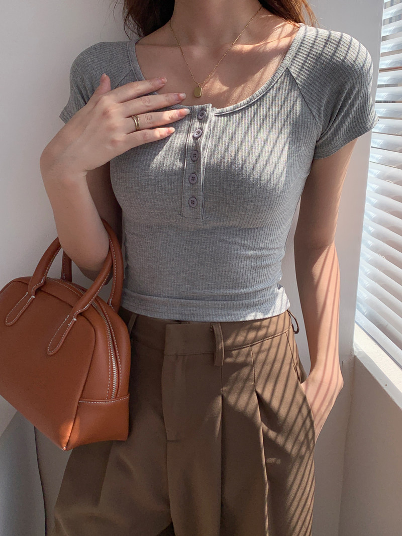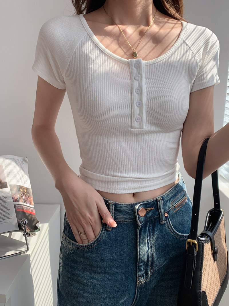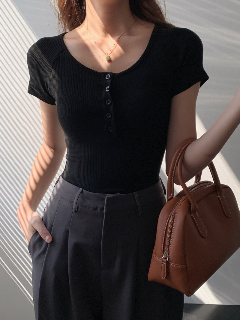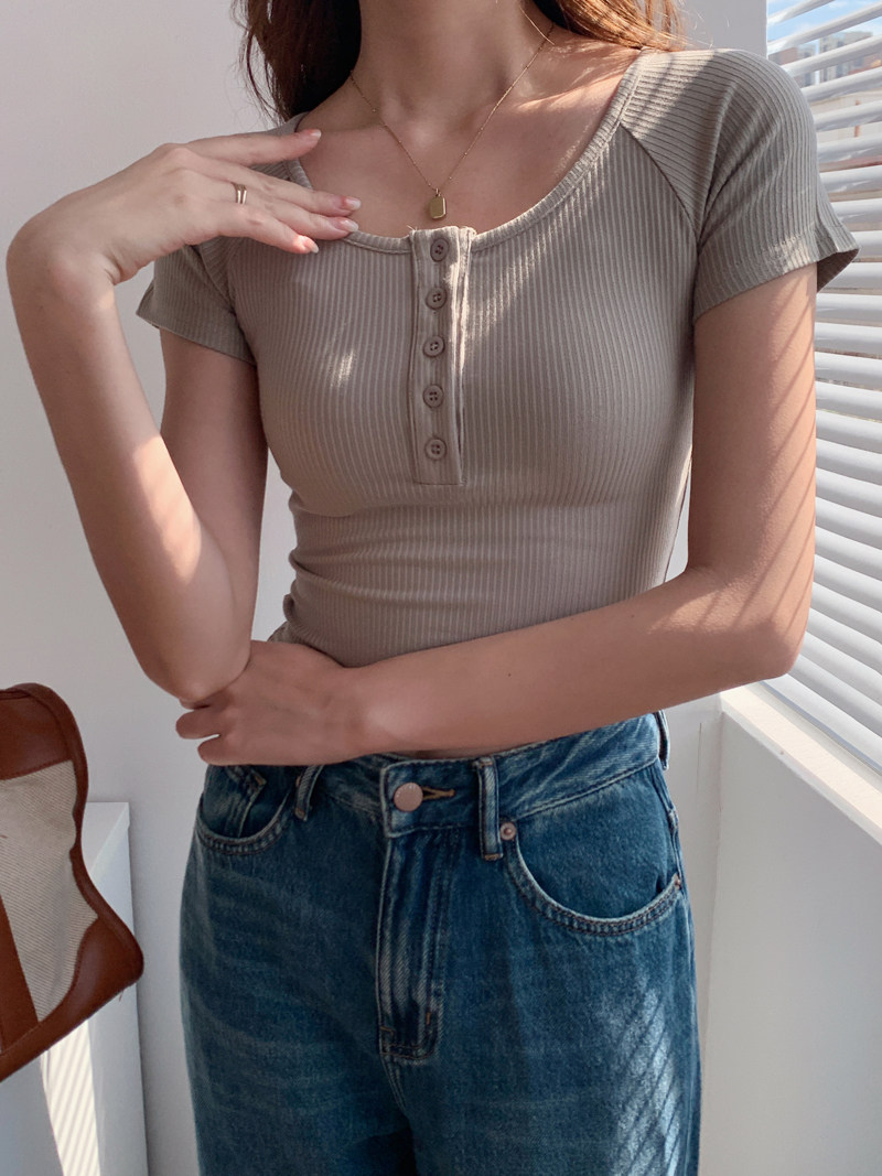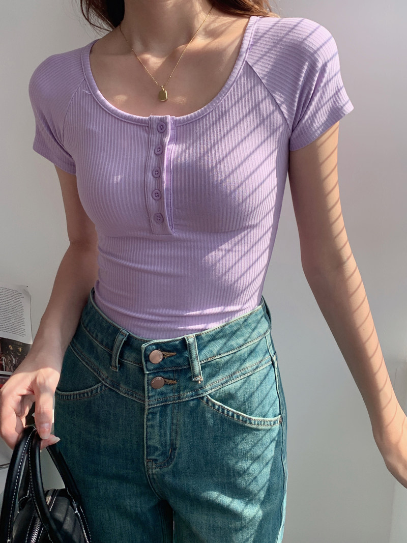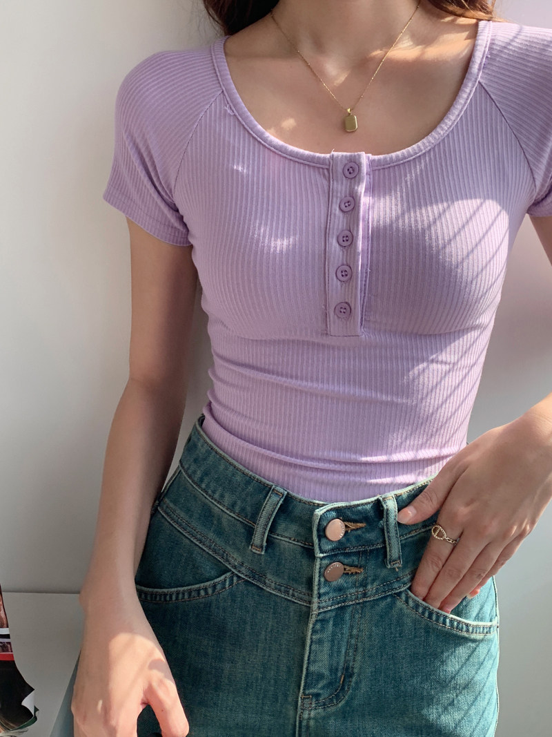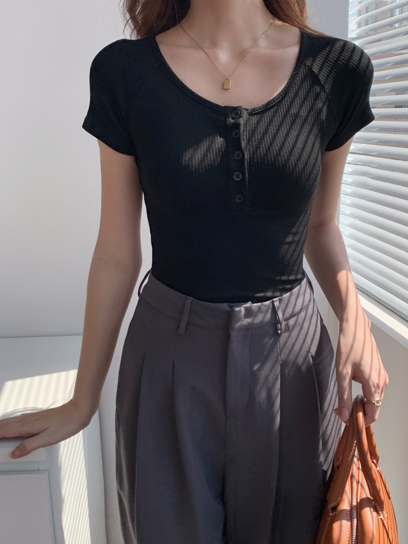 純欲風高腰圓領短款百搭修身打底單排釦性感緊身顯瘦短袖T恤上衣