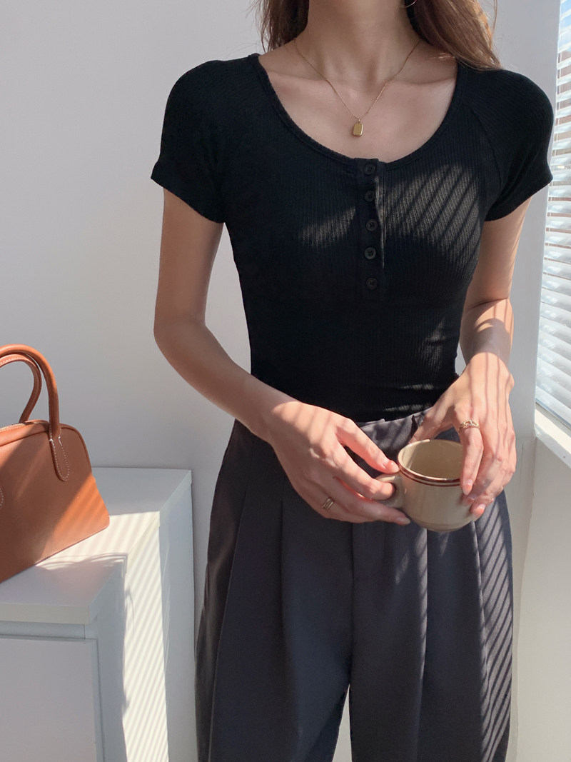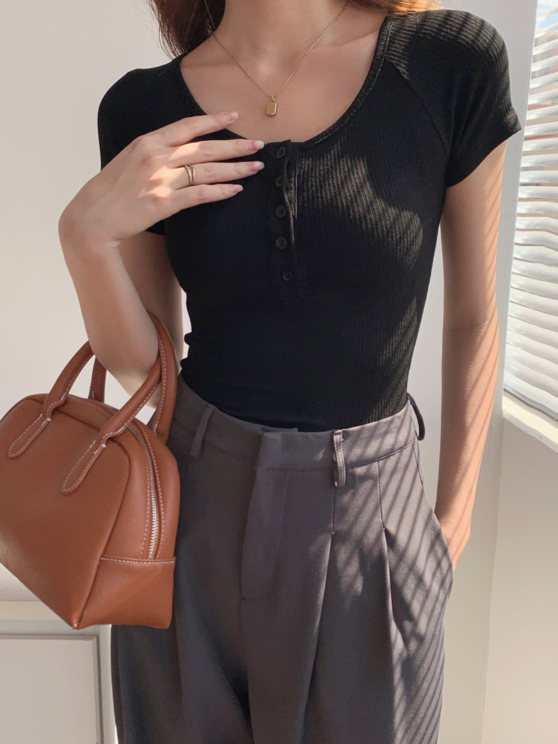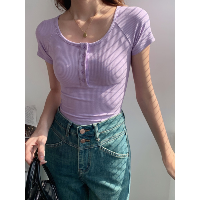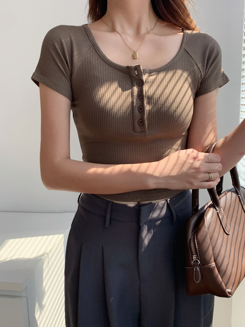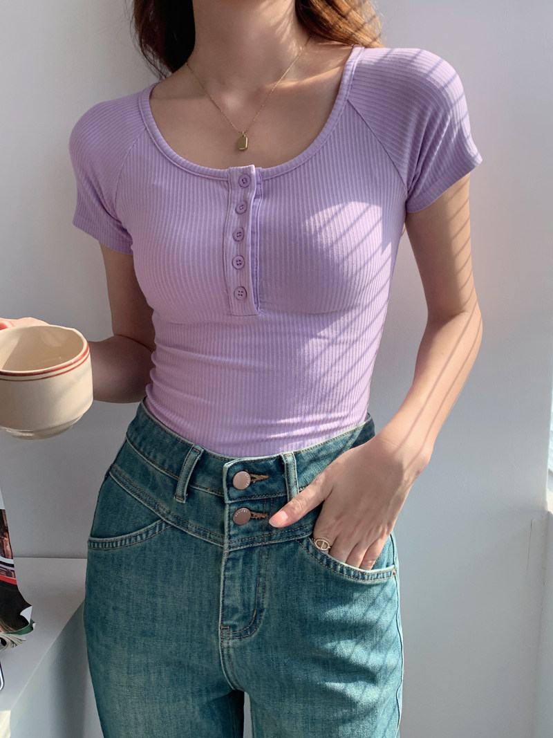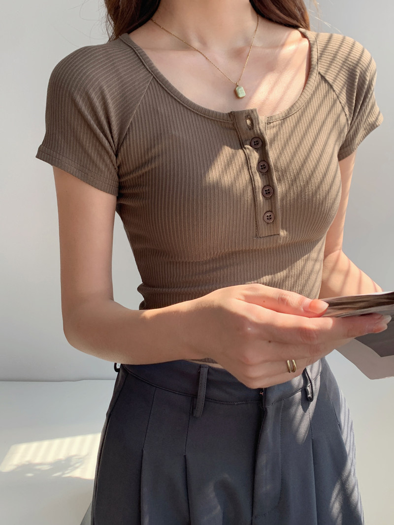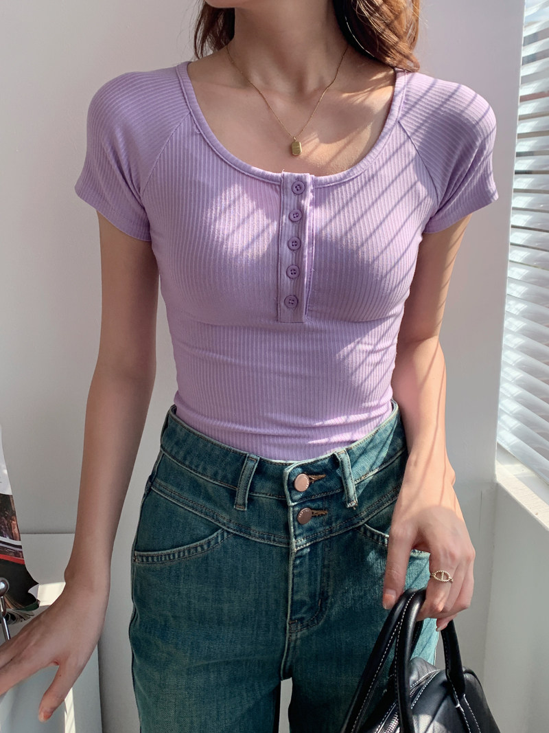 純欲風高腰圓領短款百搭修身打底單排釦性感緊身顯瘦短袖T恤上衣