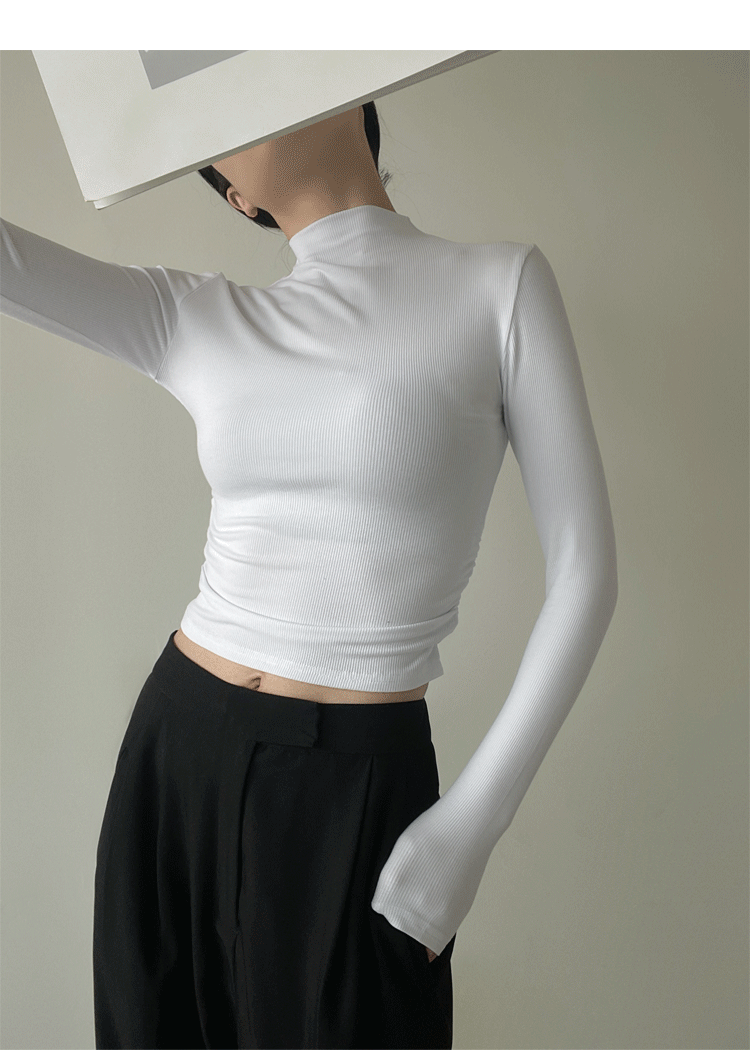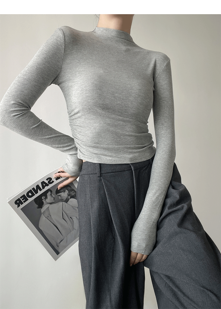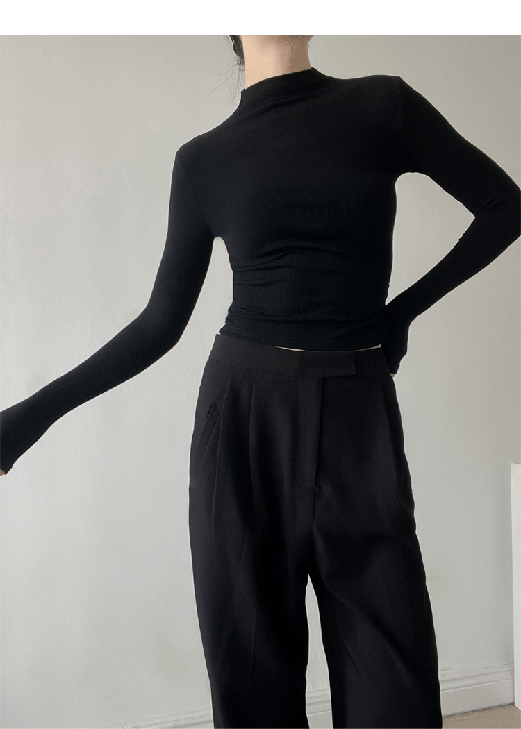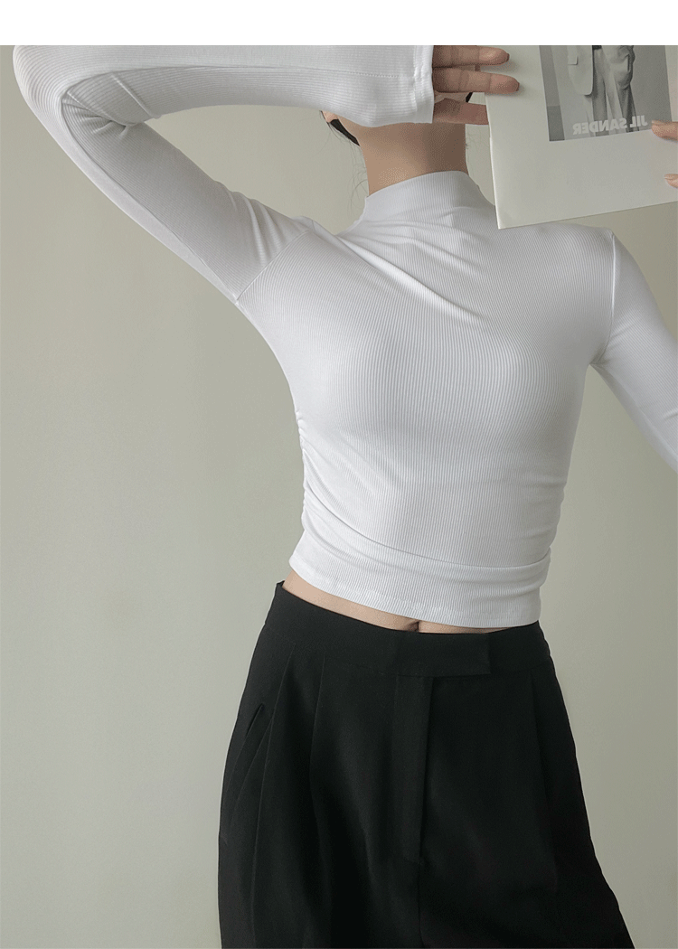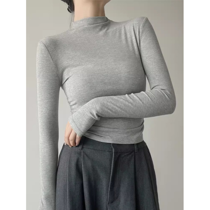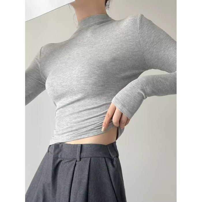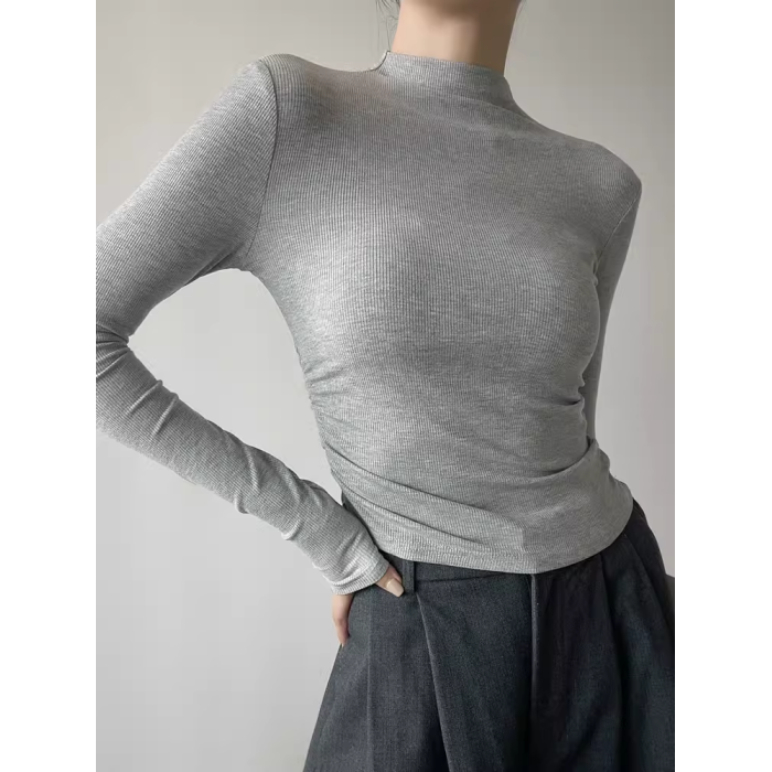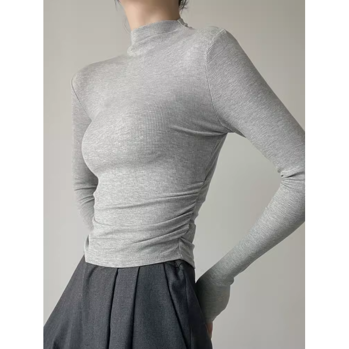 港味chic半高領打底衫冬長袖T恤女春秋修身短款褶皺獨特別致上衣