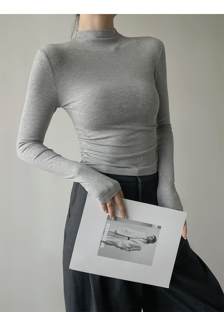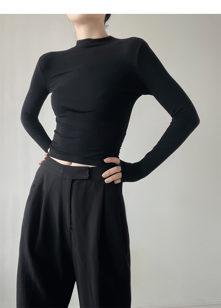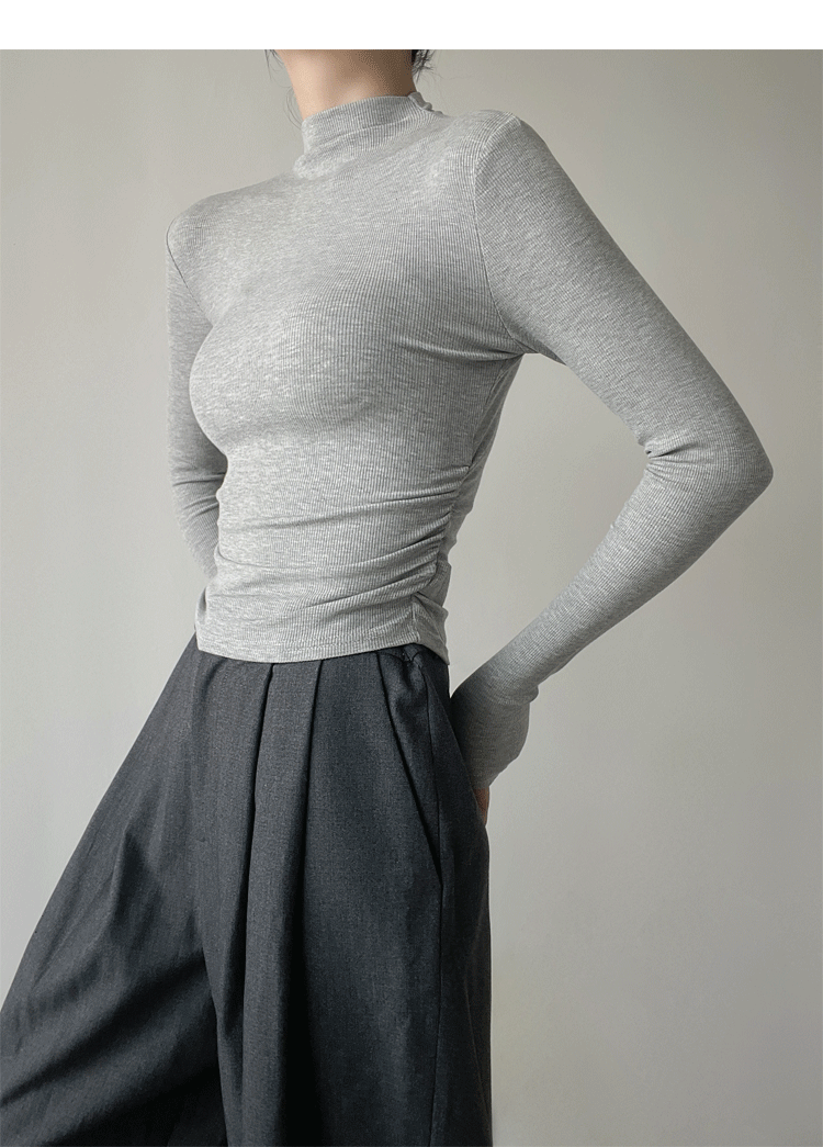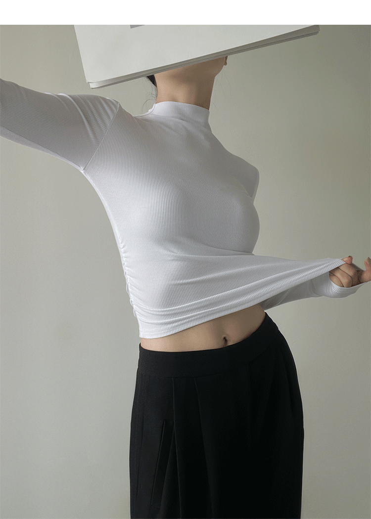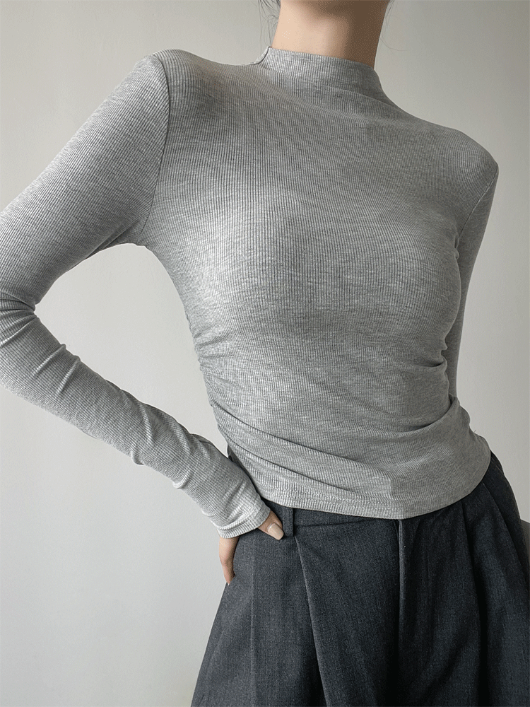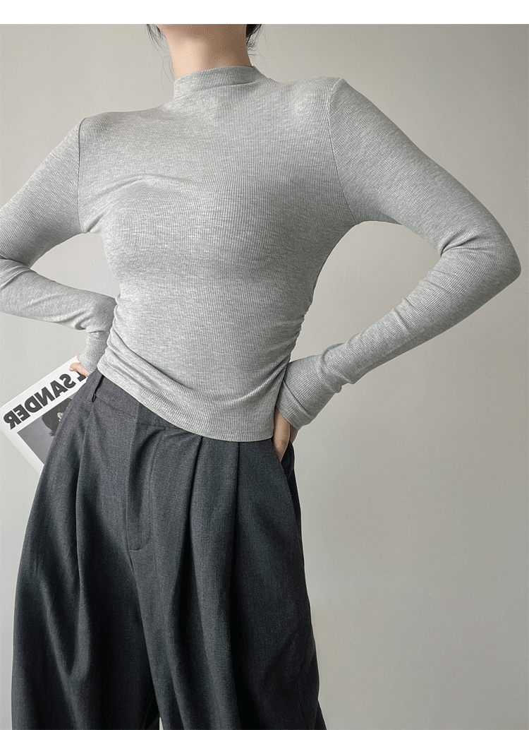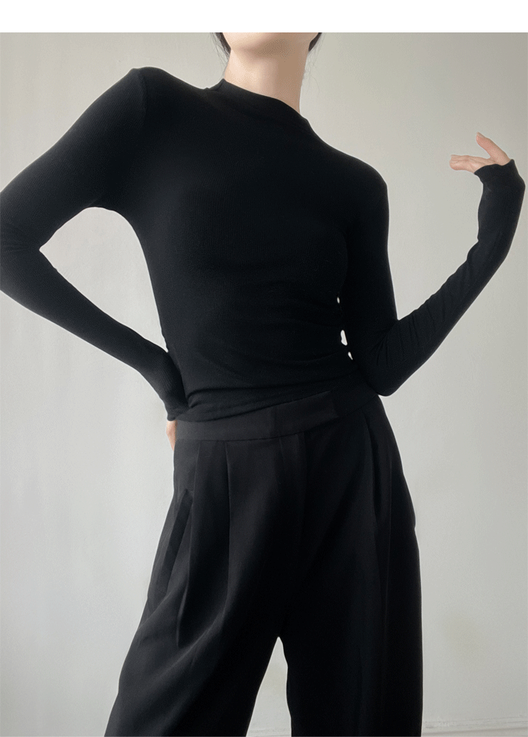 港味chic半高領打底衫冬長袖T恤女春秋修身短款褶皺獨特別致上衣