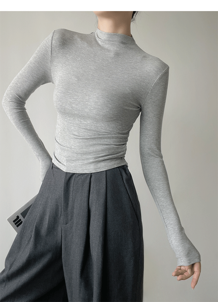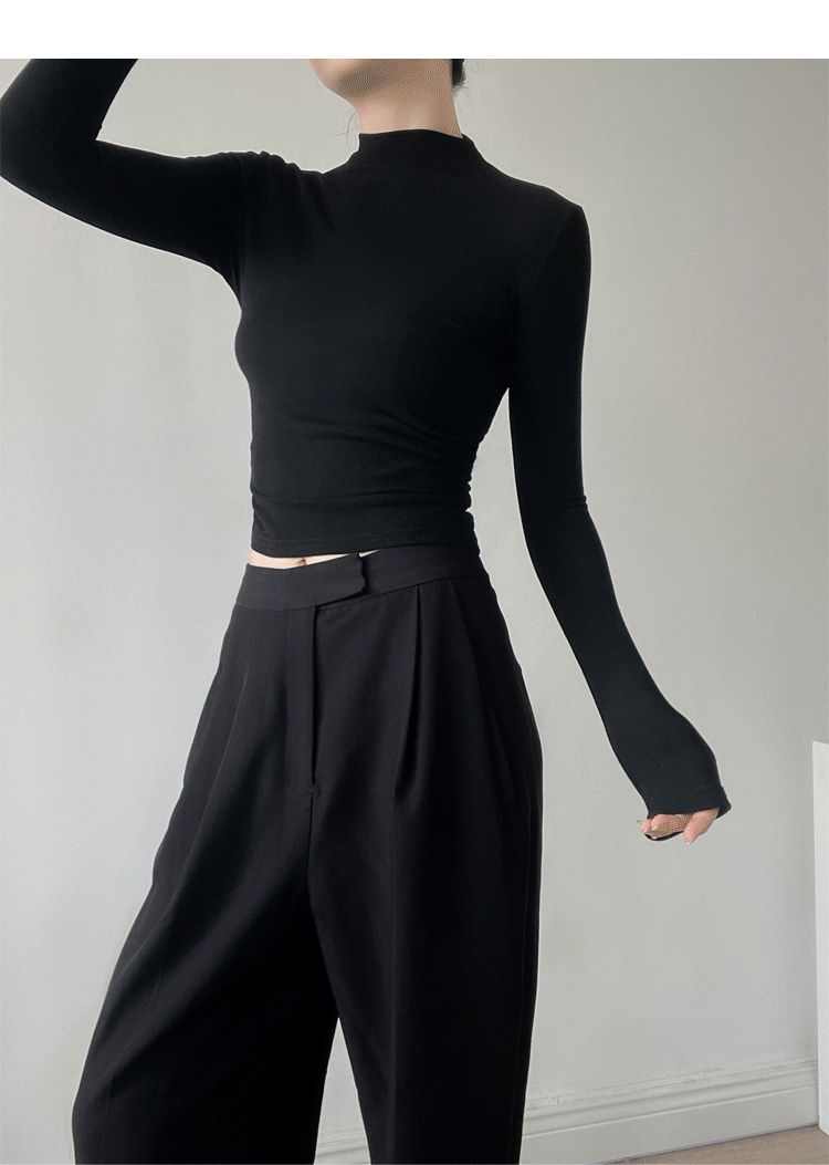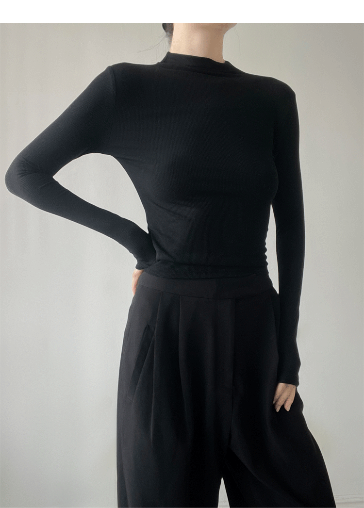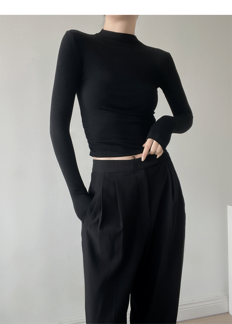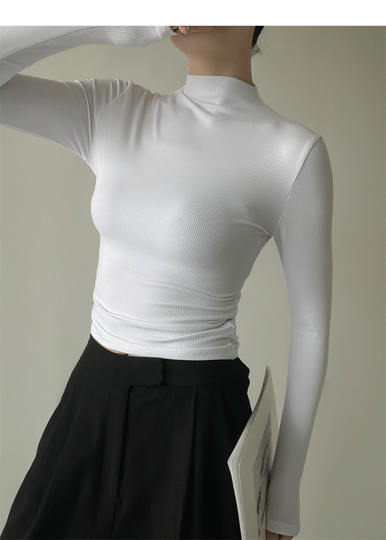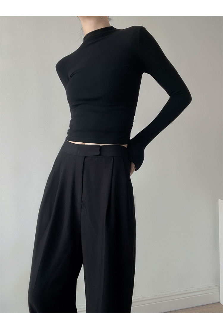港味chic半高領打底衫冬長袖T恤女春秋修身短款褶皺獨特別致上衣