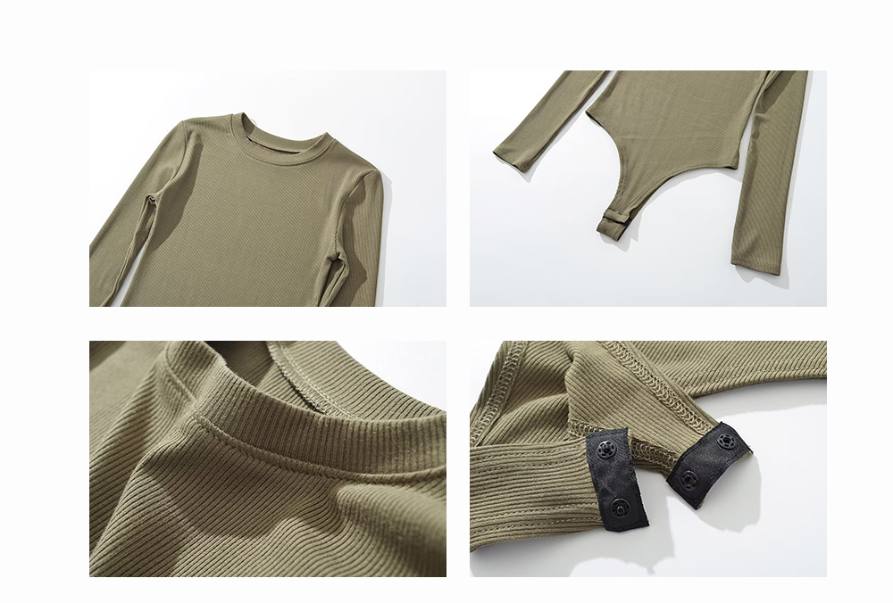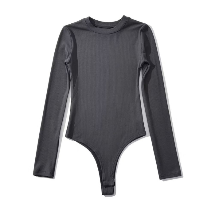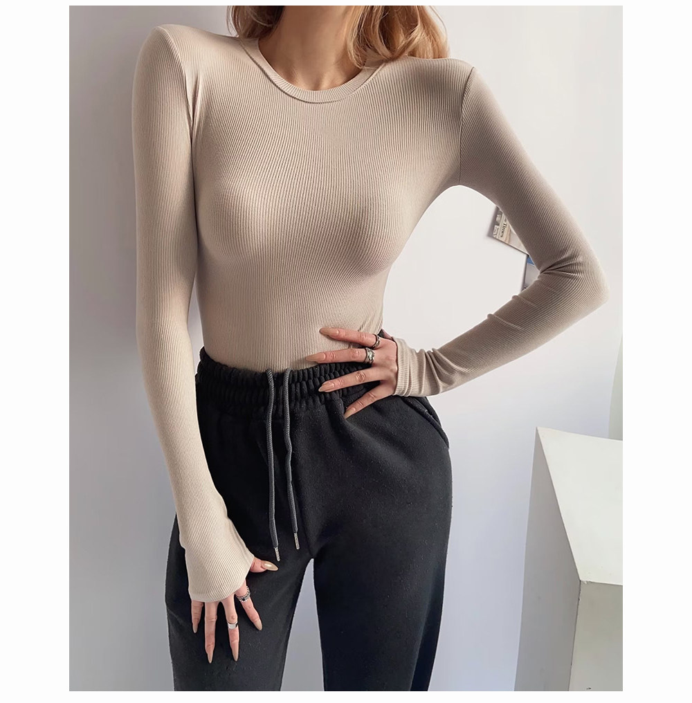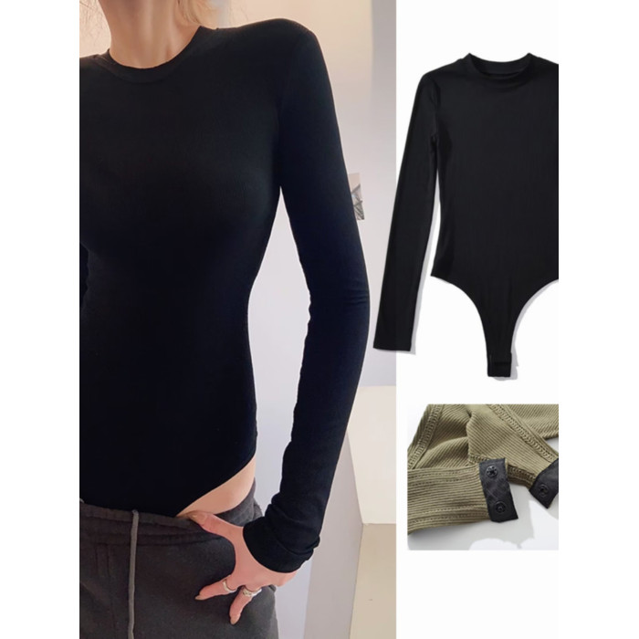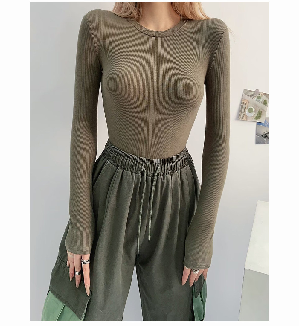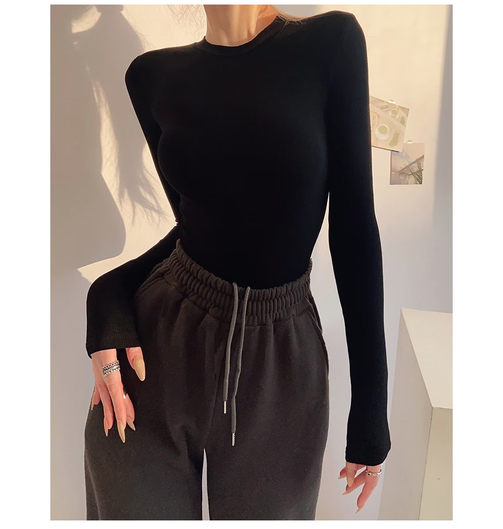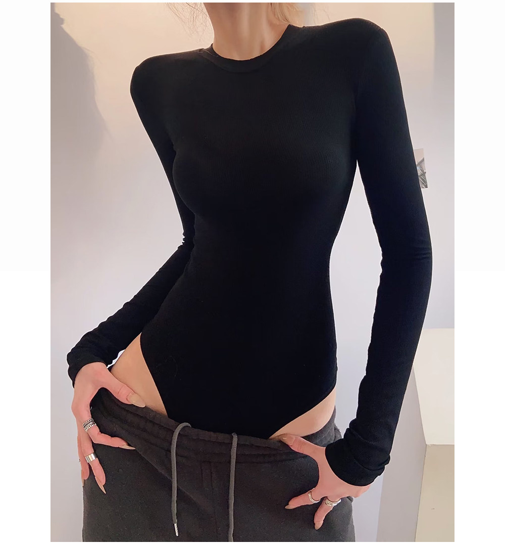圓領長袖連體打底衫ins上衣2023春螺紋彈力修身棉質連體連檔T恤