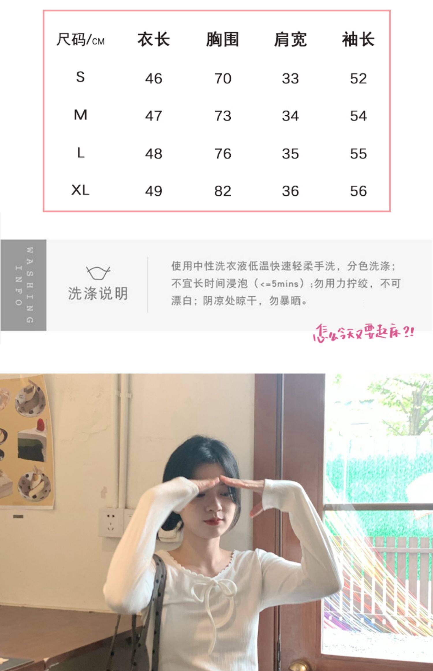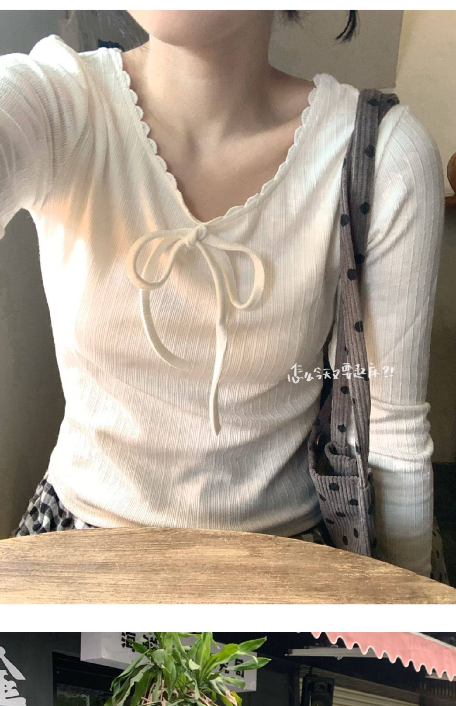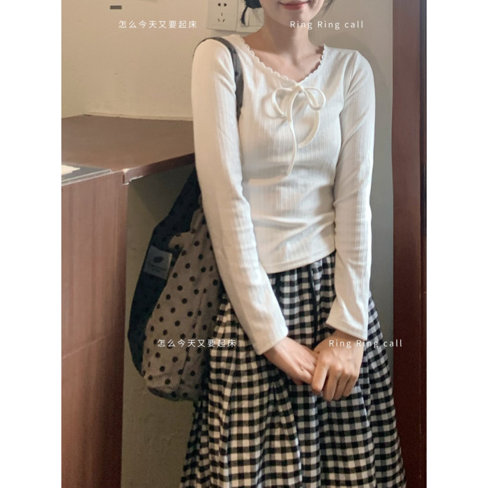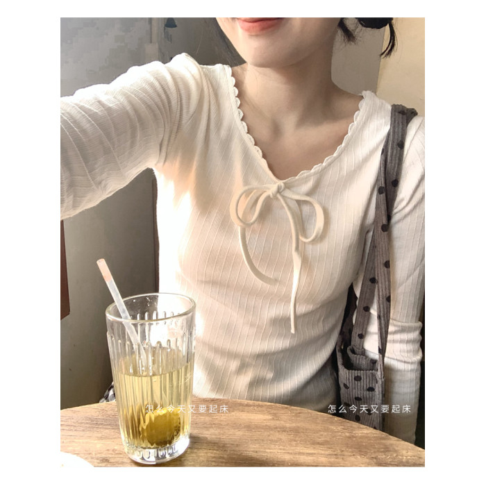 ringring奶油芙白 蝴蝶結修身打底軟糯內搭貝殼邊長袖T恤百搭上衣