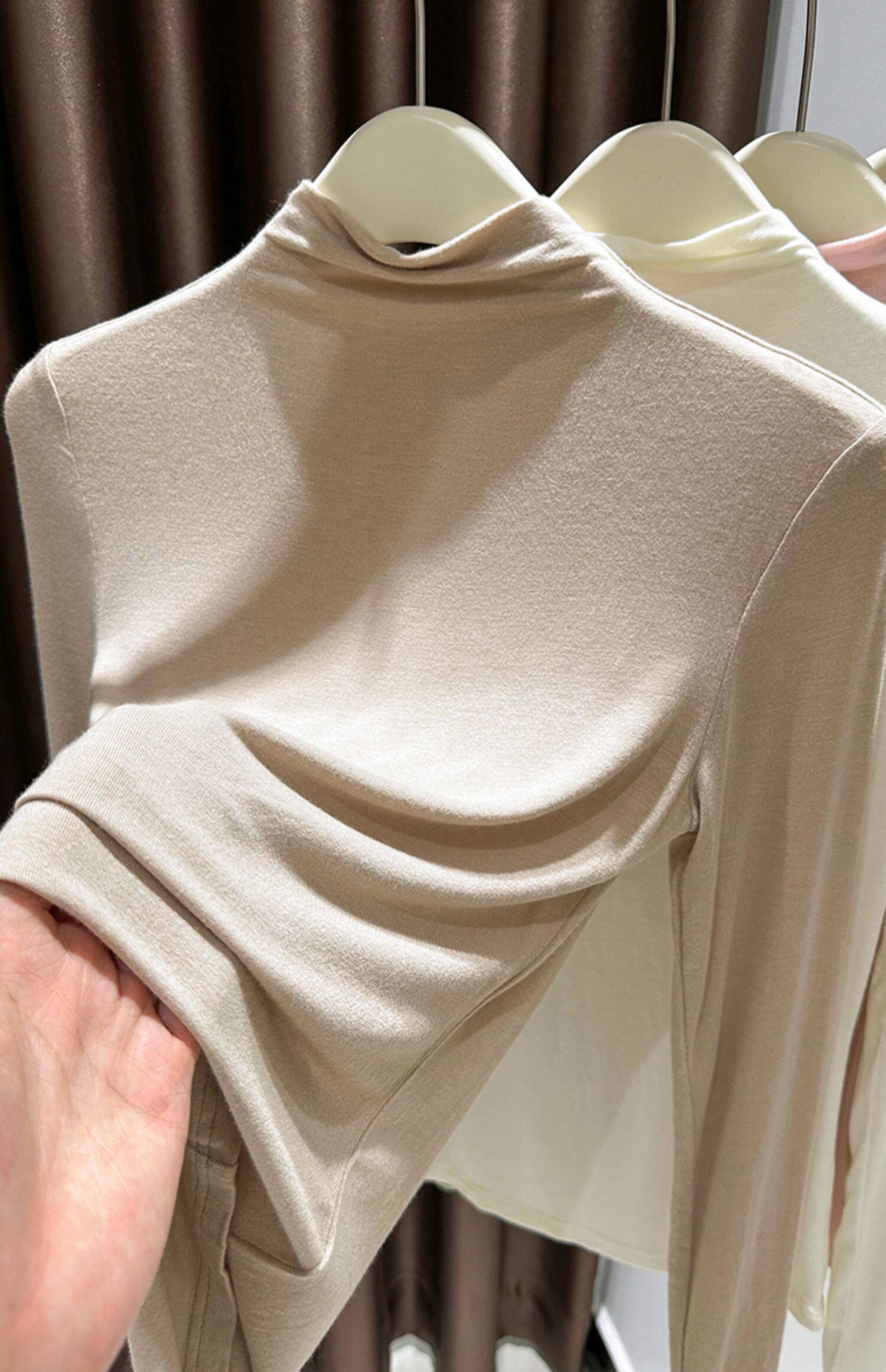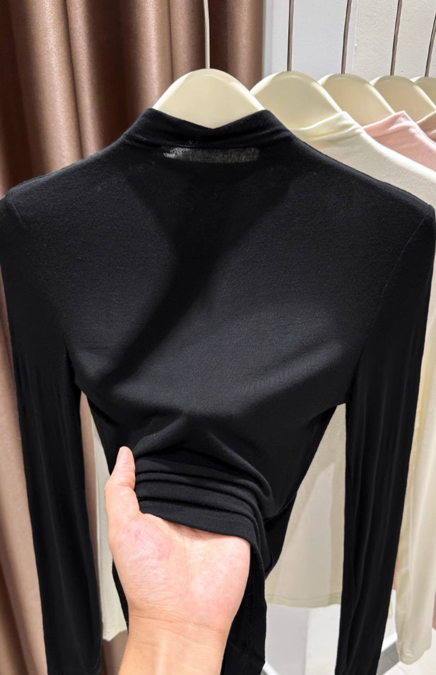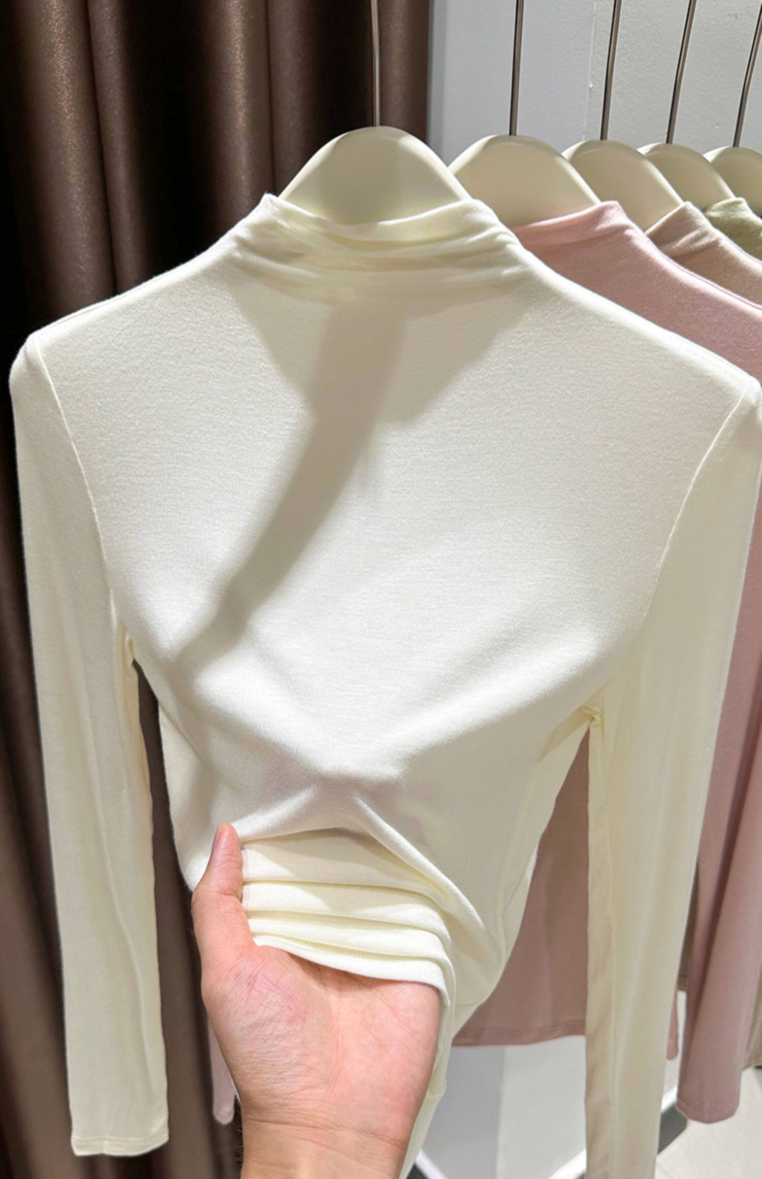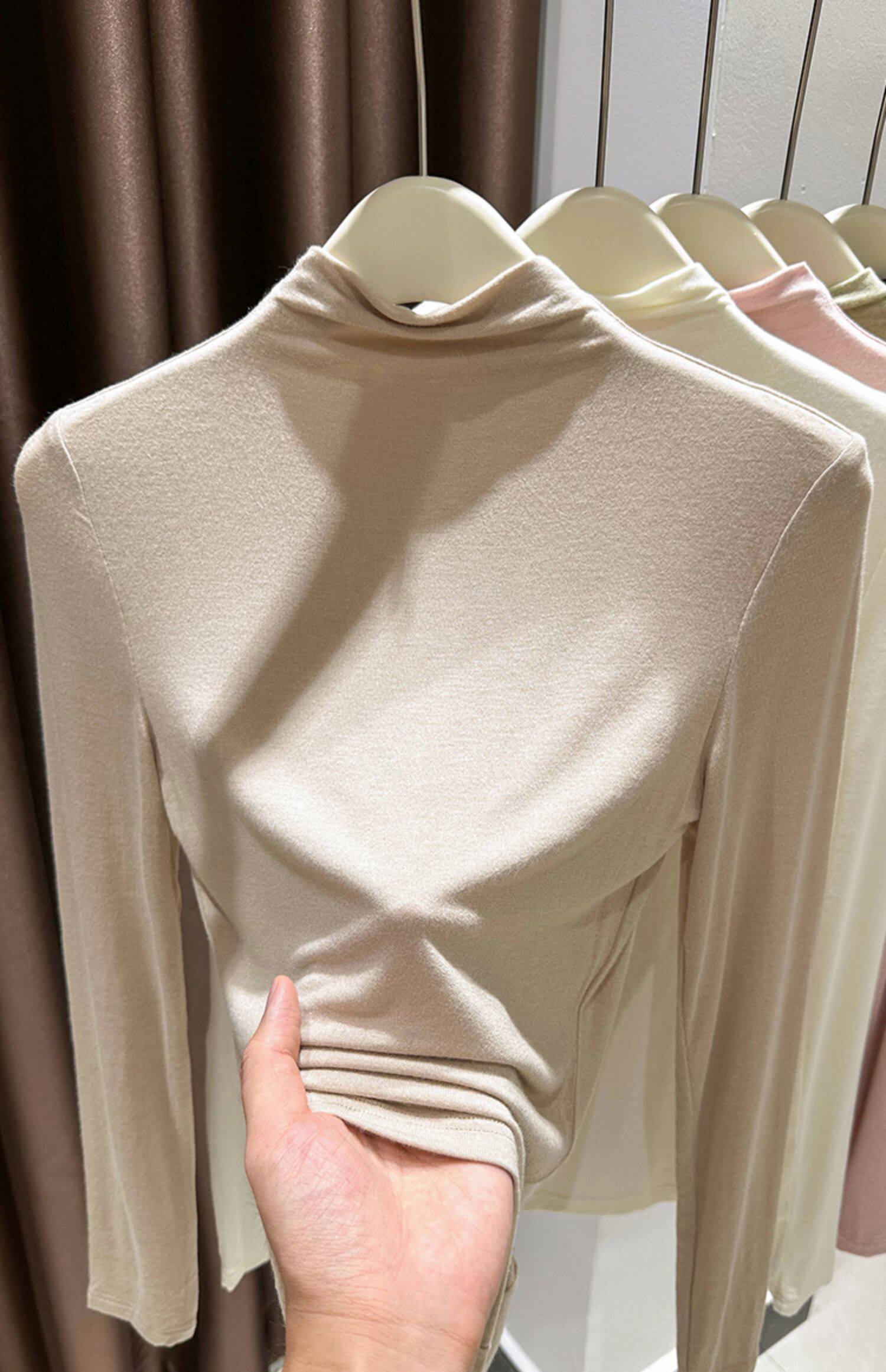 杏色莫代爾半高領打底衫女秋冬季內搭基礎款超彈軟糯長袖t恤薄款