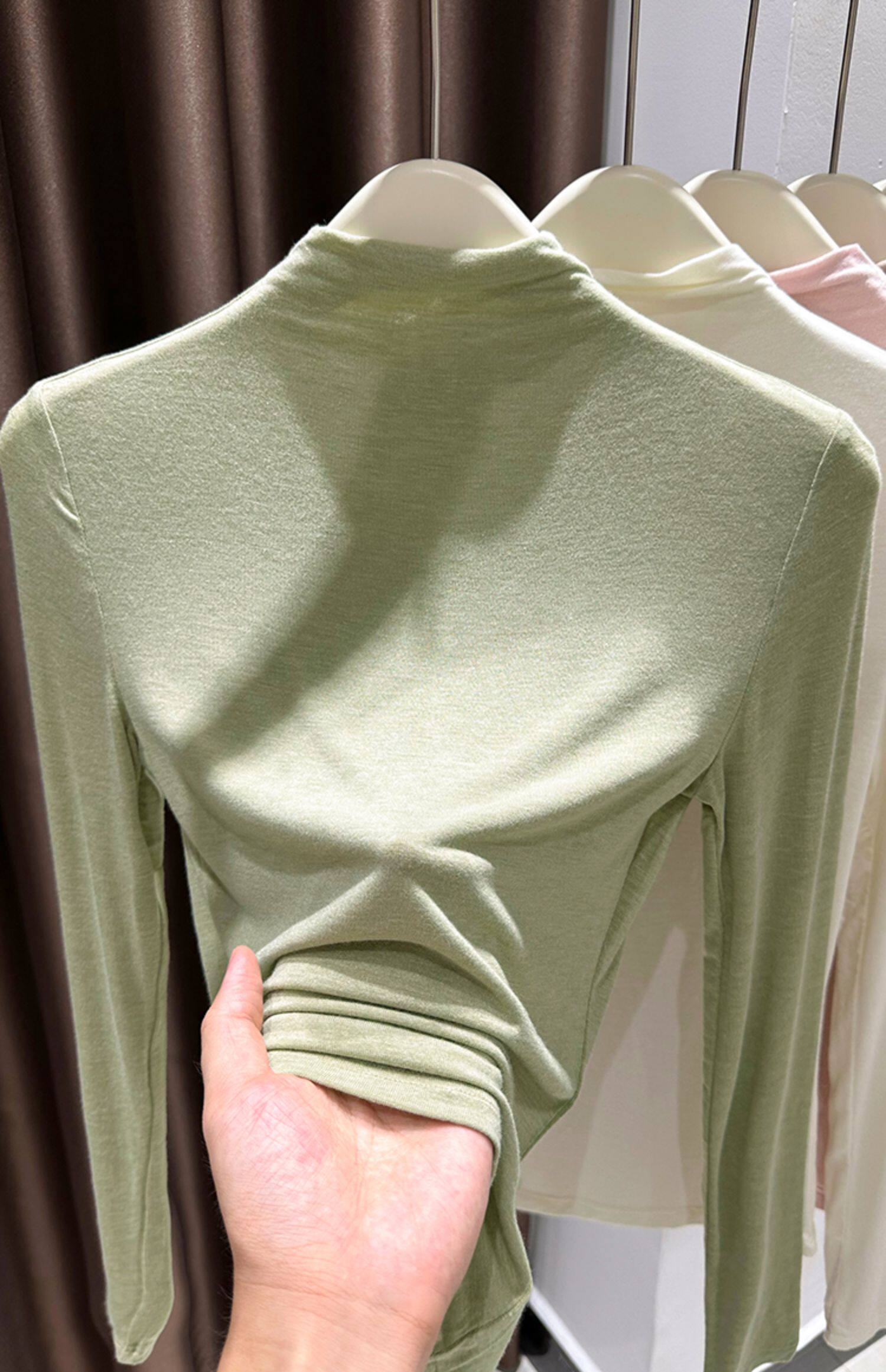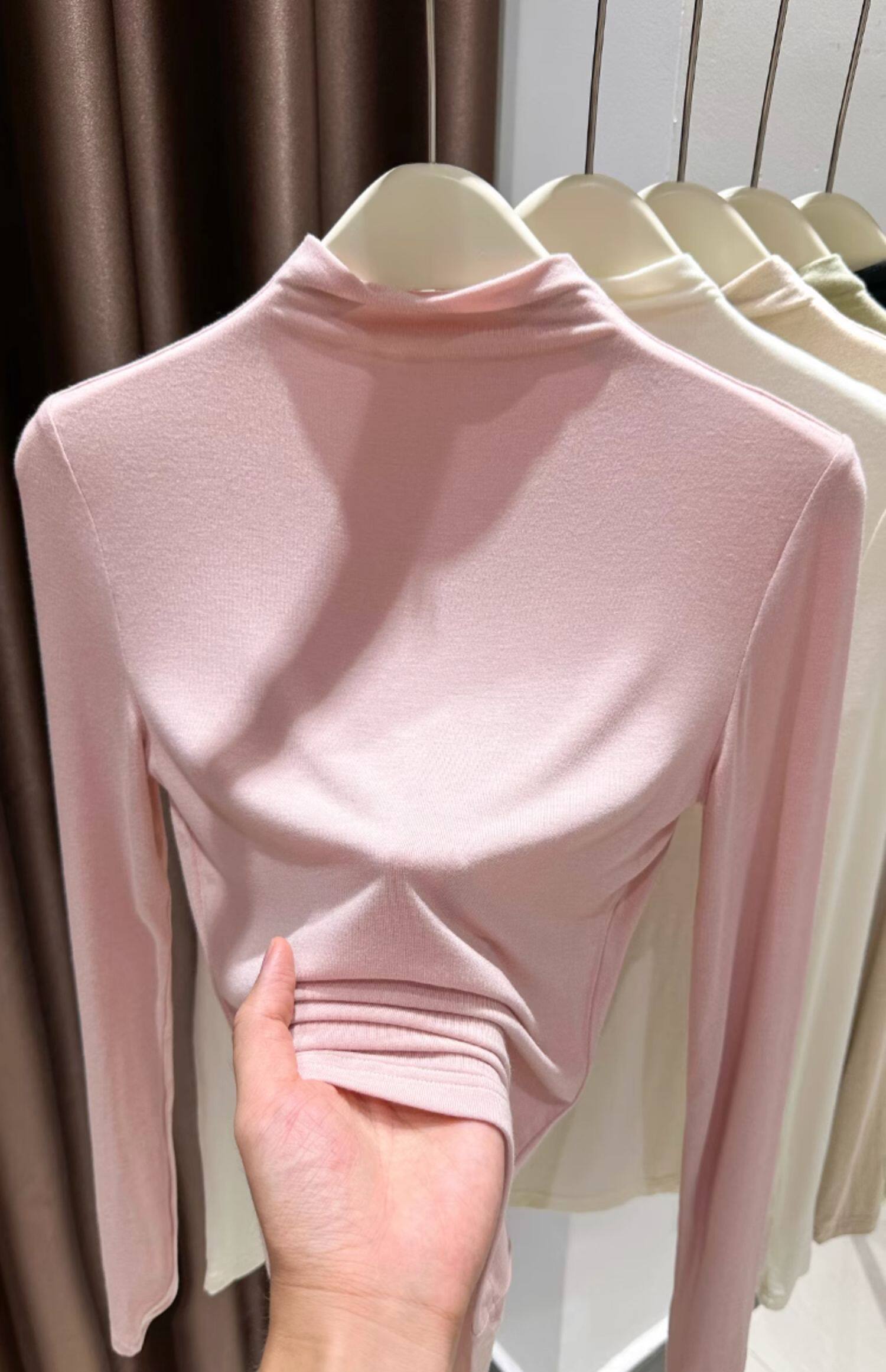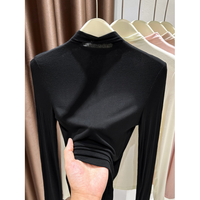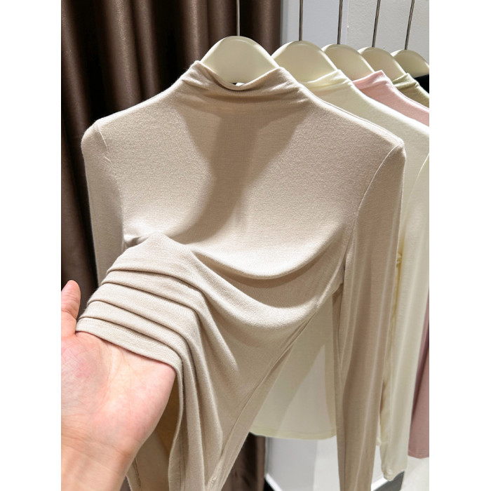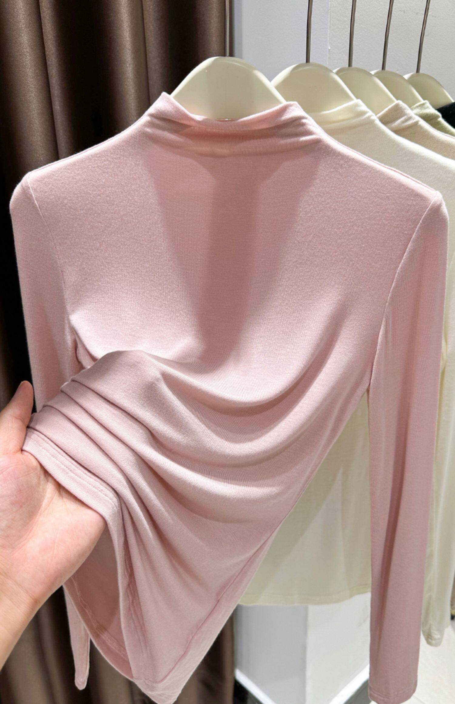 杏色莫代爾半高領打底衫女秋冬季內搭基礎款超彈軟糯長袖t恤薄款