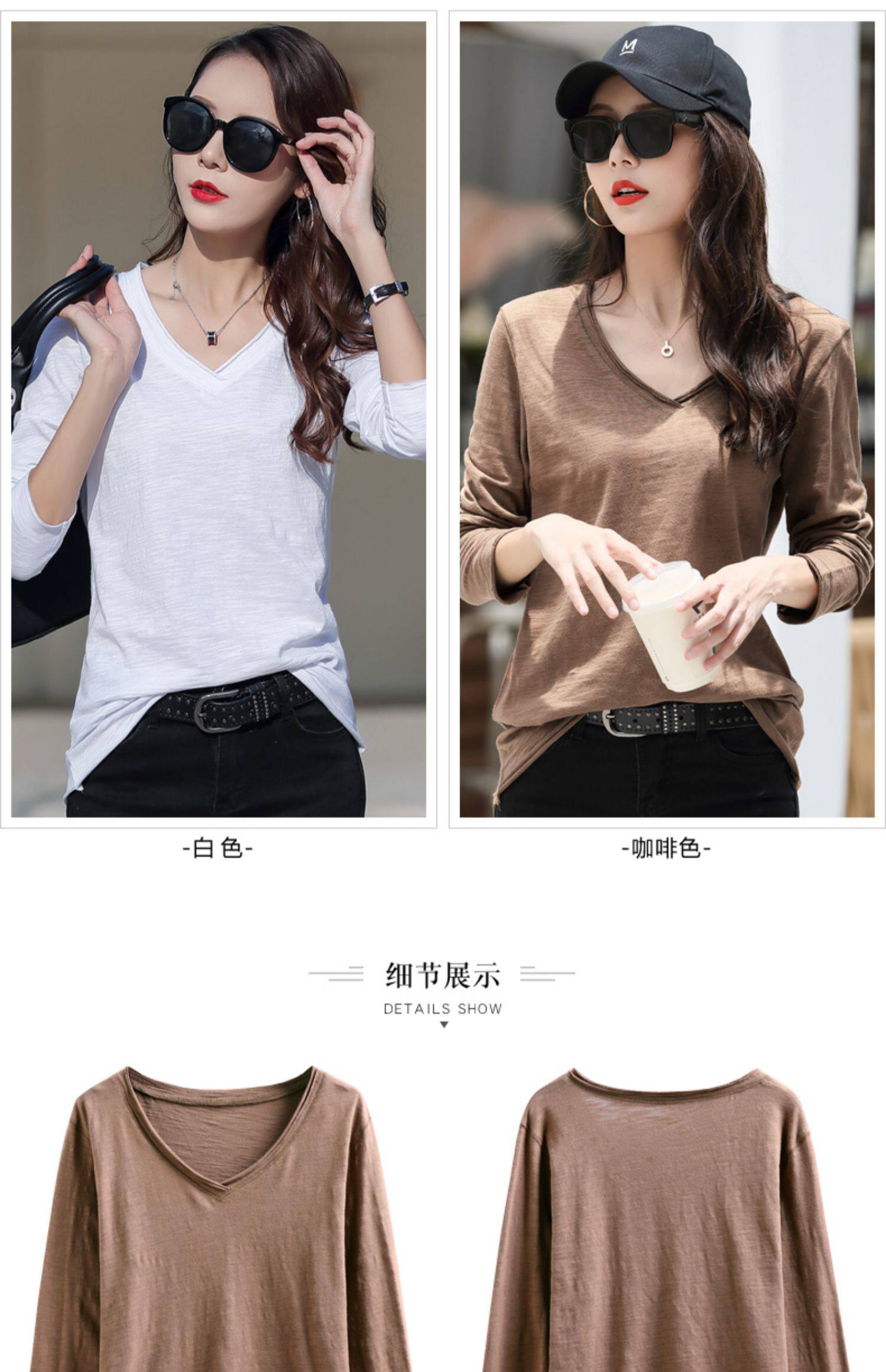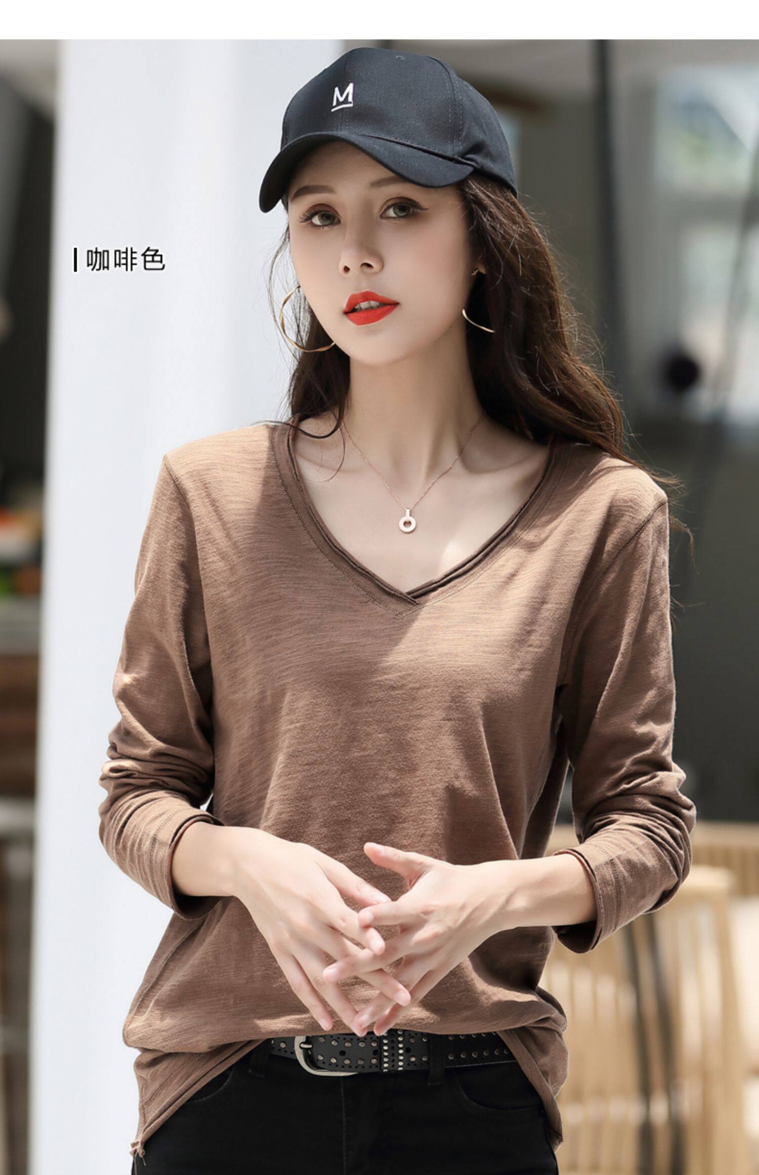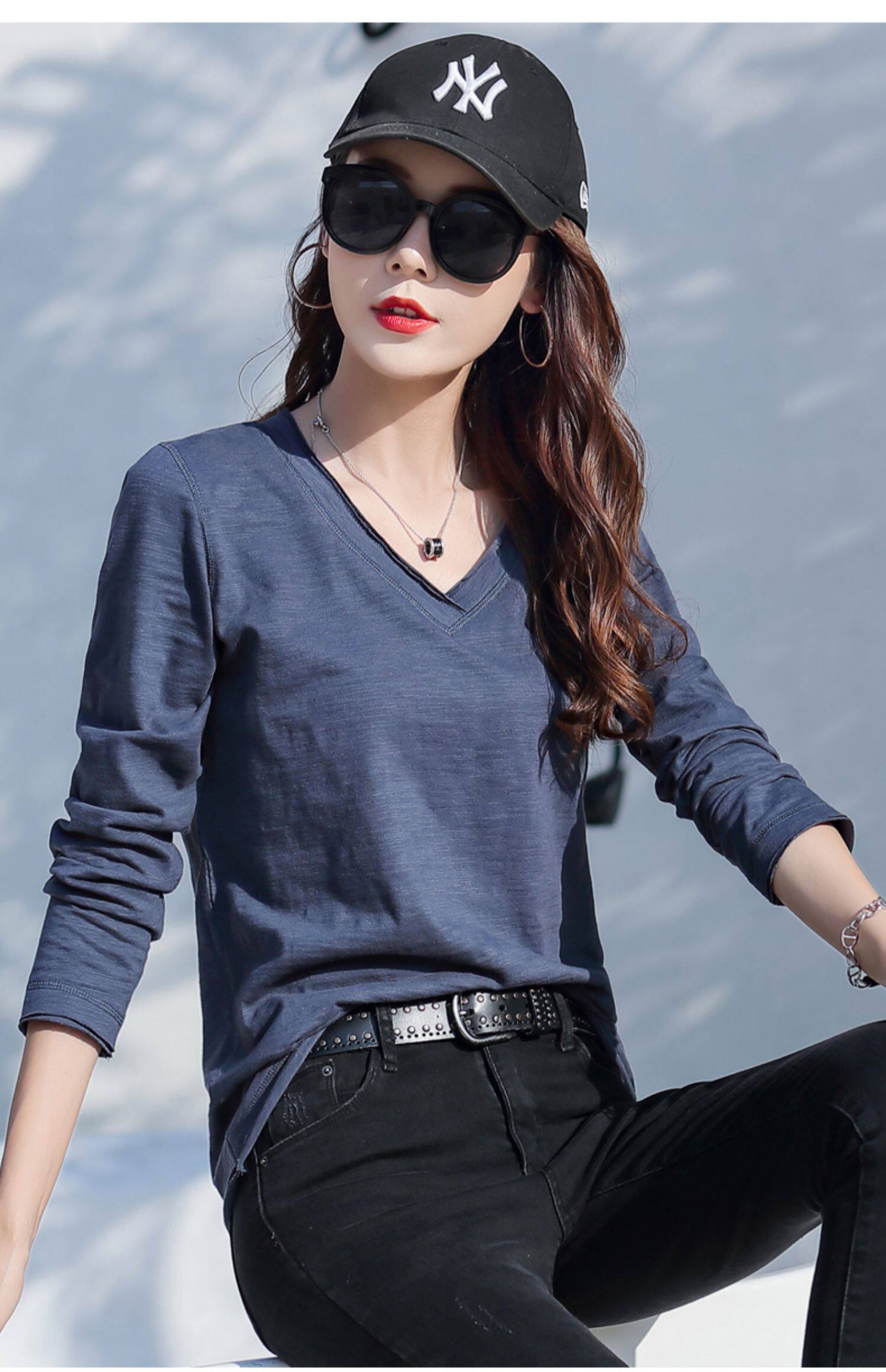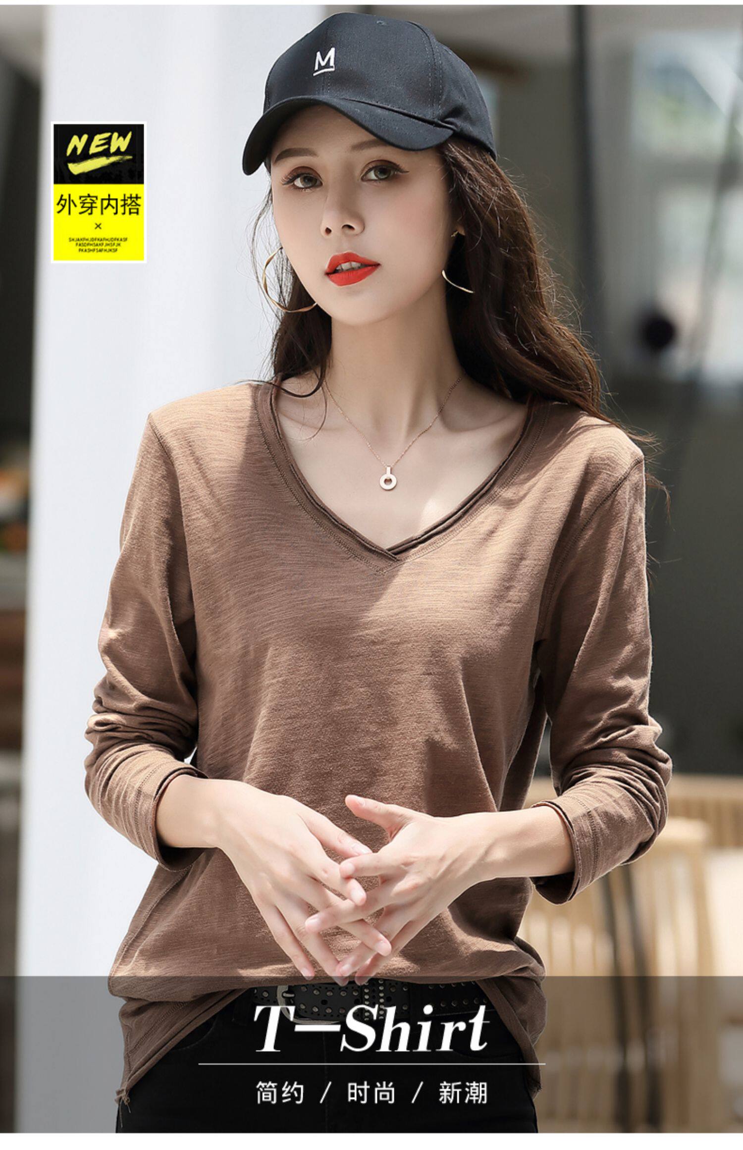 全棉長袖t恤女寬松秋裝2025新款竹節棉打底衫氣質v領女裝內搭上衣