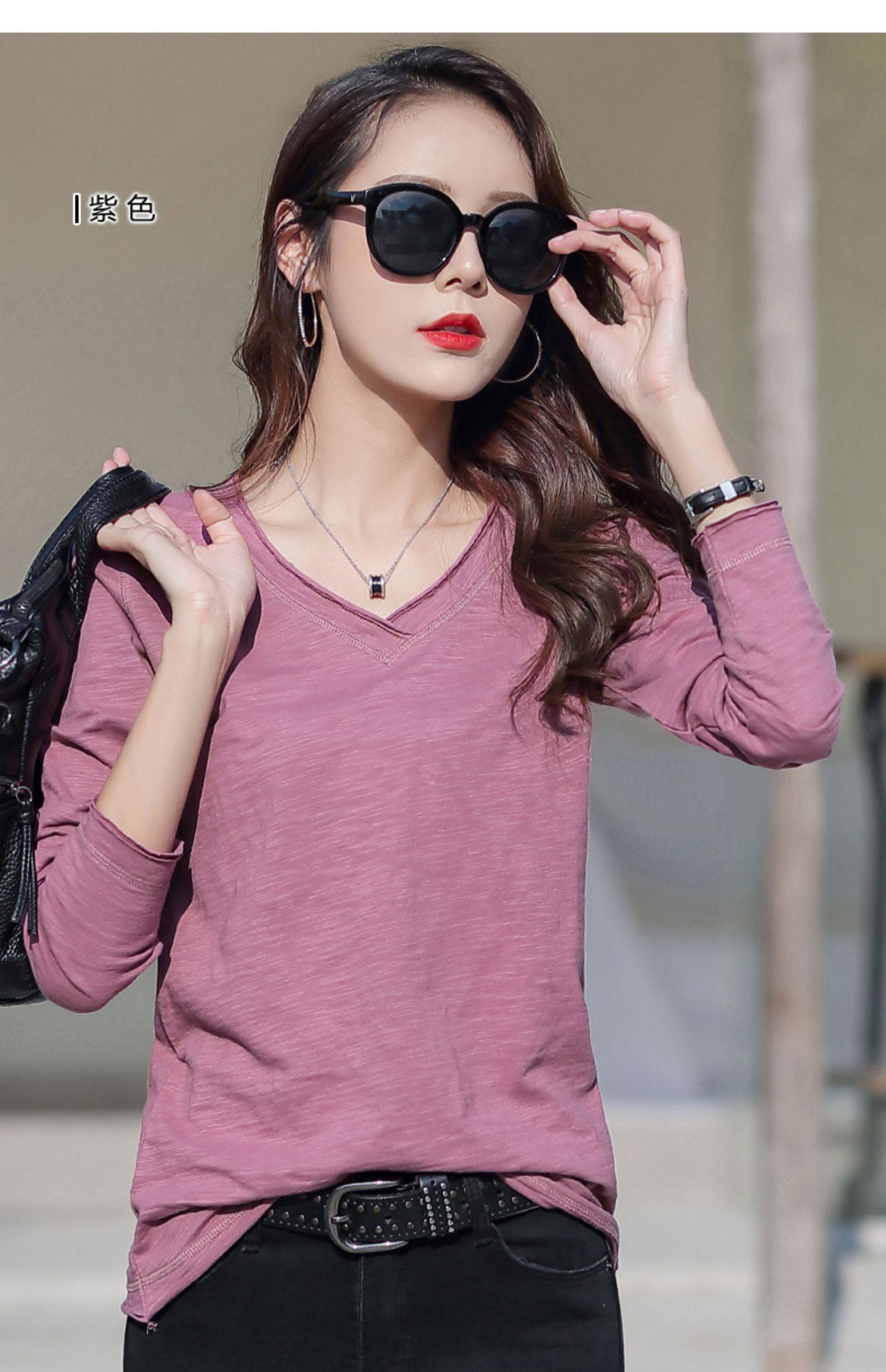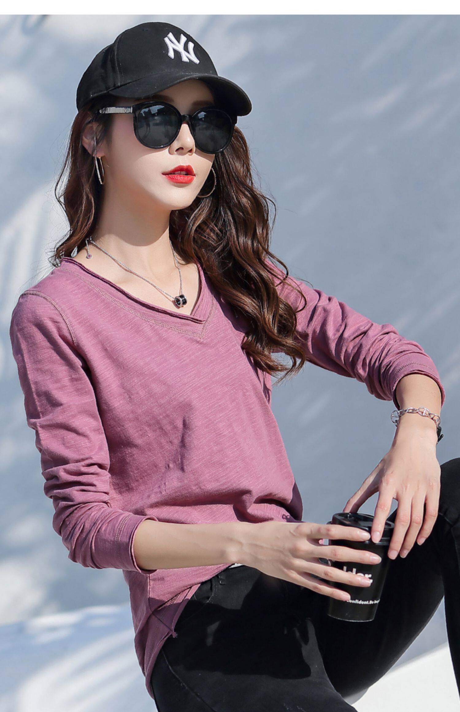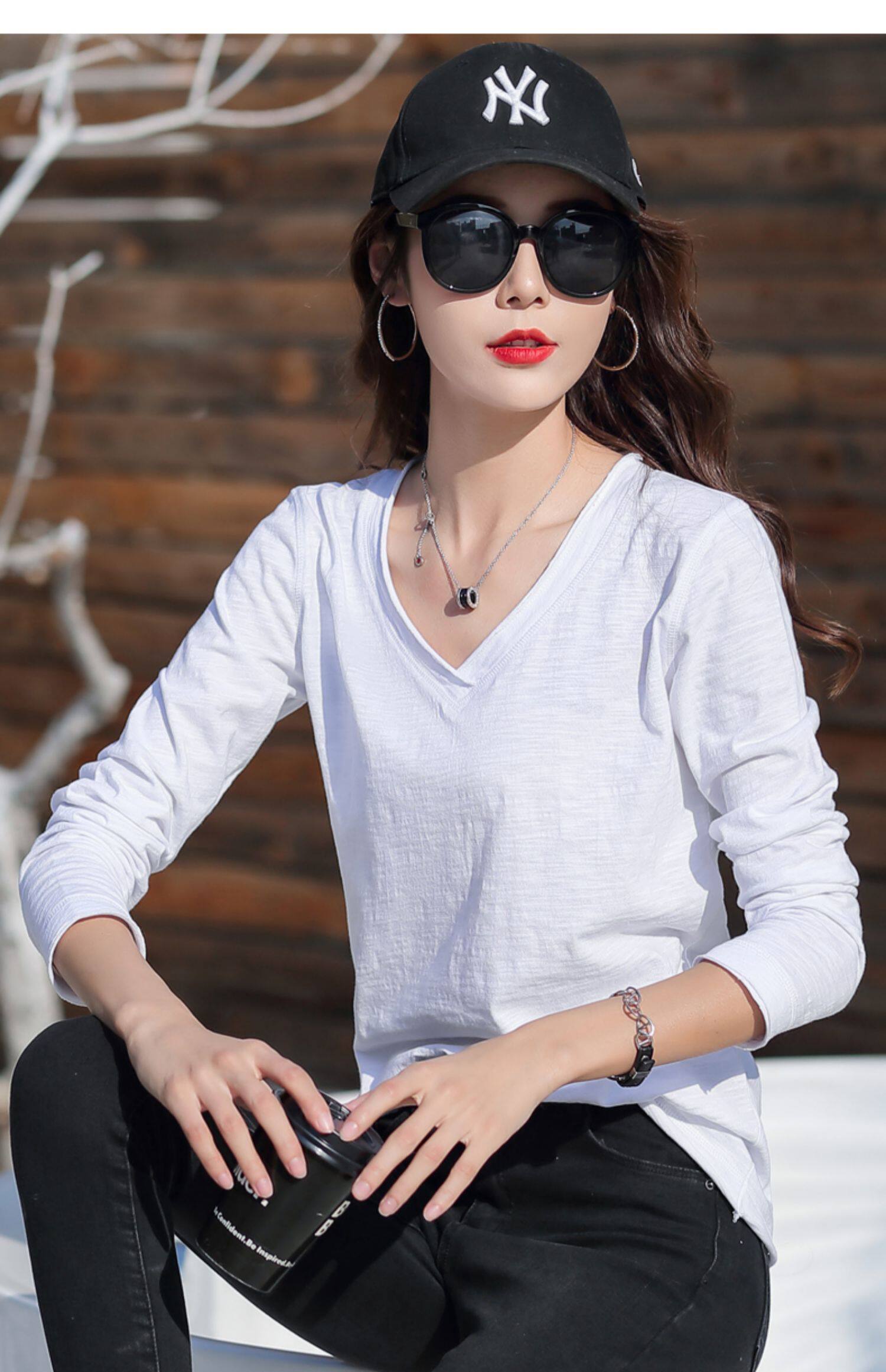 全棉長袖t恤女寬松秋裝2025新款竹節棉打底衫氣質v領女裝內搭上衣