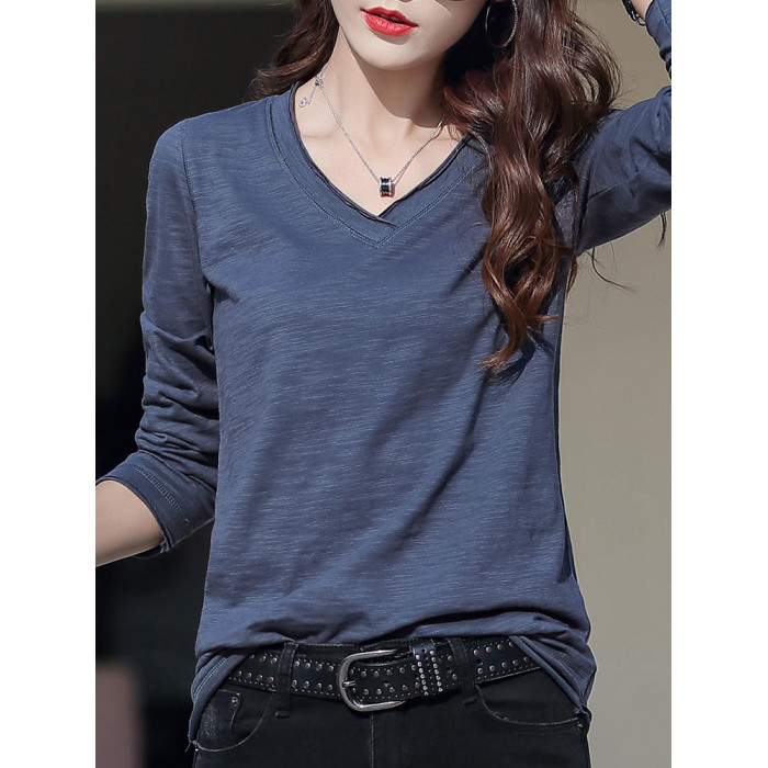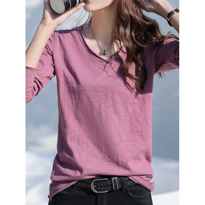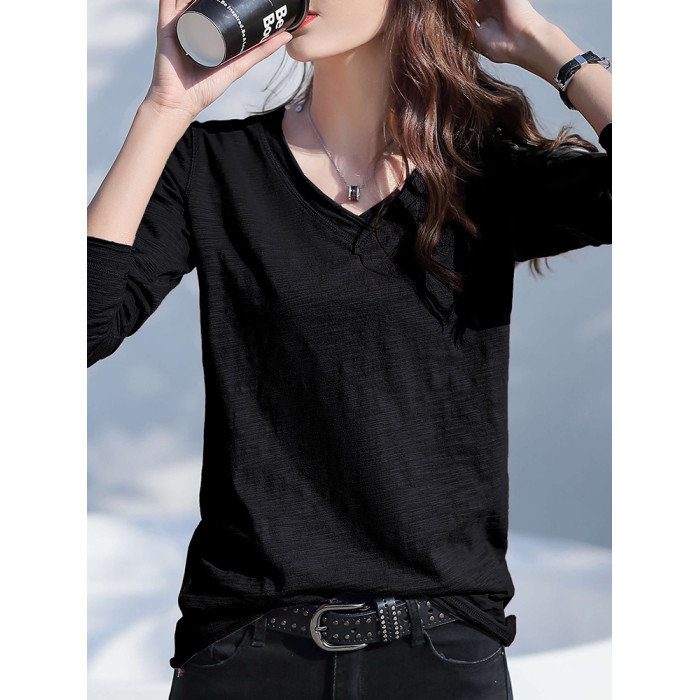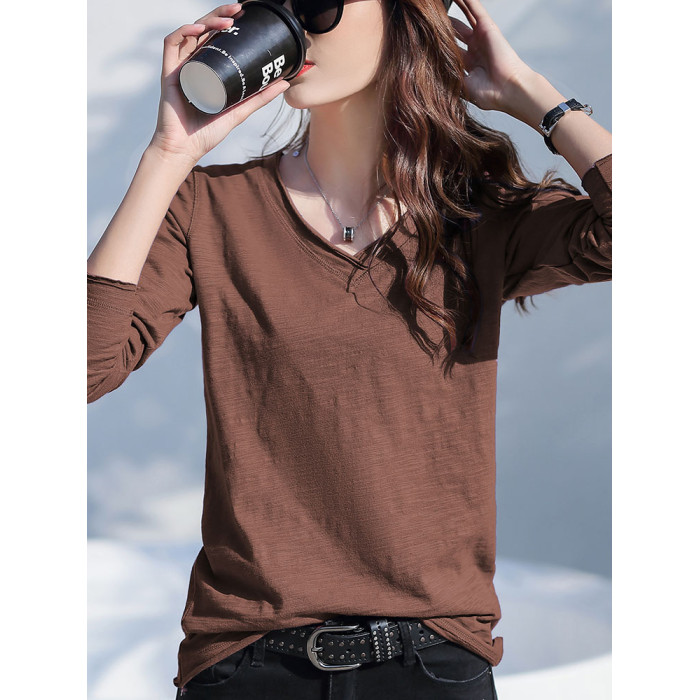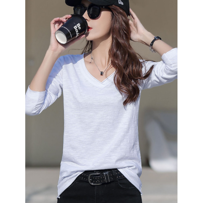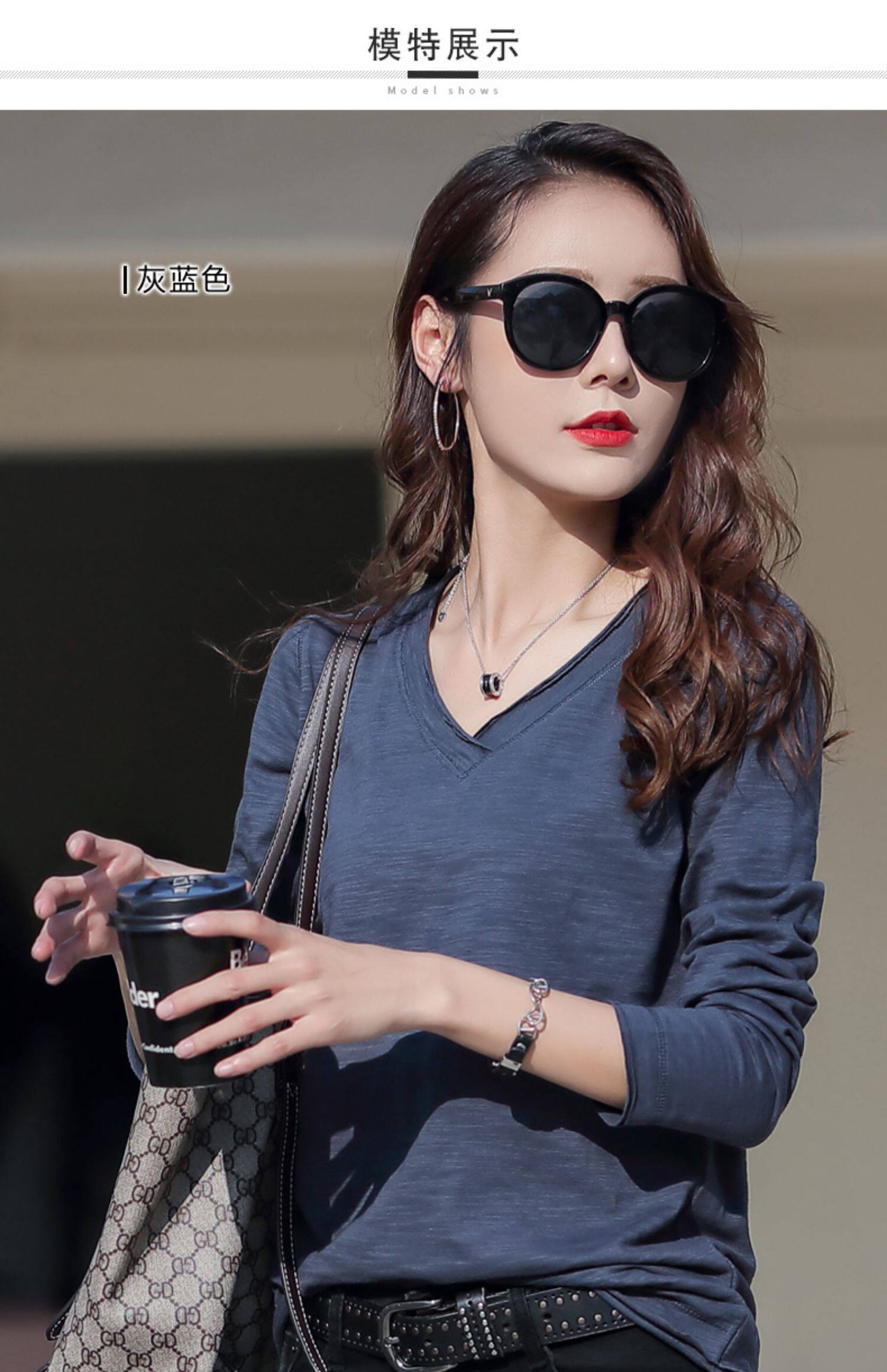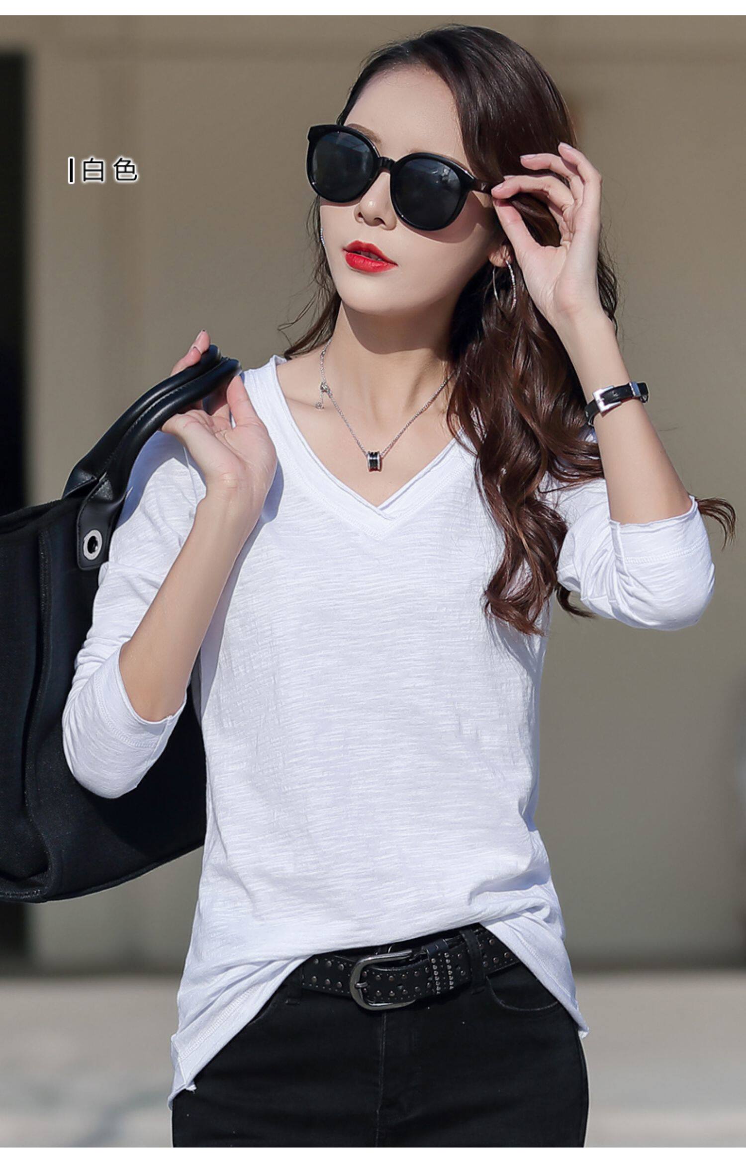 全棉長袖t恤女寬松秋裝2025新款竹節棉打底衫氣質v領女裝內搭上衣