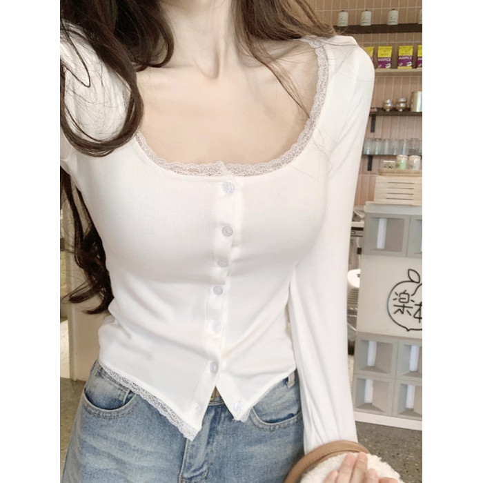 小香蕾絲打底衫女秋冬2025新款純欲白色低領辣妹短款內搭長袖上衣