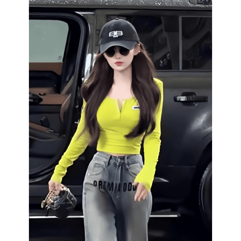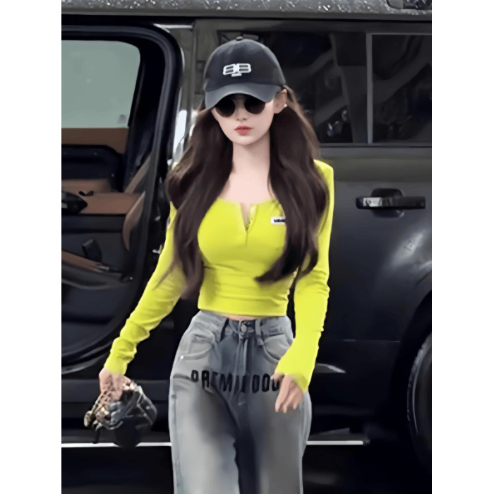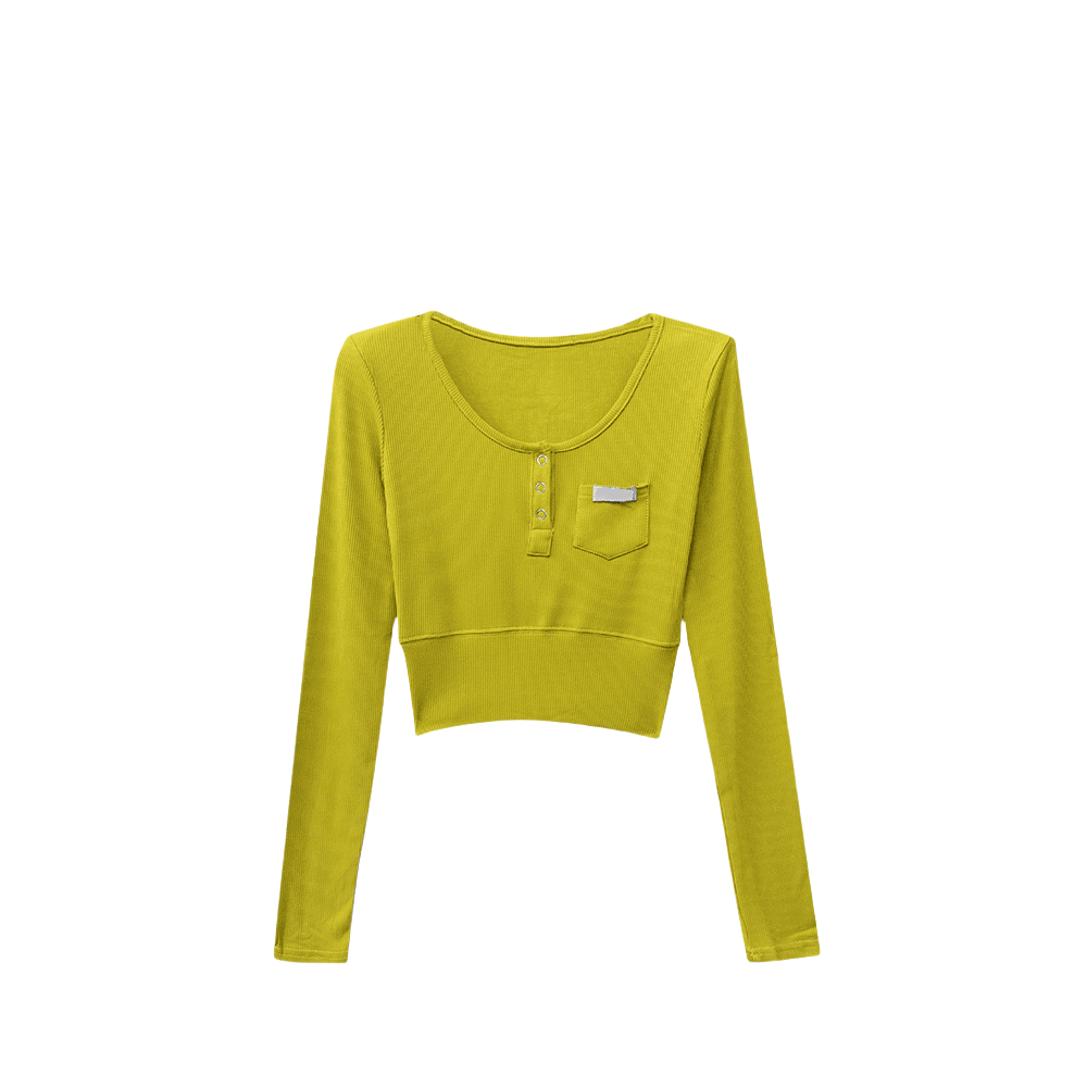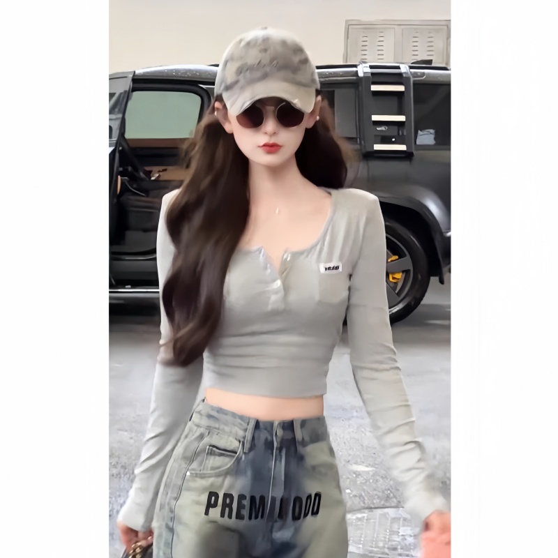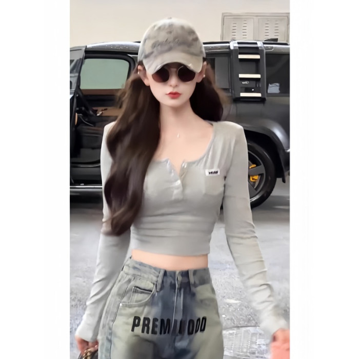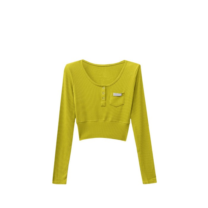 美式辣妹半開領小口袋長袖t恤女秋季新款修身顯瘦打底衫短款上衣