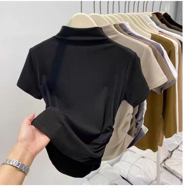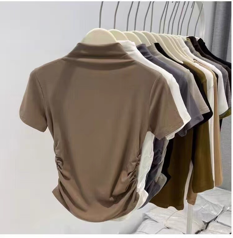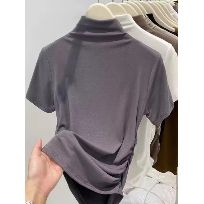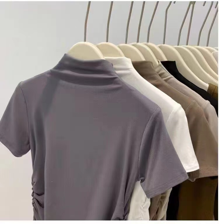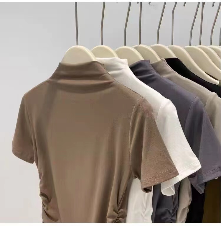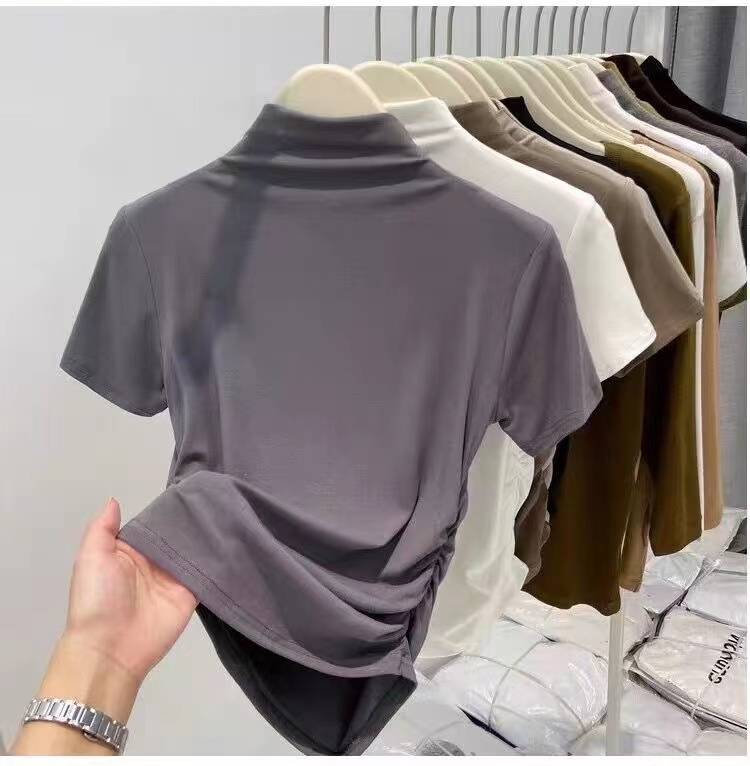 莫代爾2025新款大碼春秋半高領收腰短袖T恤洋氣褶皺修身打底上衣