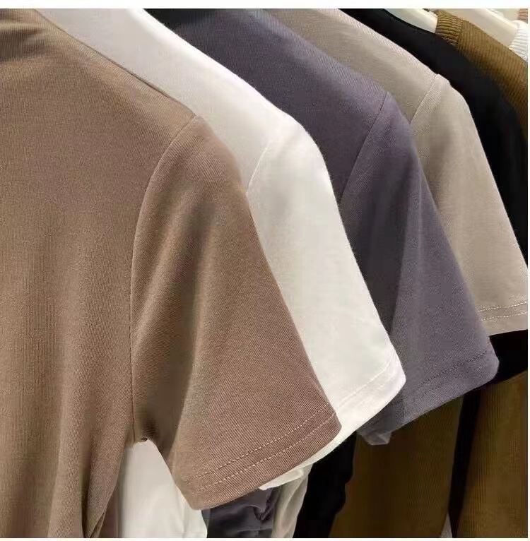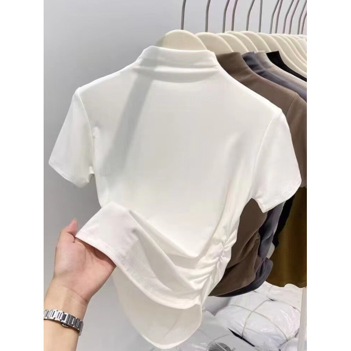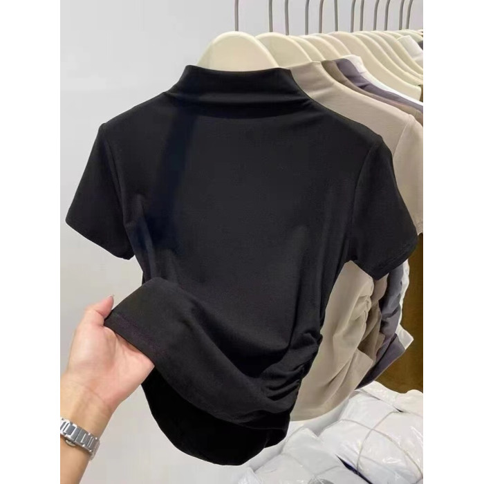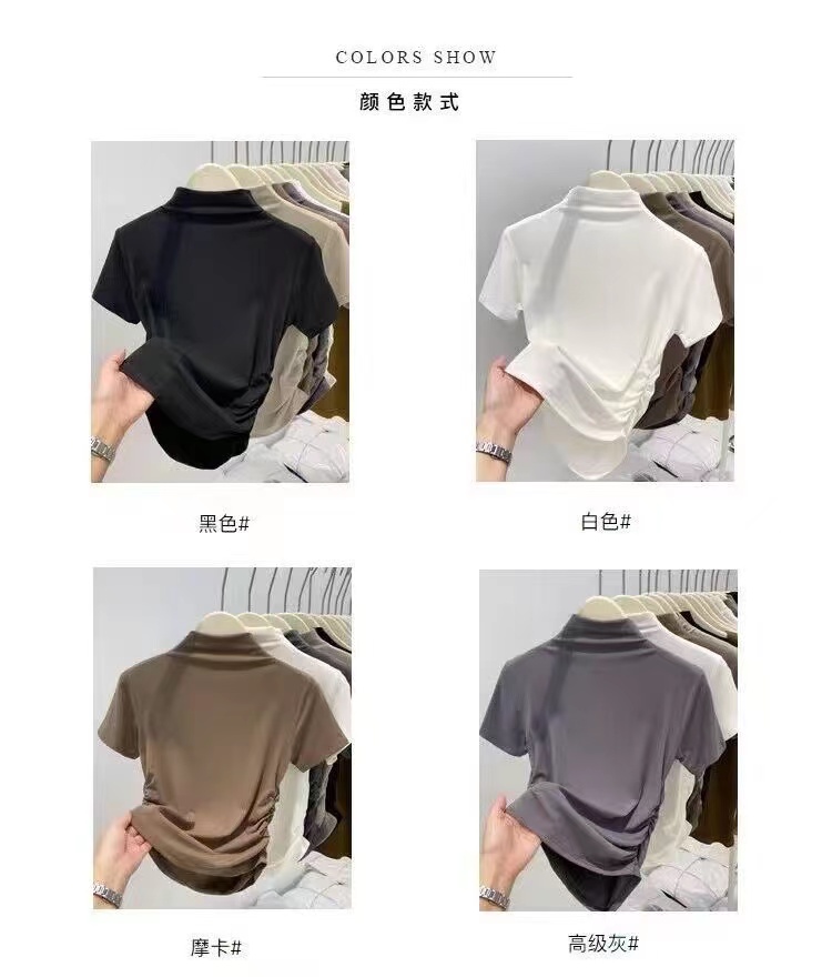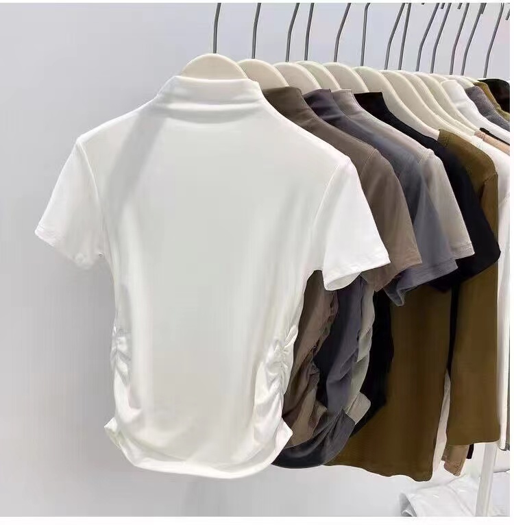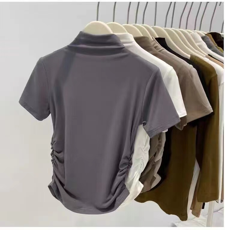 莫代爾2025新款大碼春秋半高領收腰短袖T恤洋氣褶皺修身打底上衣