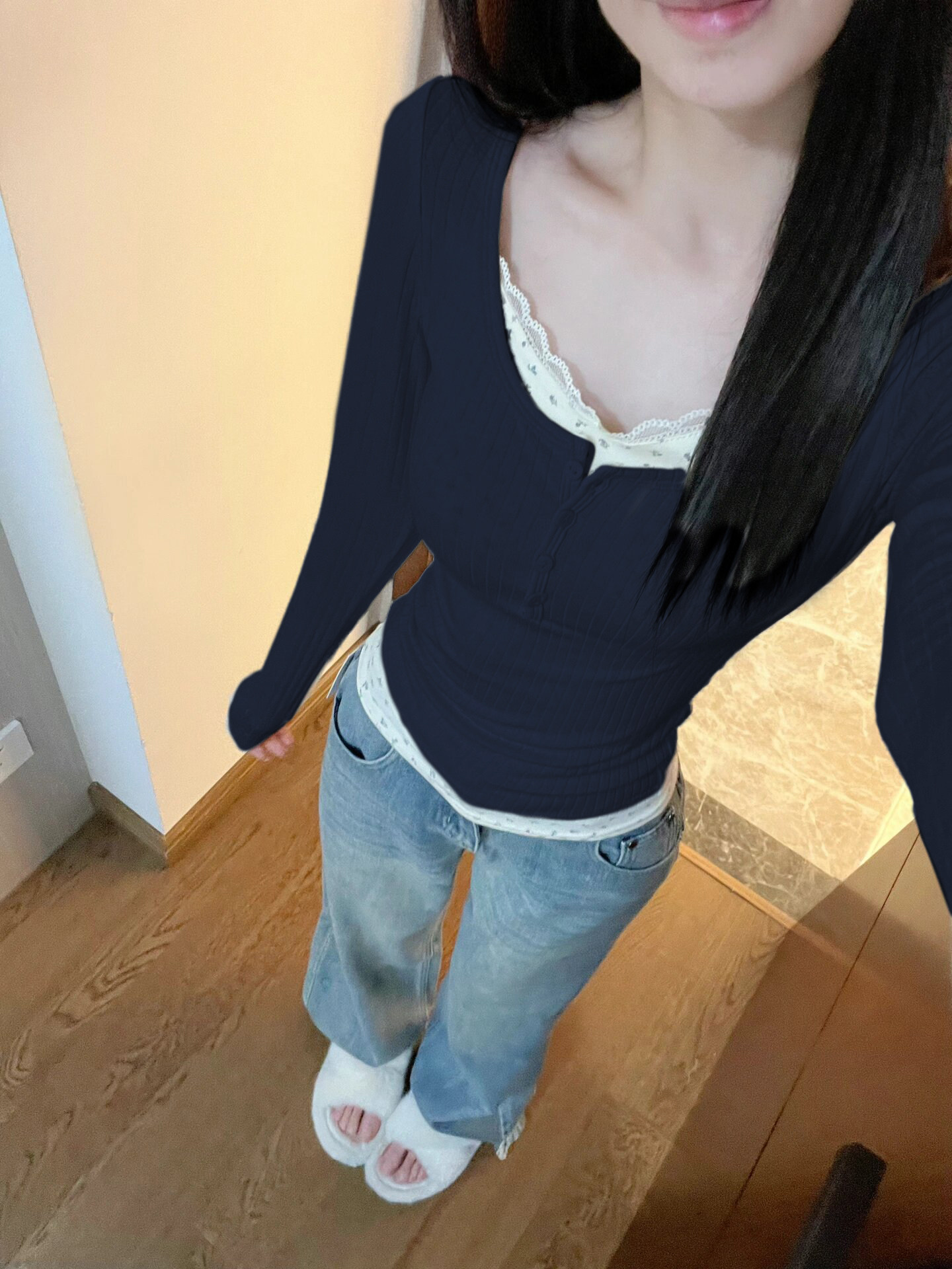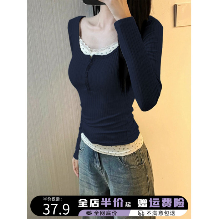 芭蕾風蕾絲假兩件打底衫女秋季季掐腰上衣高級感內搭保暖洋氣小衫