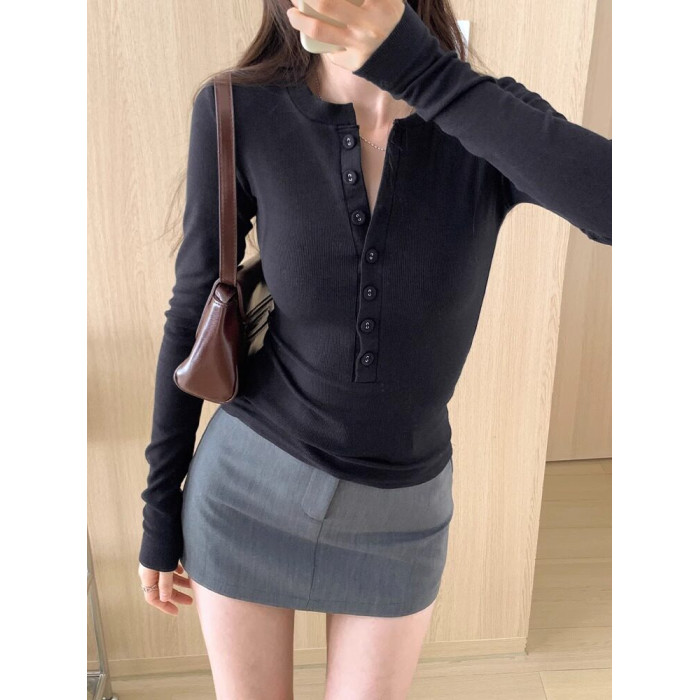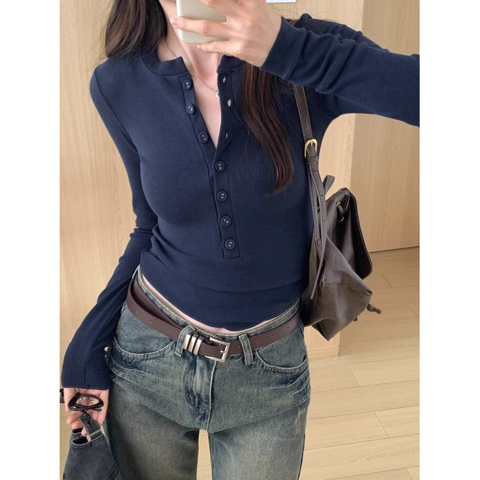 白色長袖V領設計感紐釦螺紋上衣春秋修身半開領辣妹ins打底衫T恤