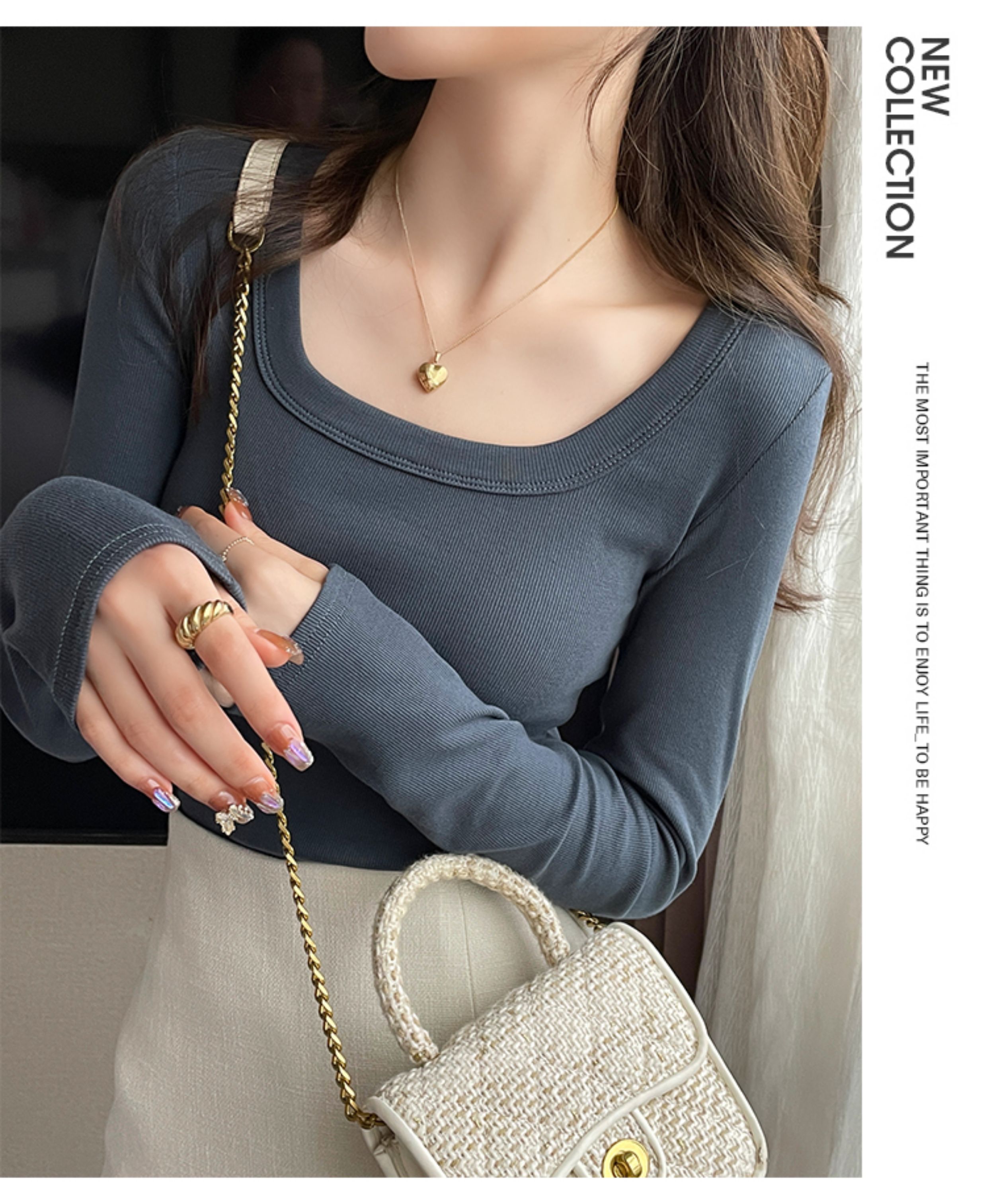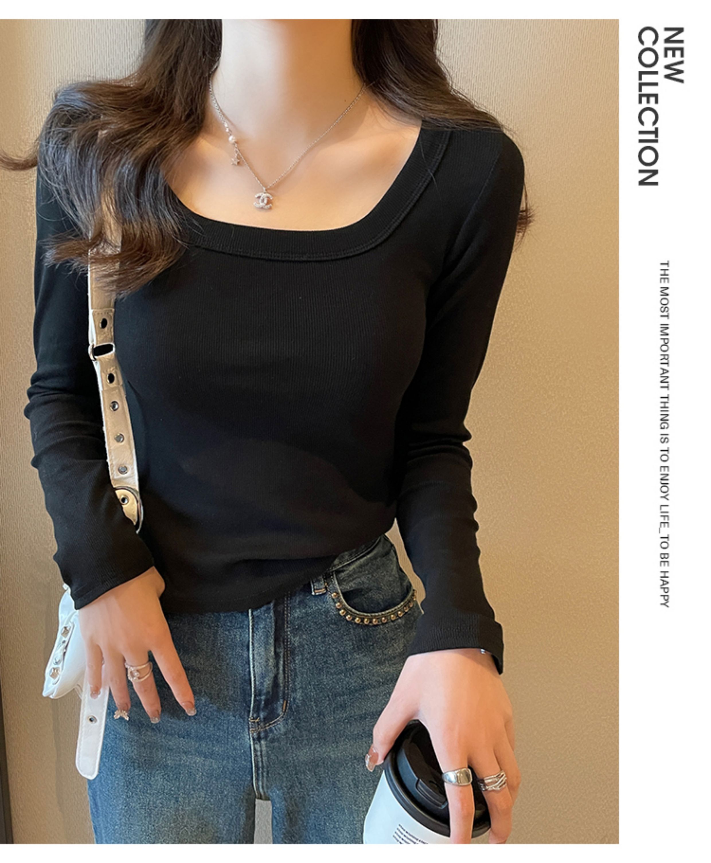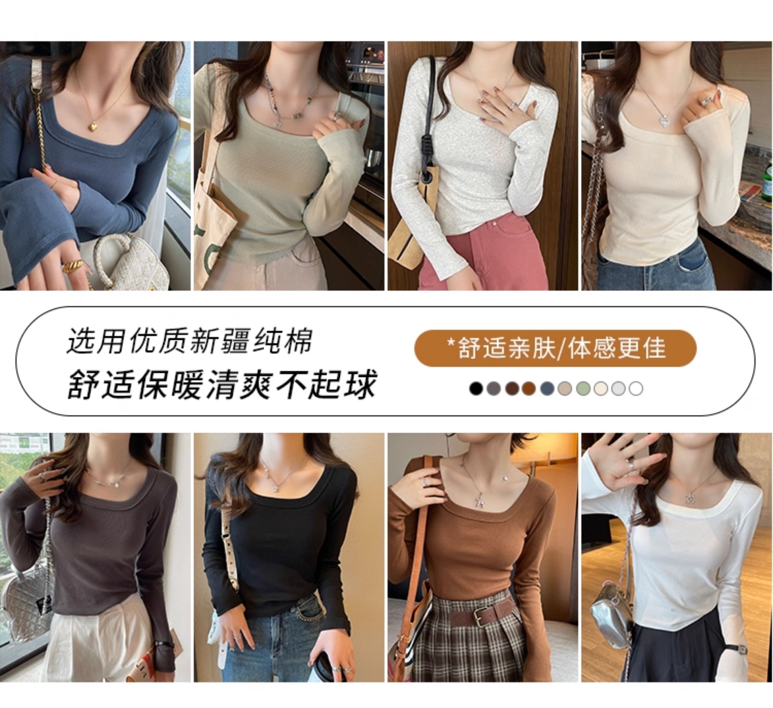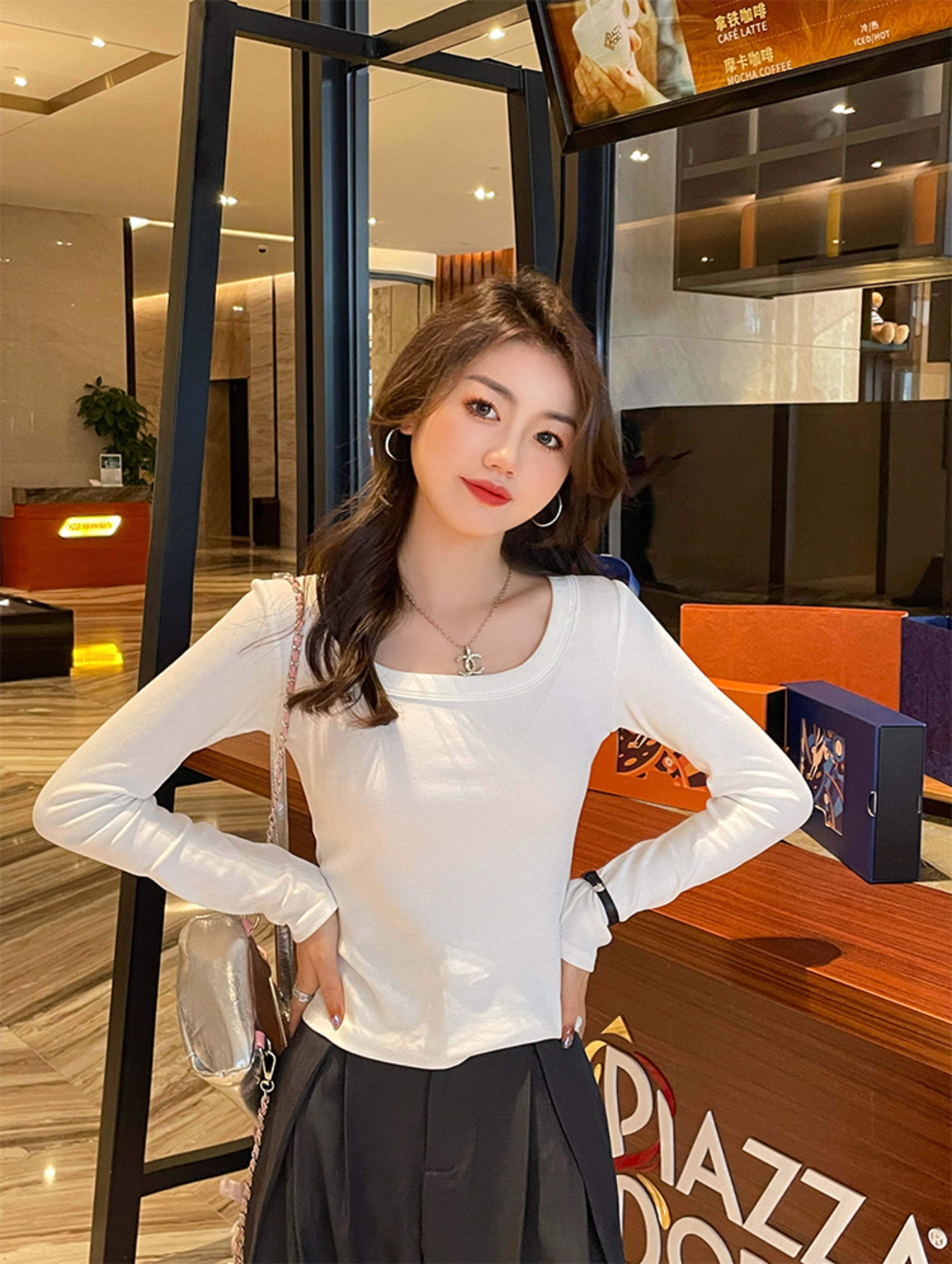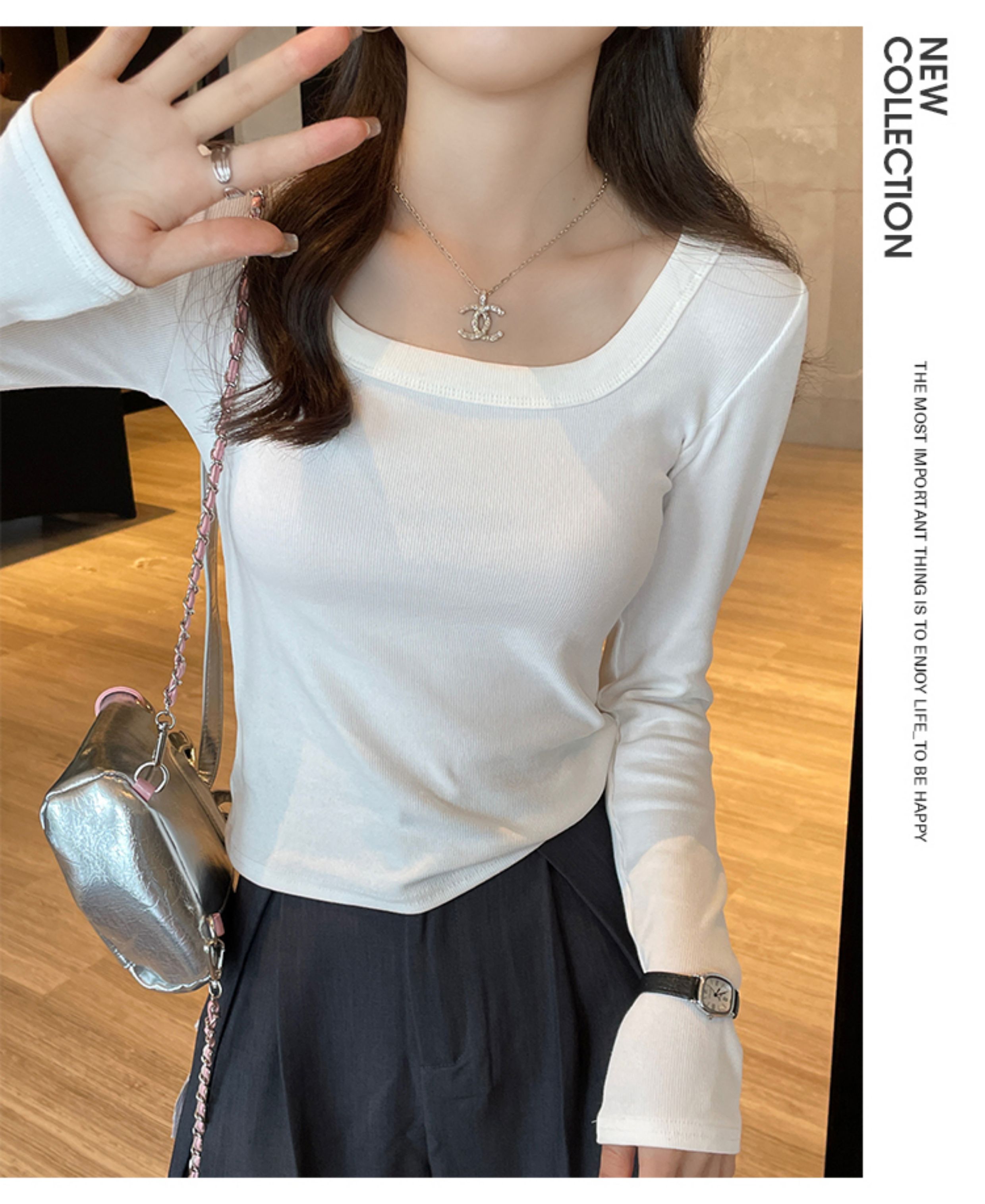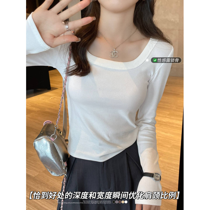 方領長袖t恤2025早秋季女流行新款內搭打底衫修身低u領白色小上衣