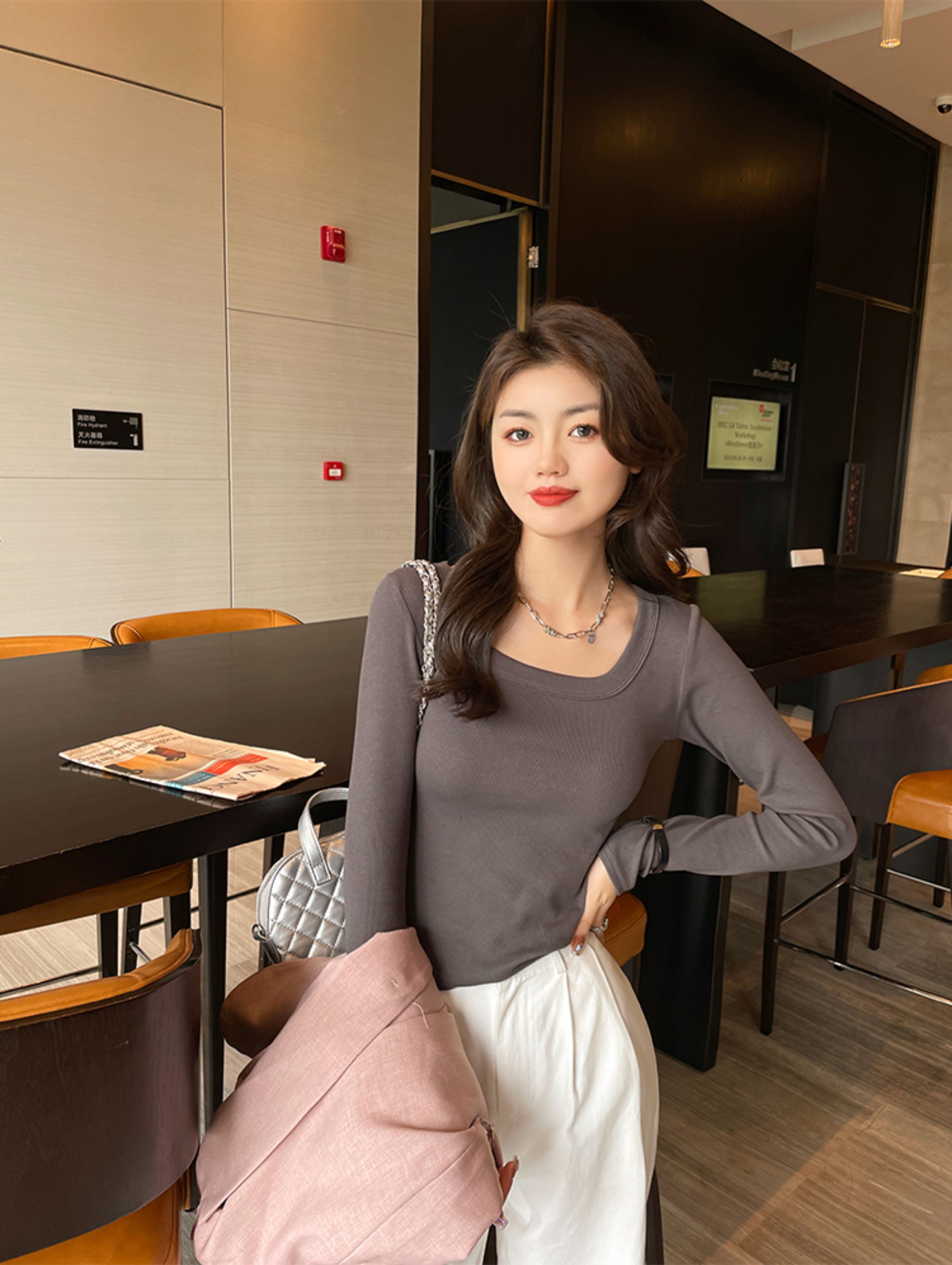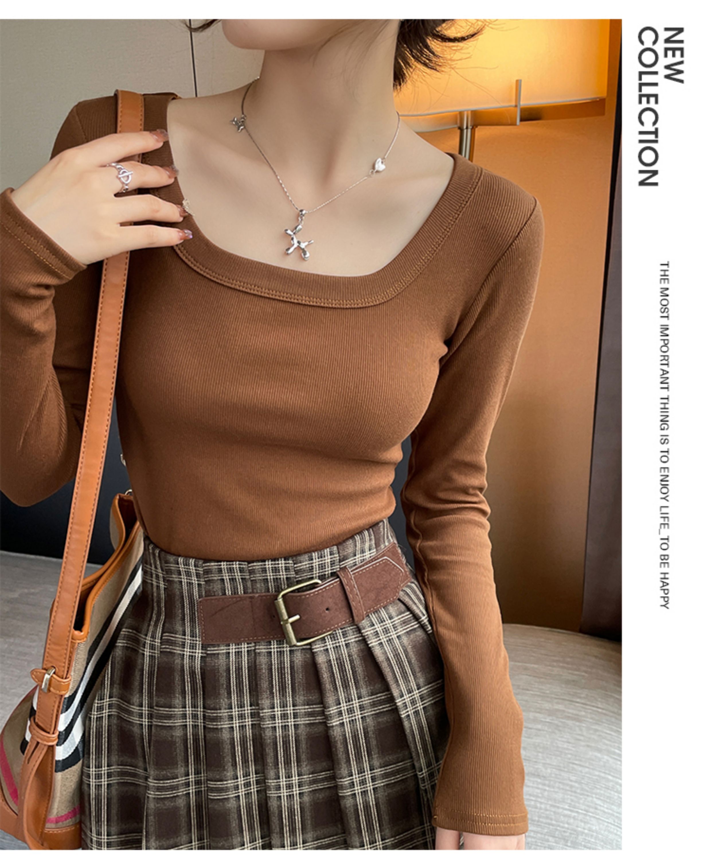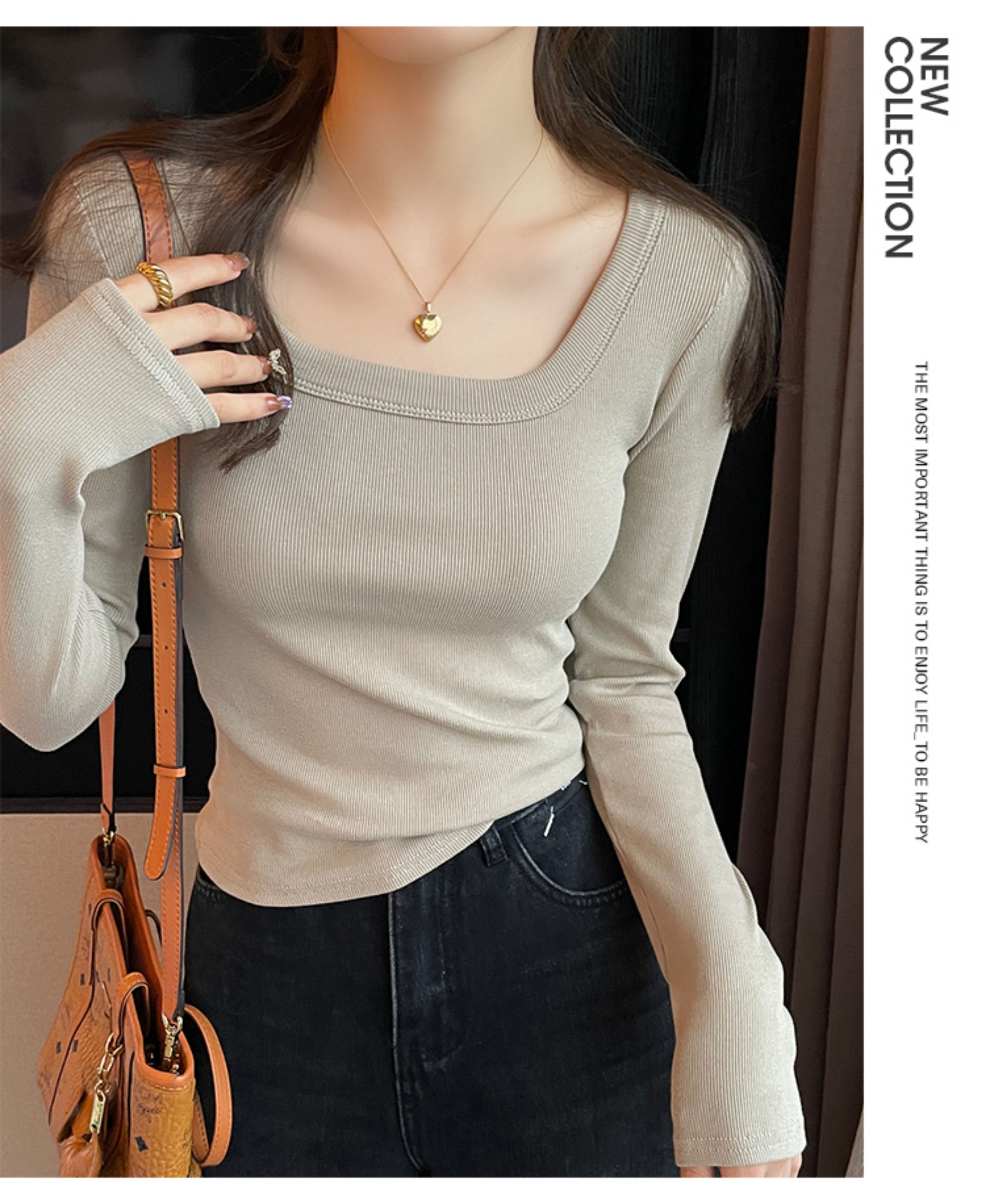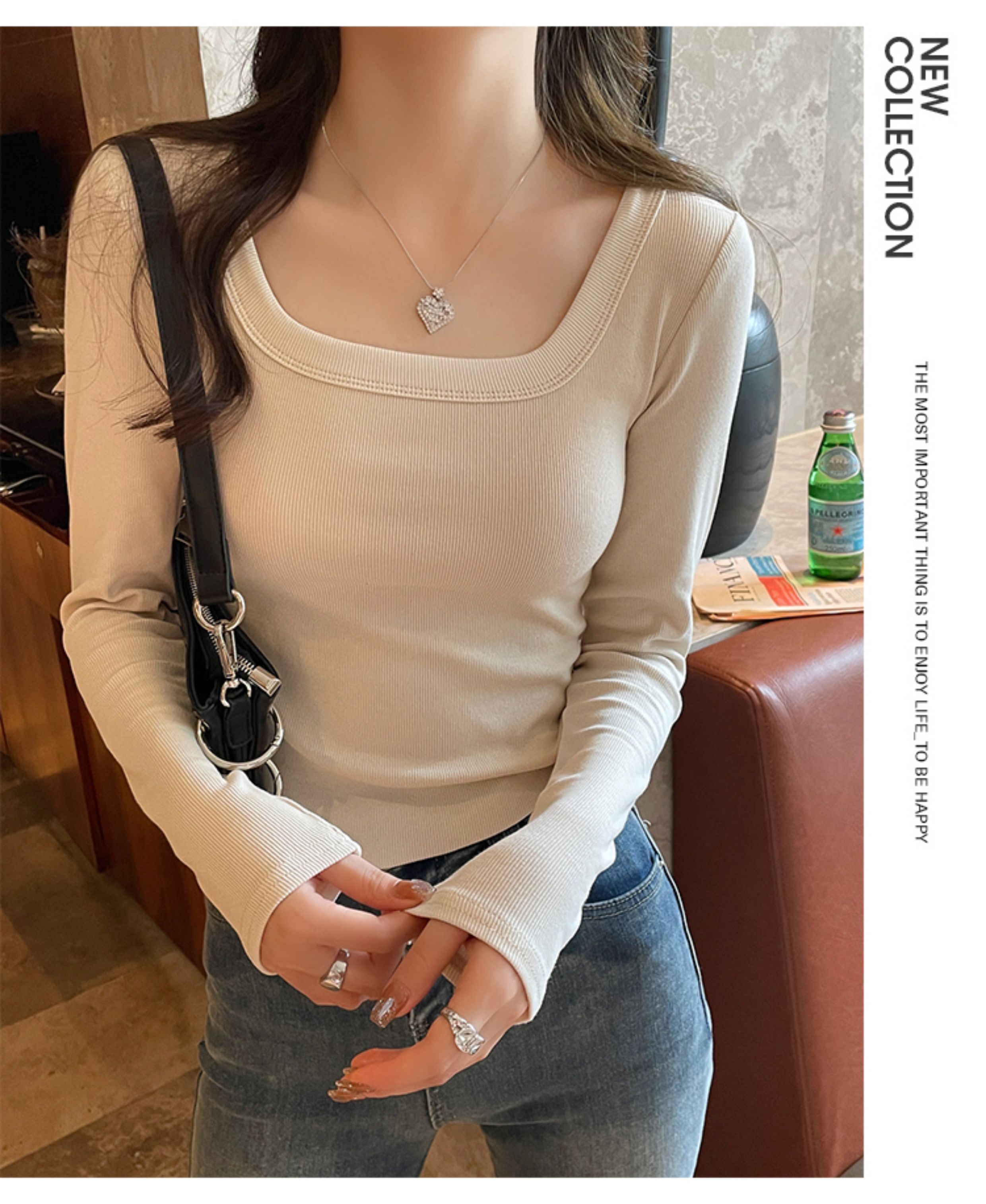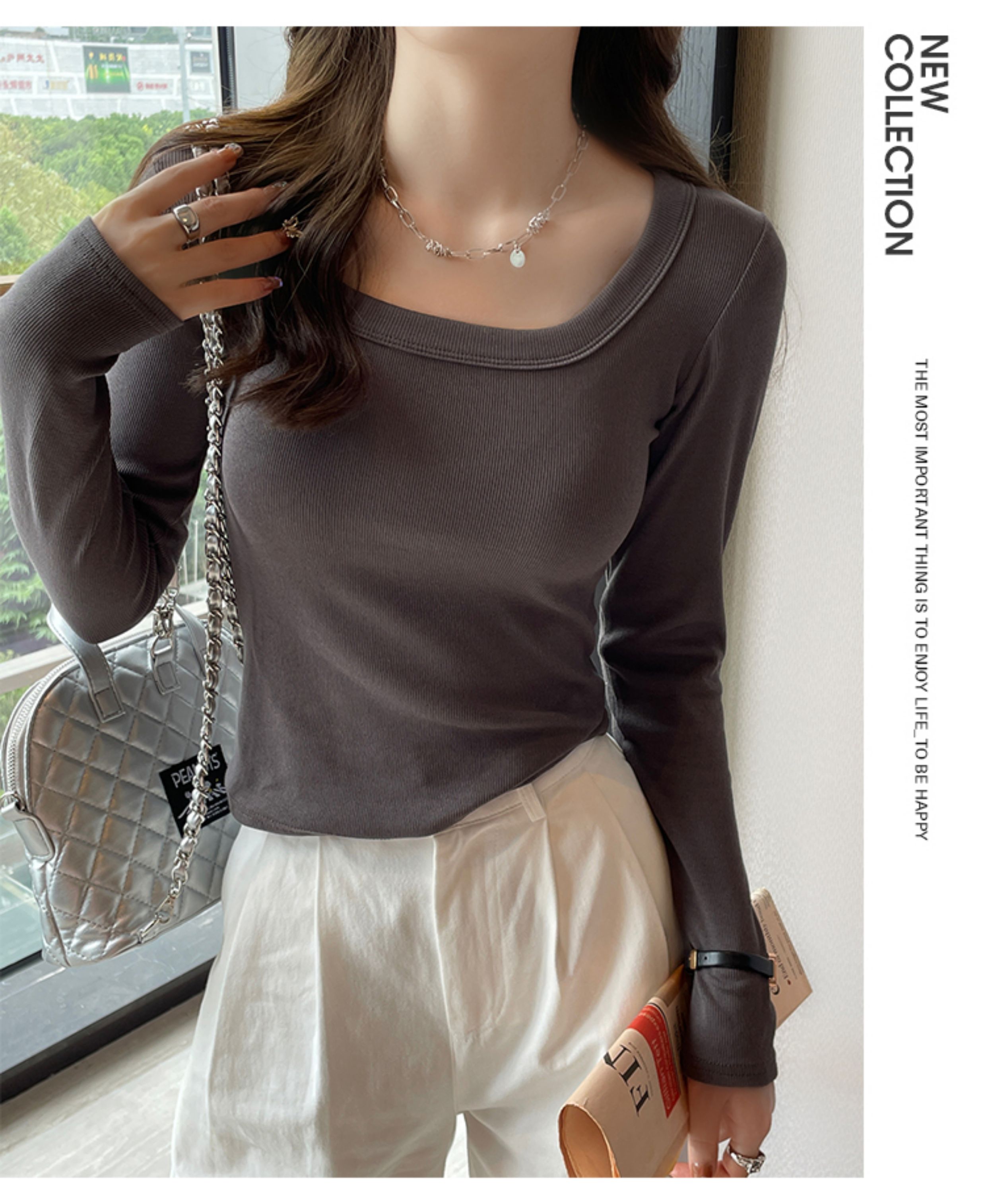 方領長袖t恤2025早秋季女流行新款內搭打底衫修身低u領白色小上衣