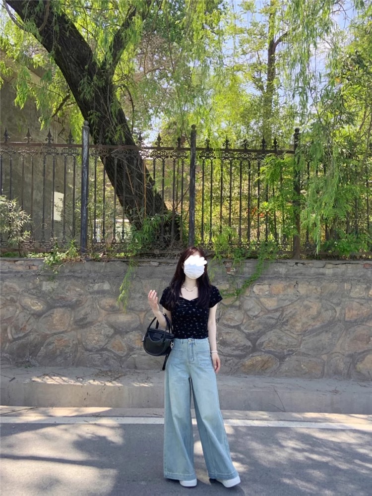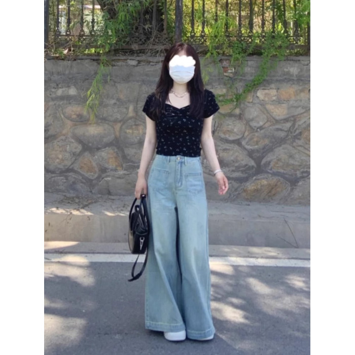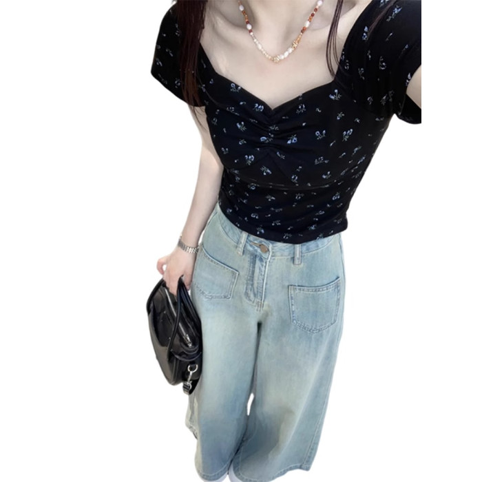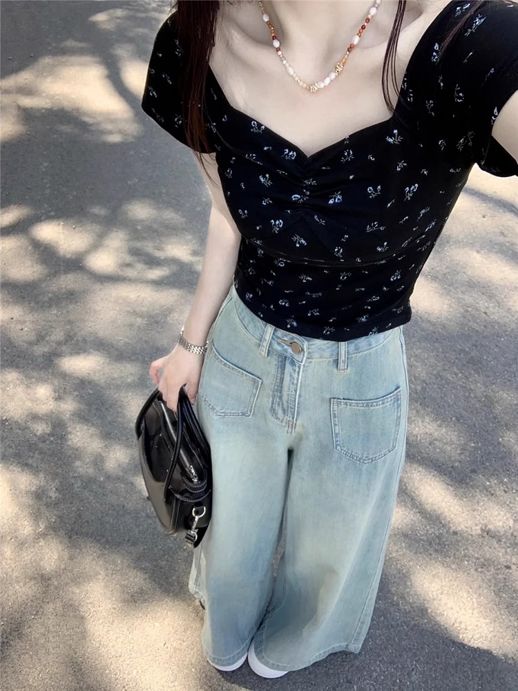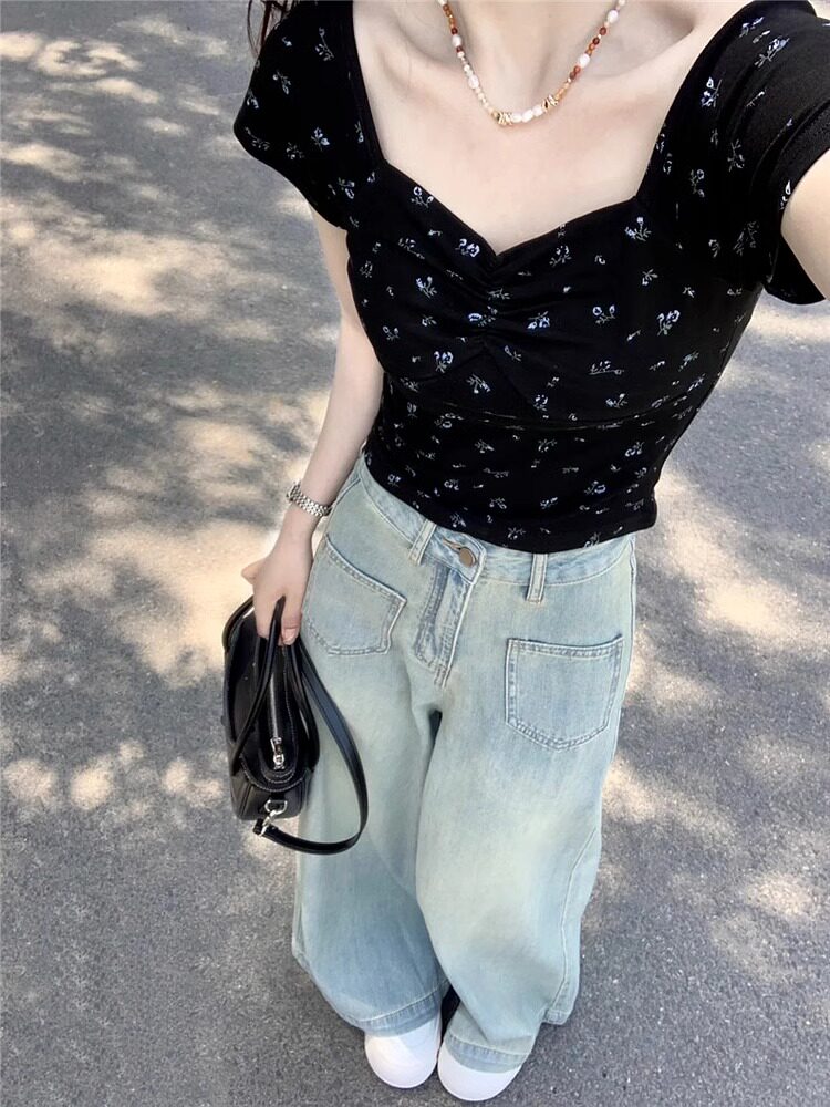 辣妹碎花別致方領鎖骨純欲正肩修身短袖T恤女夏季洋氣絕美ins上衣