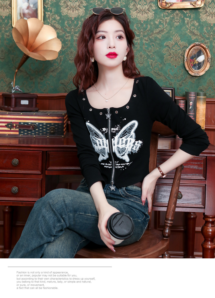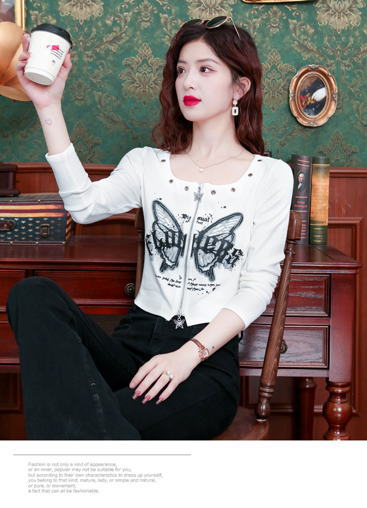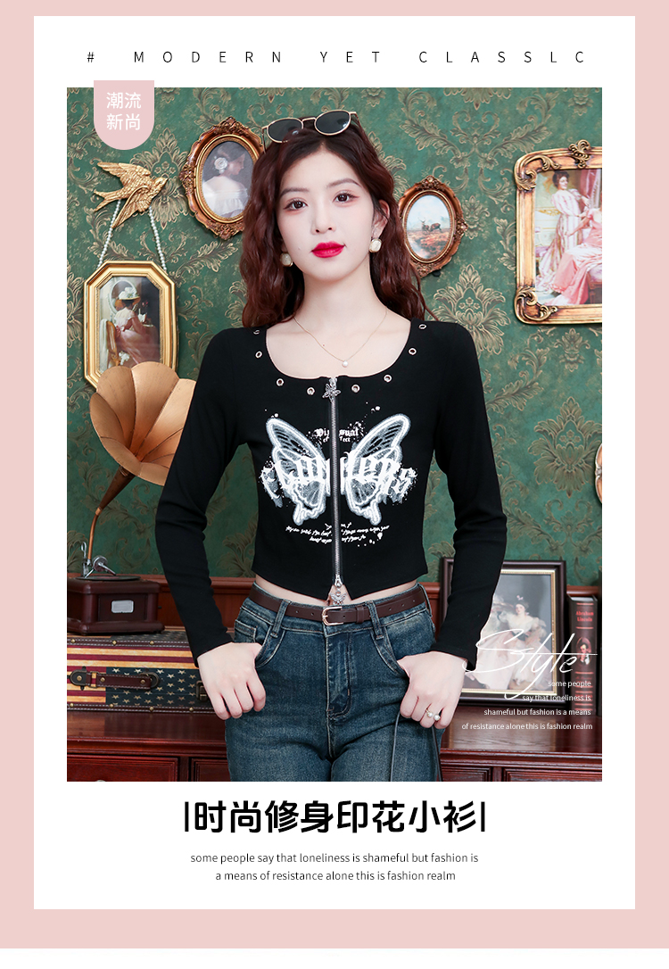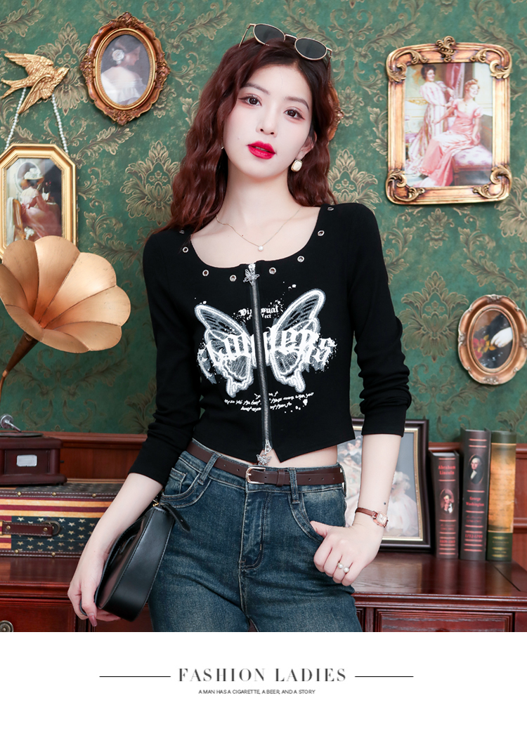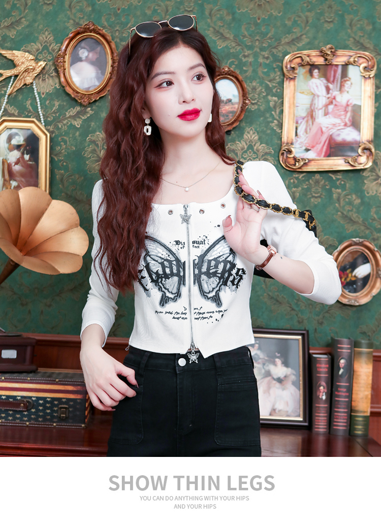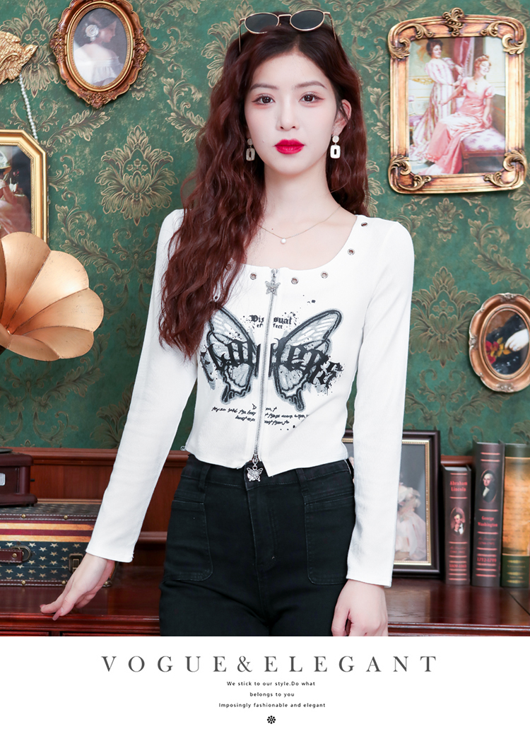蝴蝶印花長袖t恤女春秋新款韓版方領打底衫顯瘦短款拉鍊開衫上衣
