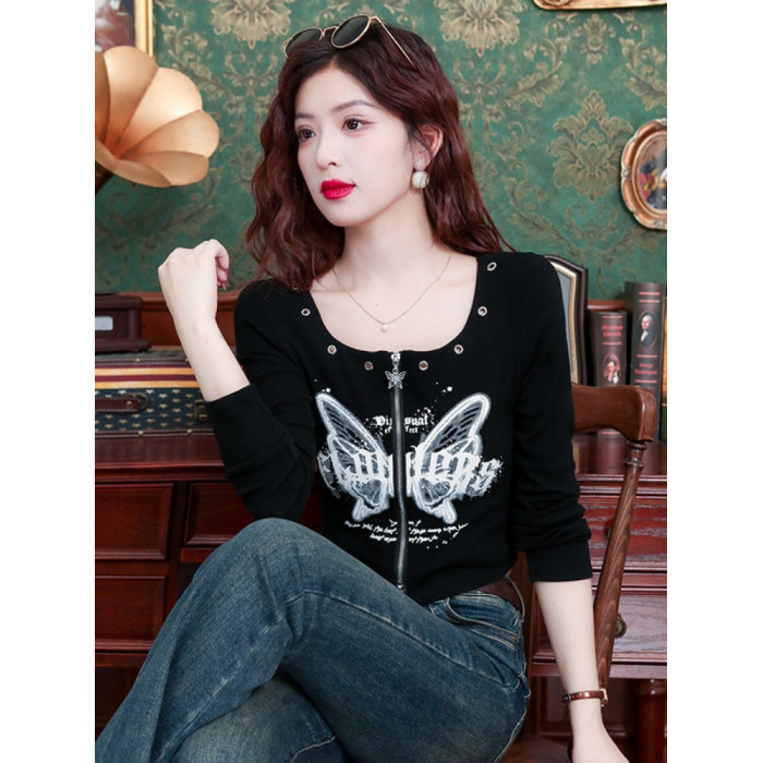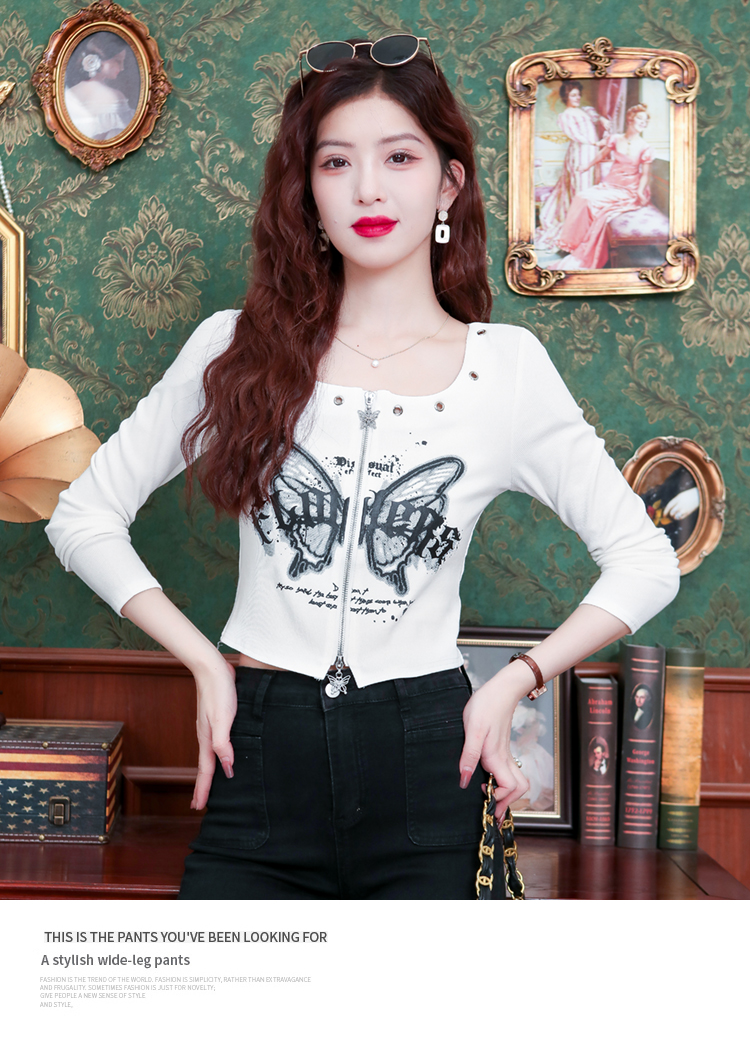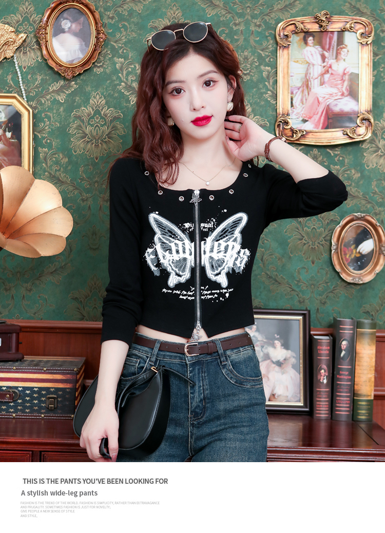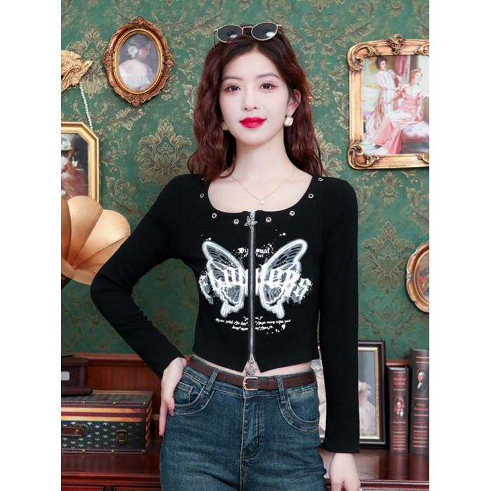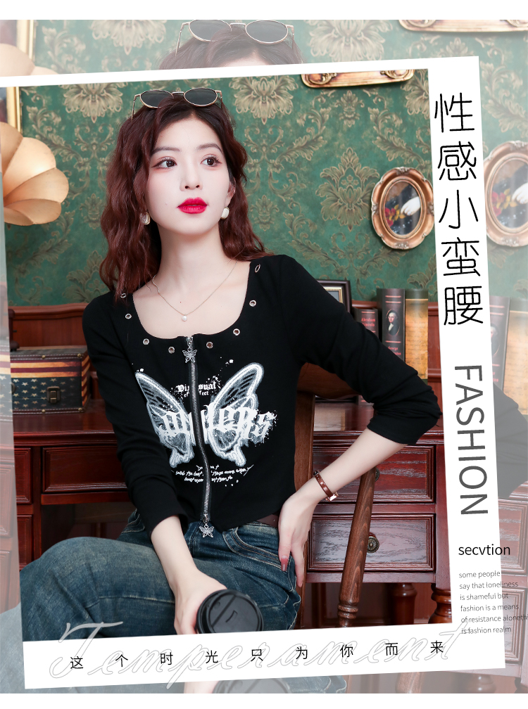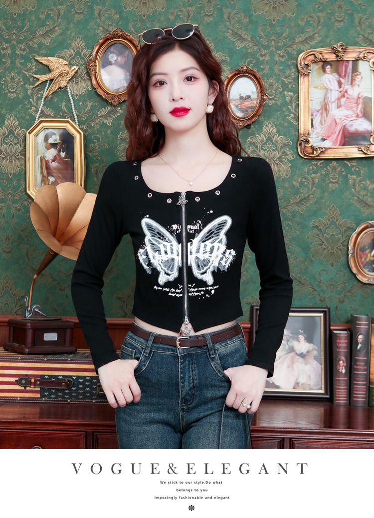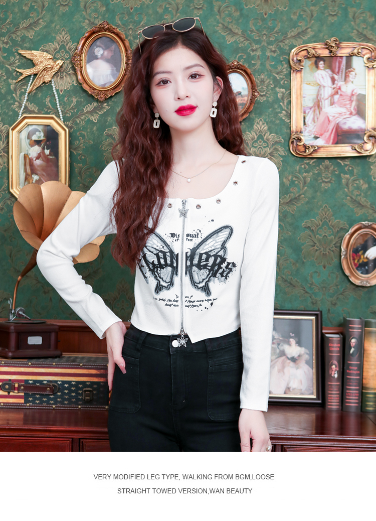 蝴蝶印花長袖t恤女春秋新款韓版方領打底衫顯瘦短款拉鍊開衫上衣