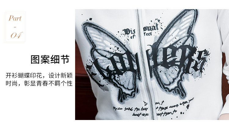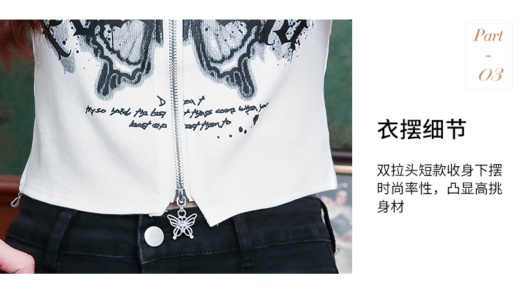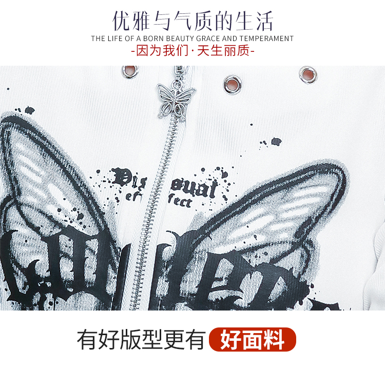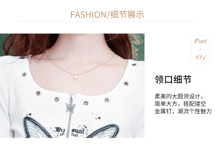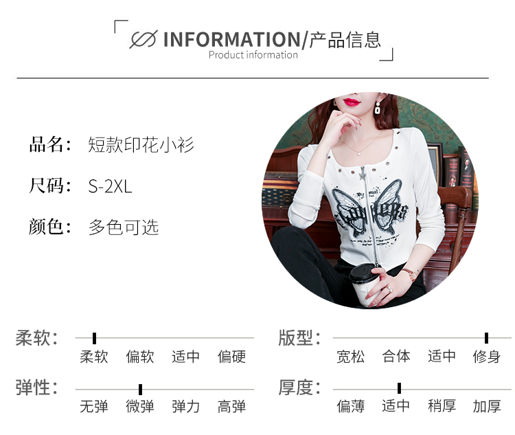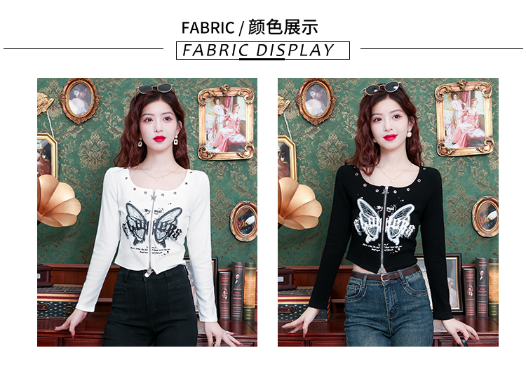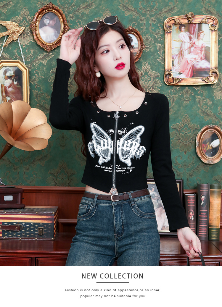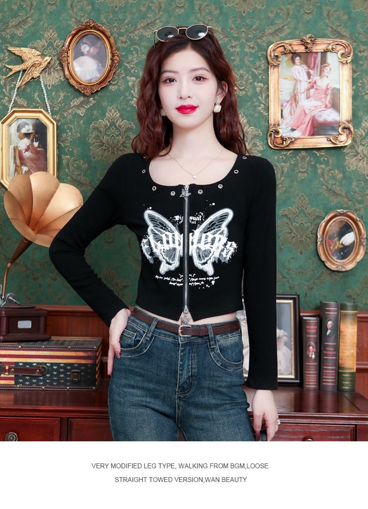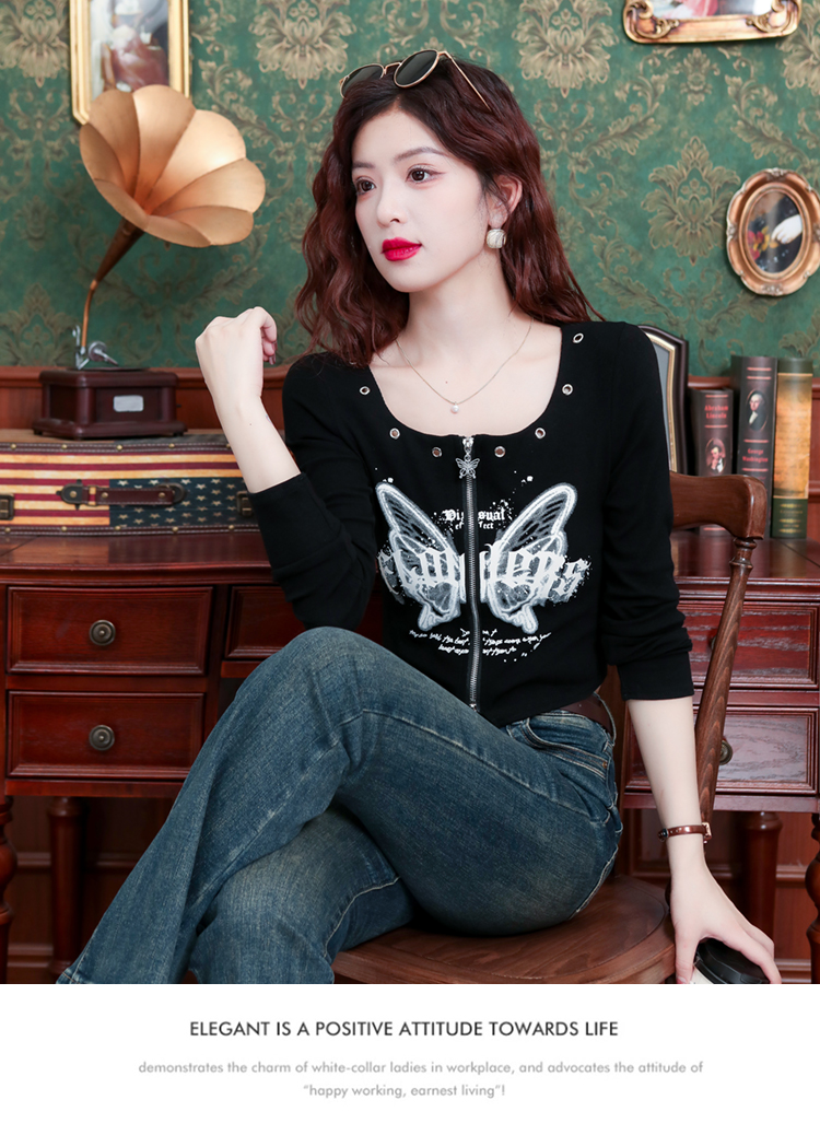 蝴蝶印花長袖t恤女春秋新款韓版方領打底衫顯瘦短款拉鍊開衫上衣