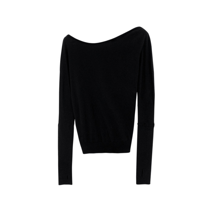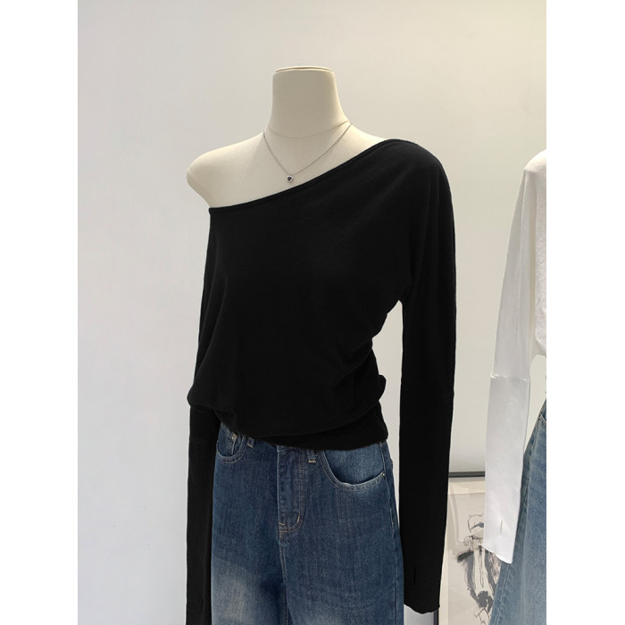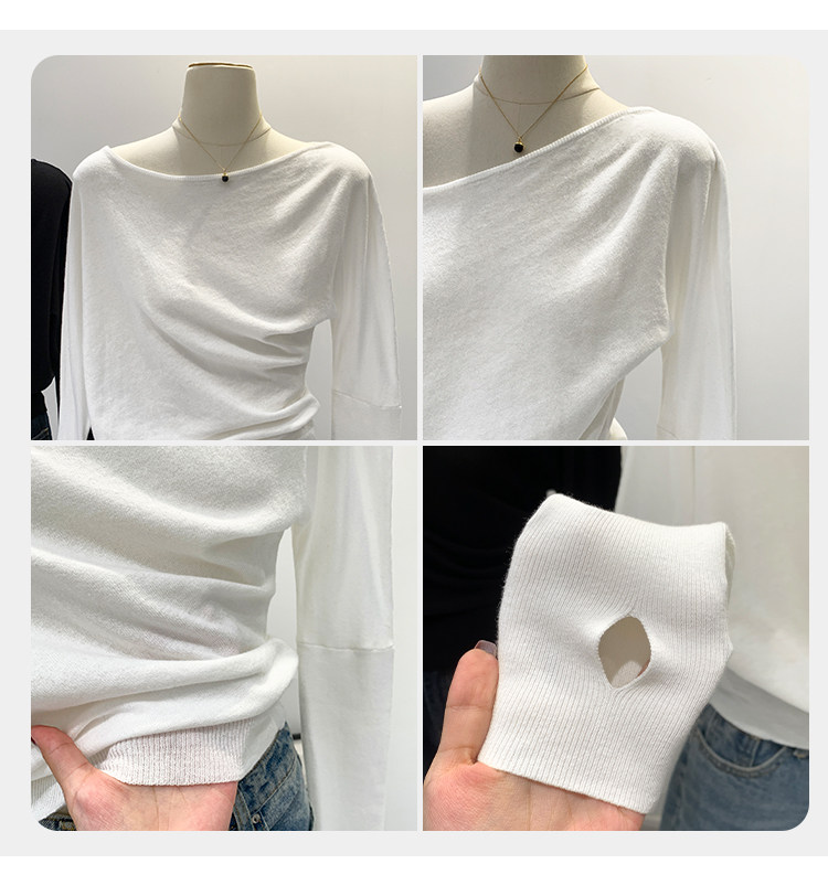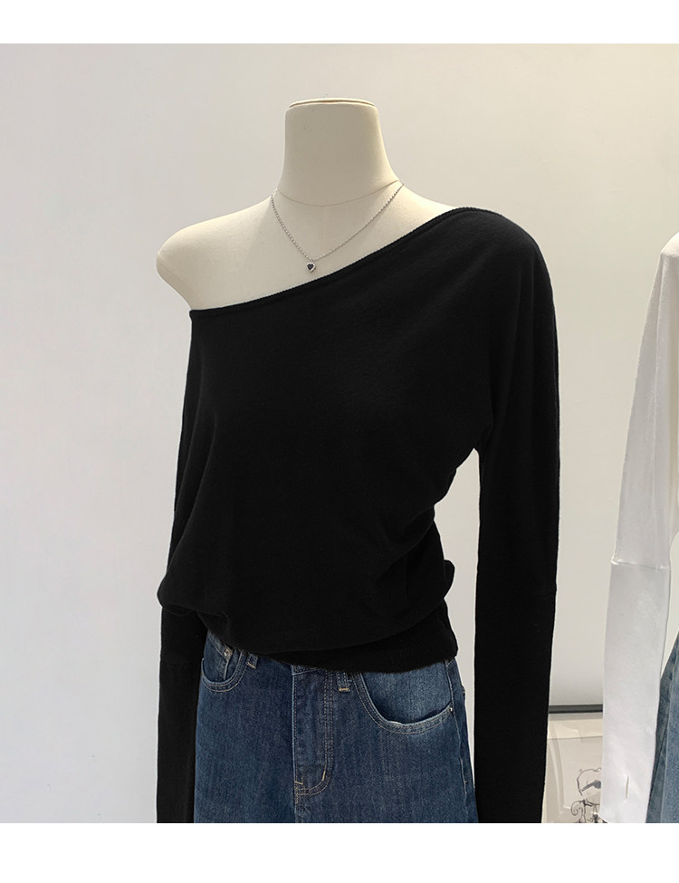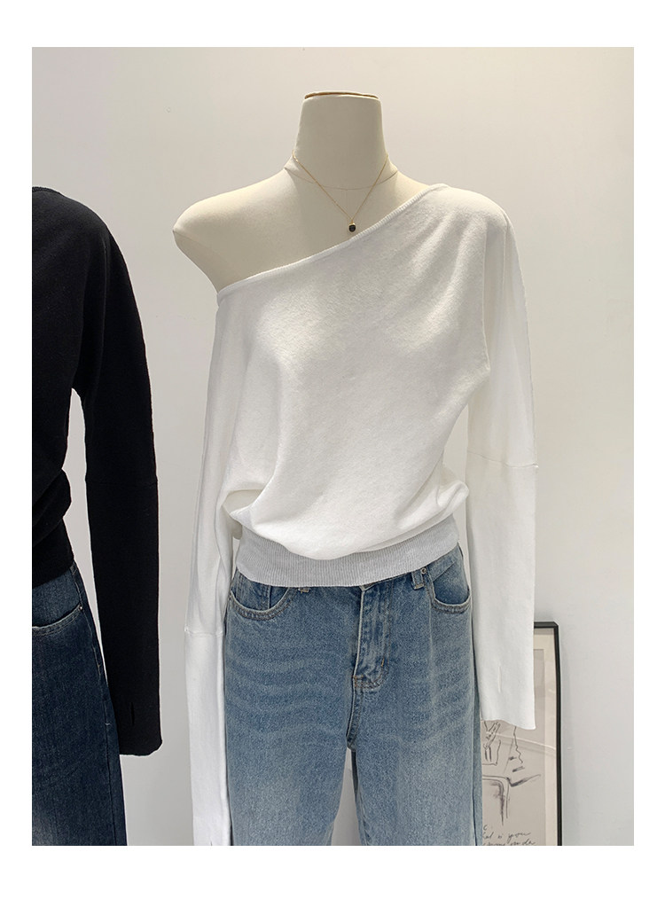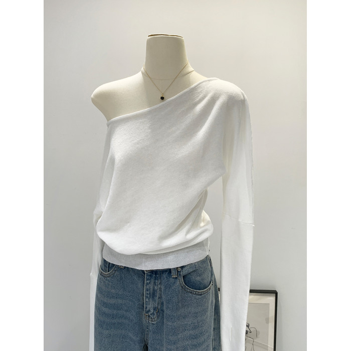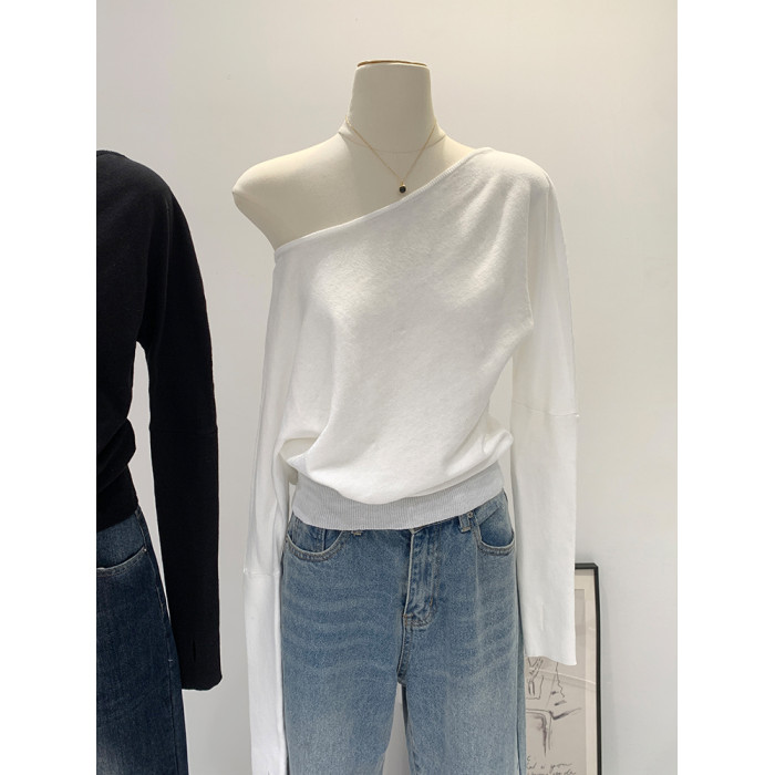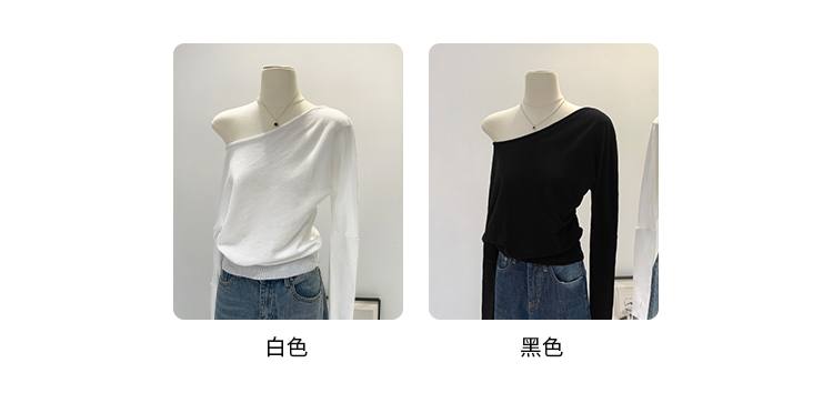 高級感露肩斜肩小上衣白色針織衫女秋冬新款韓系獨特漂亮長袖毛衣