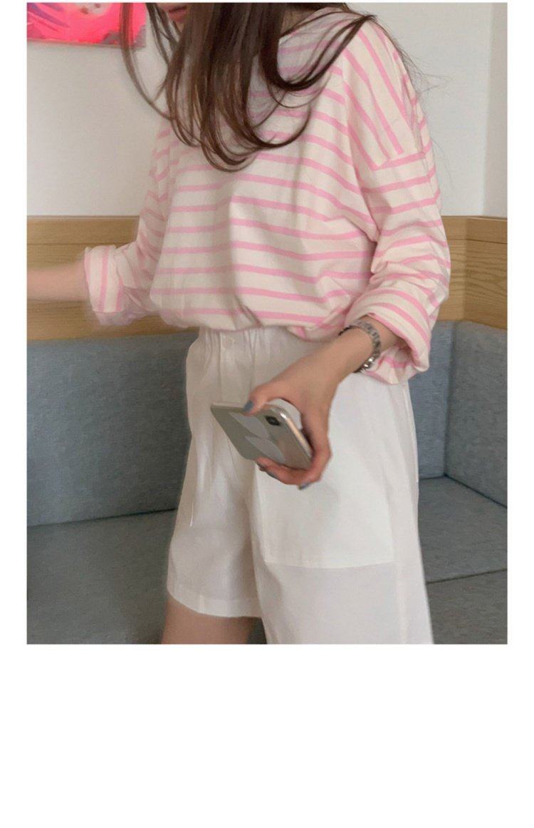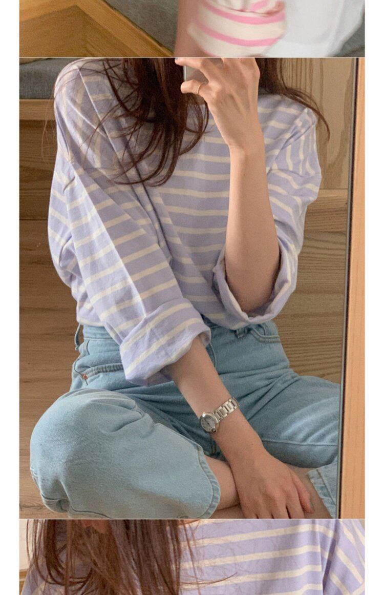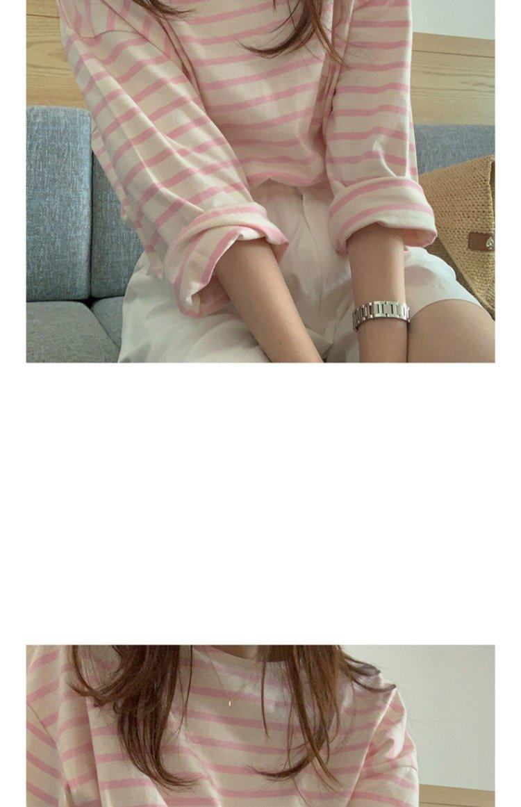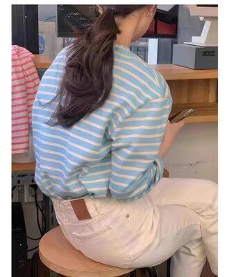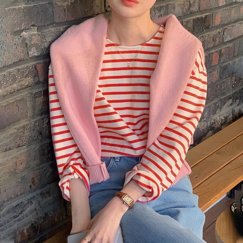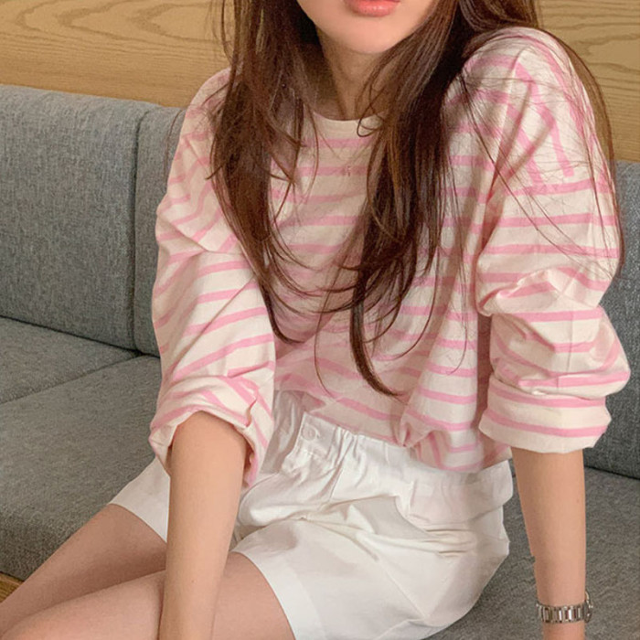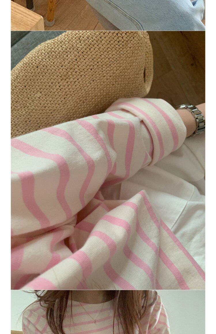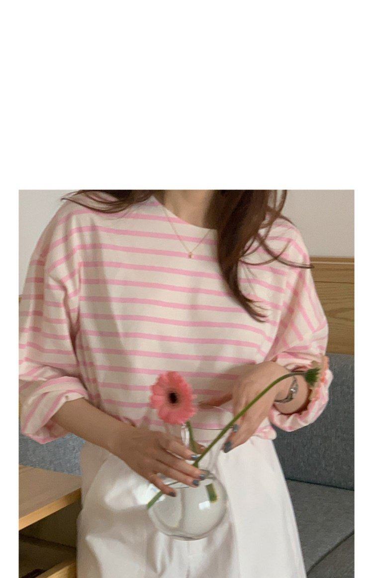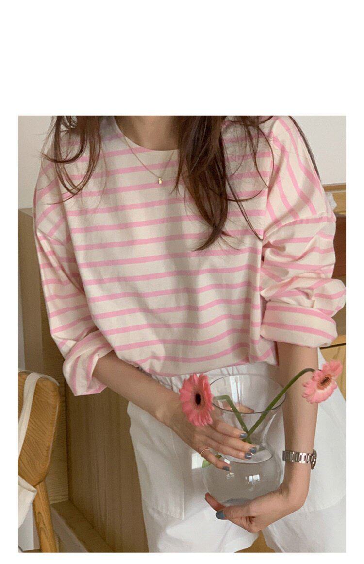 韓版粉色條紋T恤女2025春新款寬鬆長袖休閒長袖打底衫設計感上衣