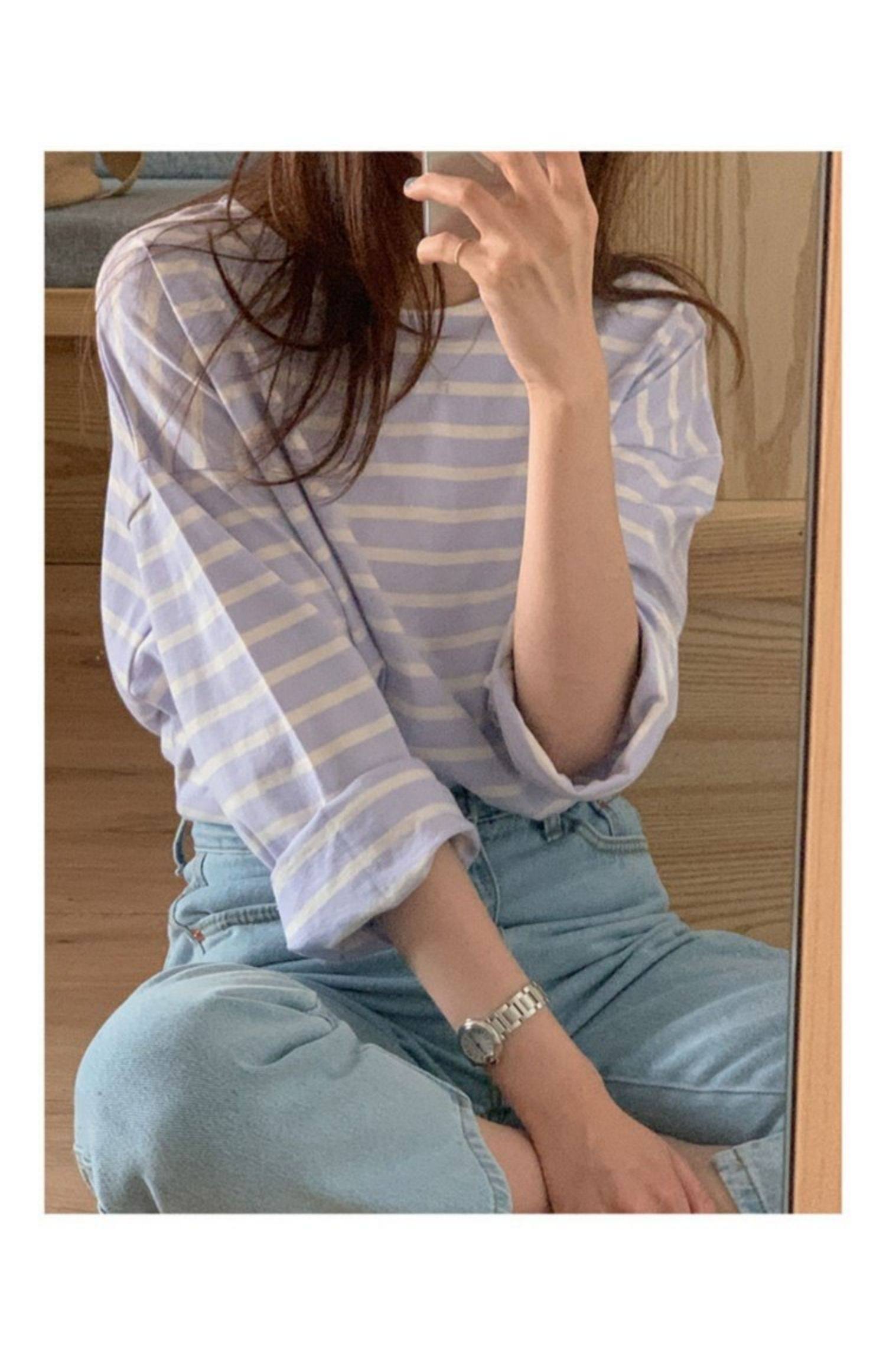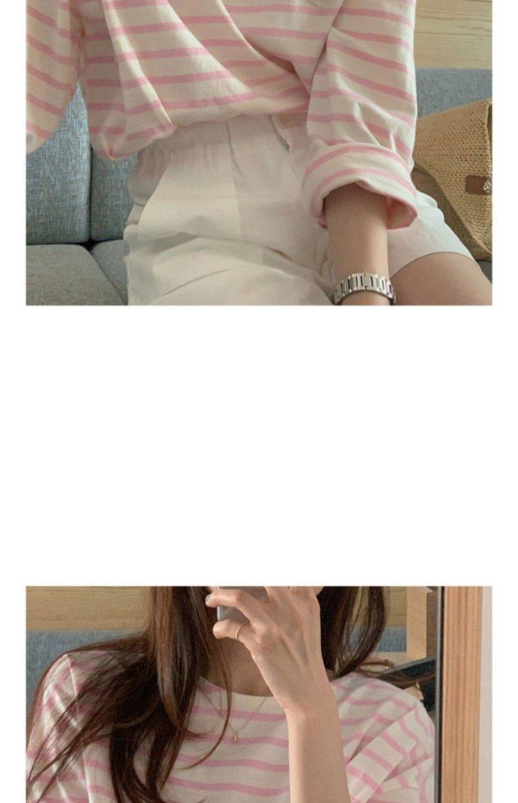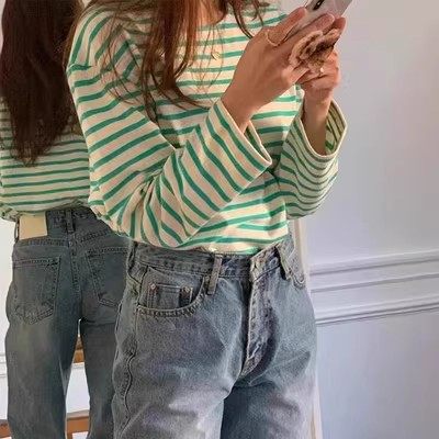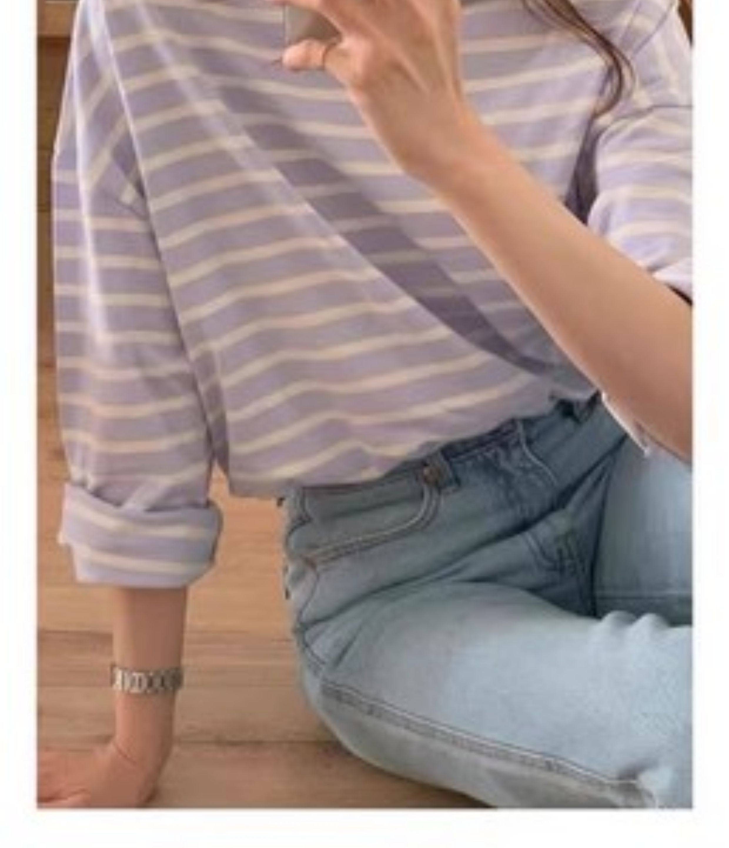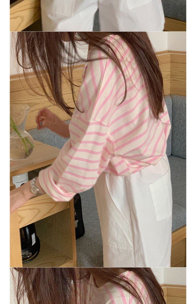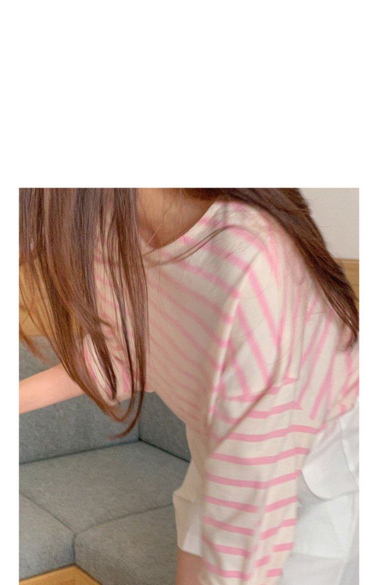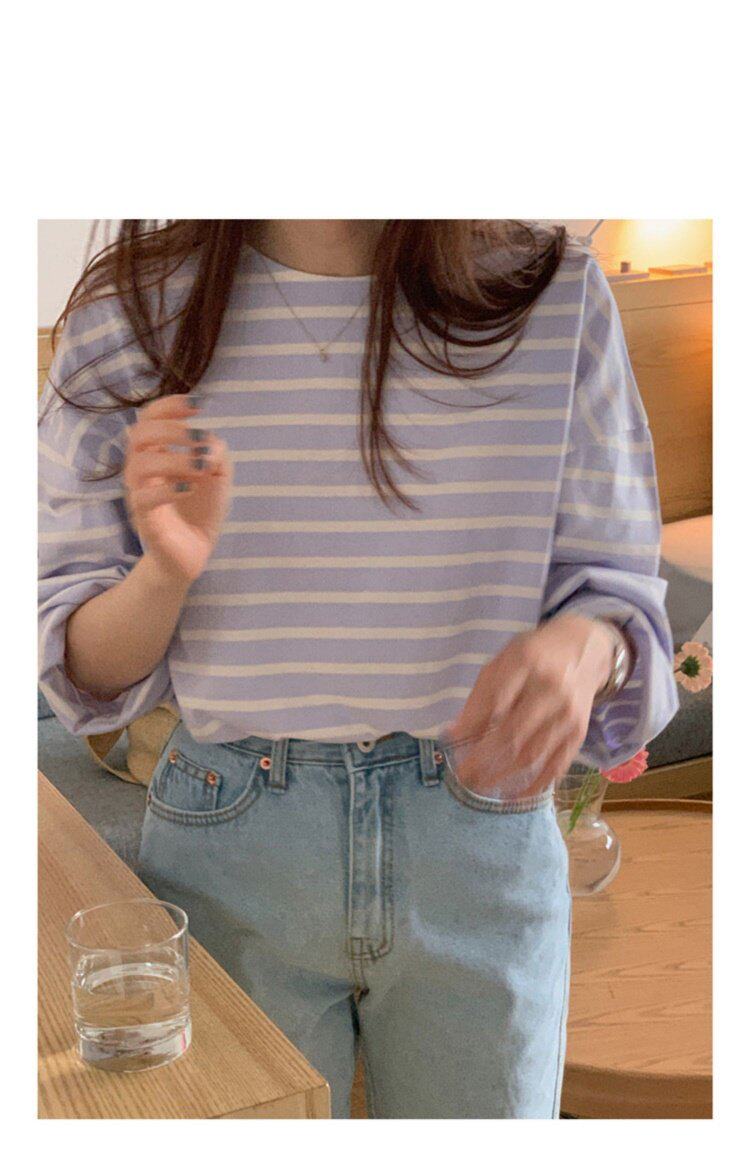 韓版粉色條紋T恤女2025春新款寬鬆長袖休閒長袖打底衫設計感上衣