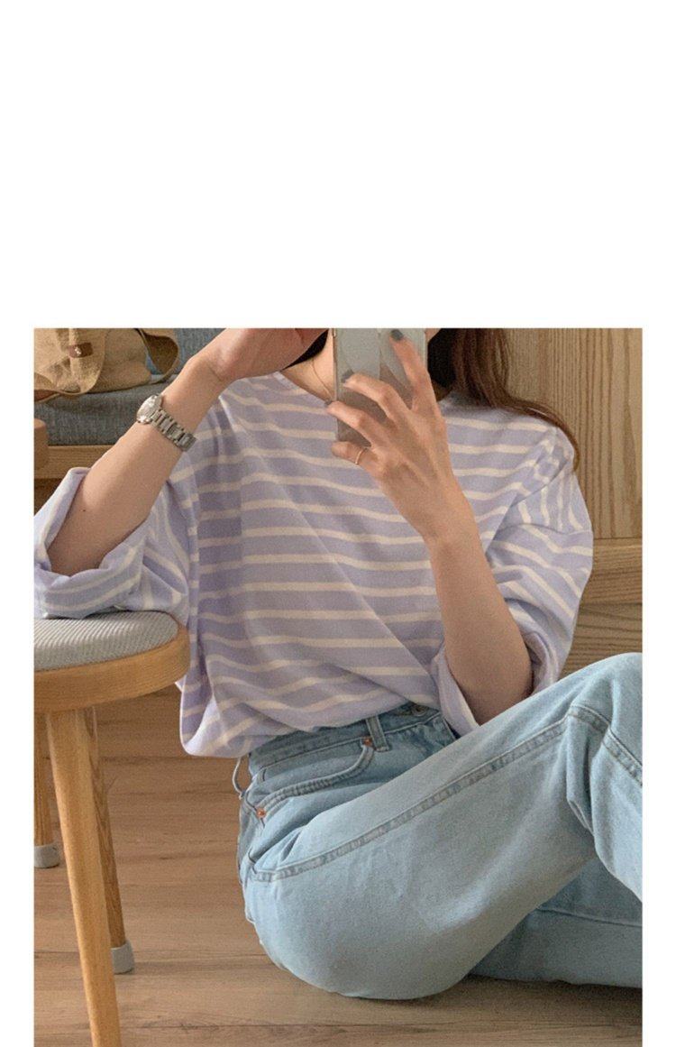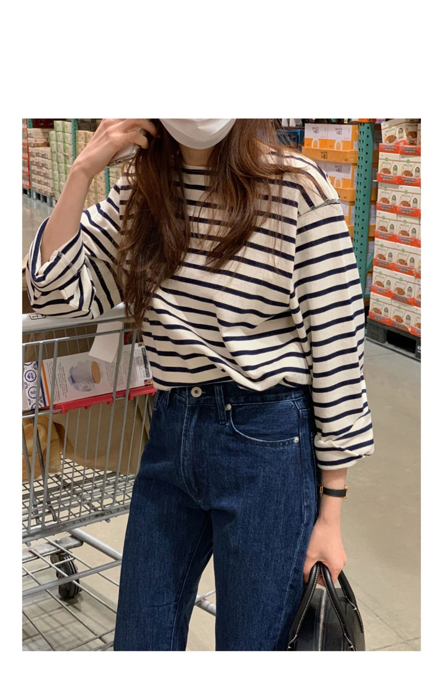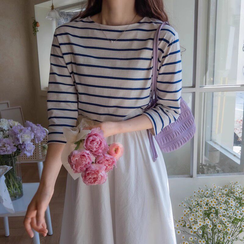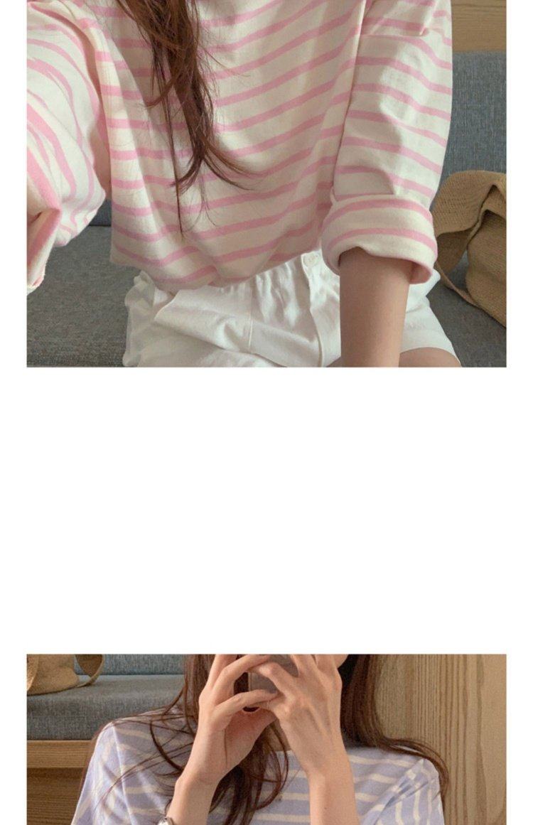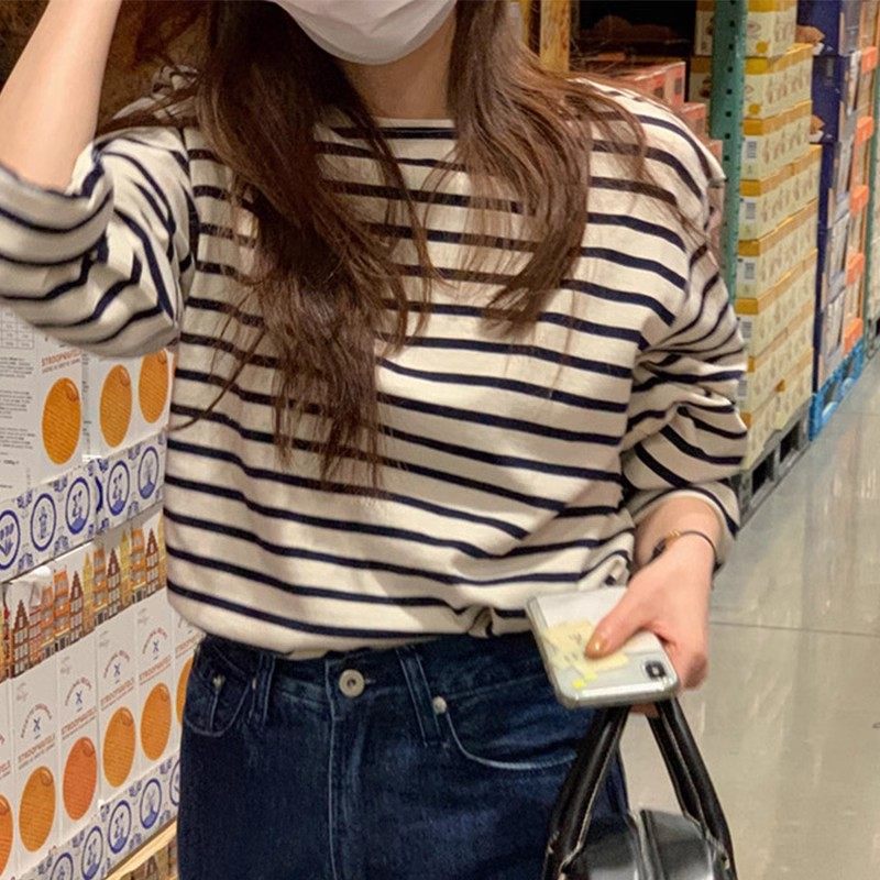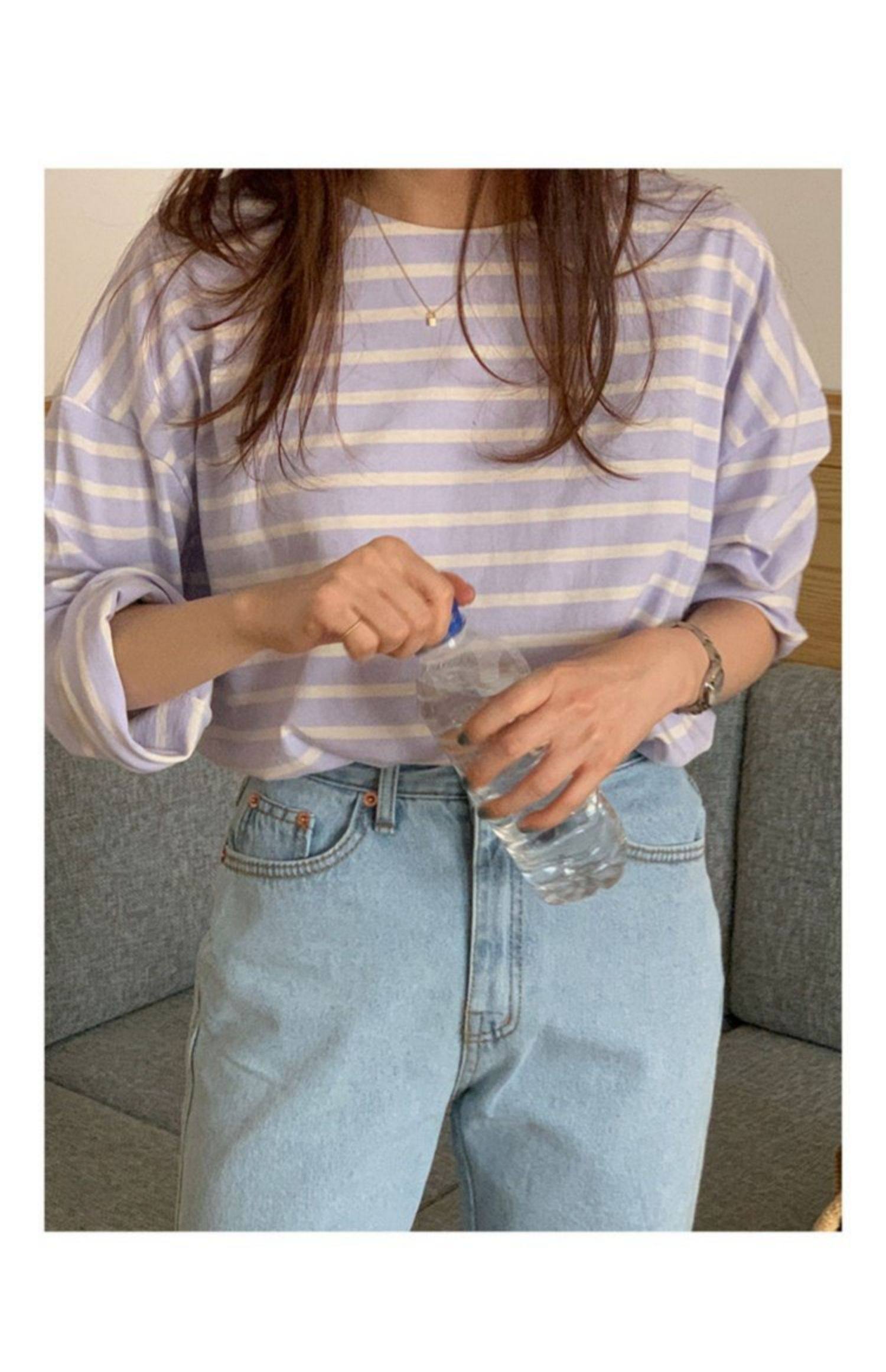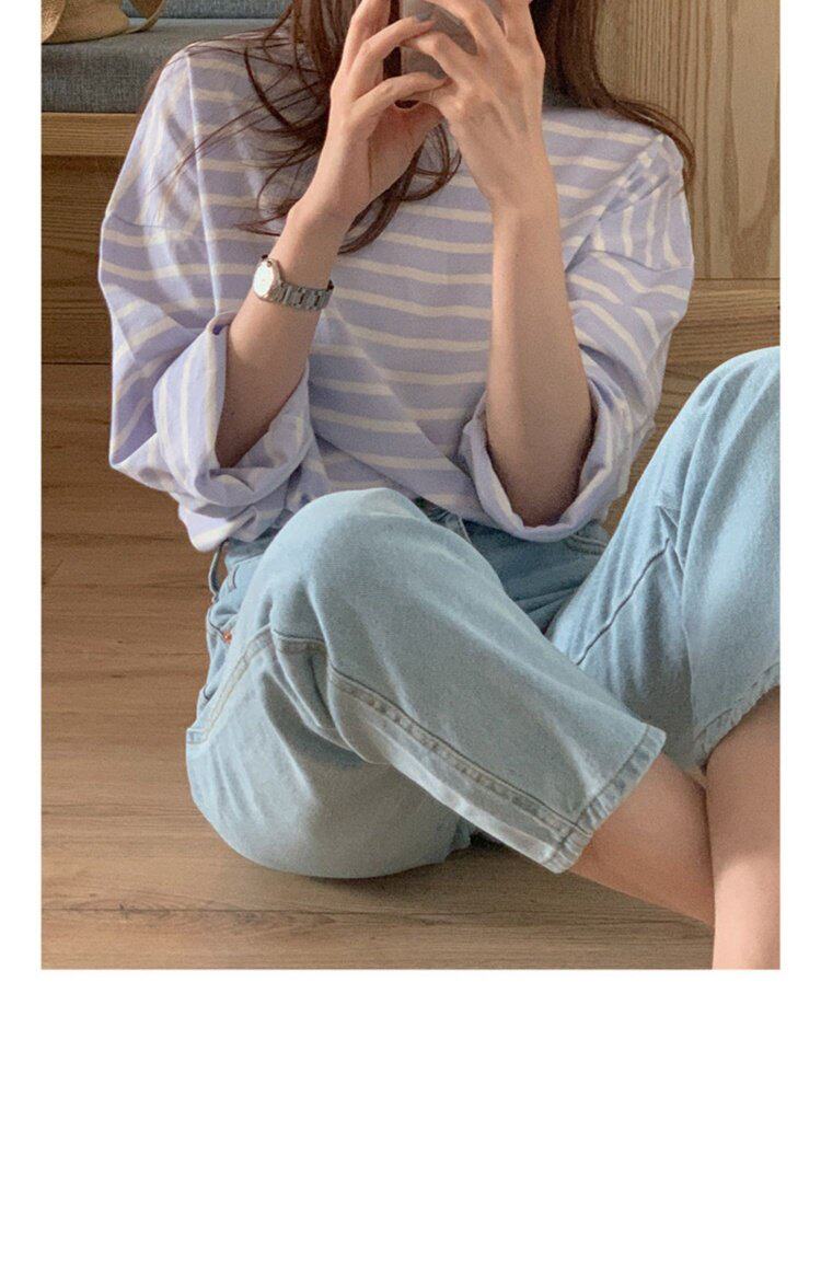 韓版粉色條紋T恤女2025春新款寬鬆長袖休閒長袖打底衫設計感上衣