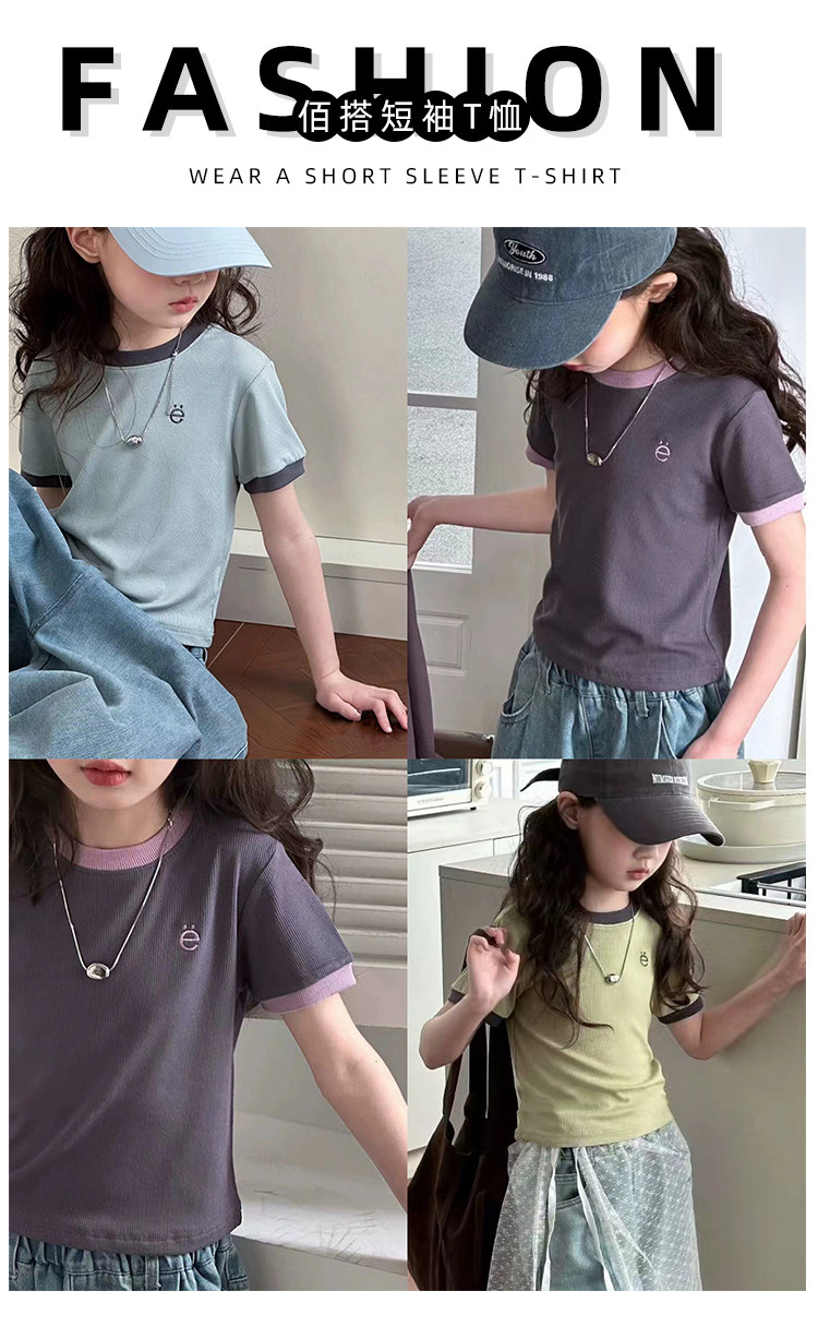 女童短款T恤2026夏新款中大童螺紋修身小t女孩子刺綉百搭短袖童裝