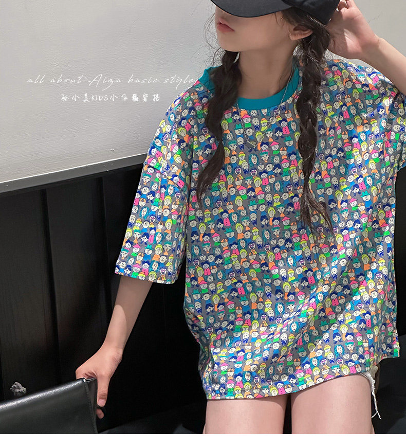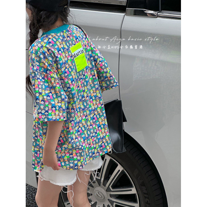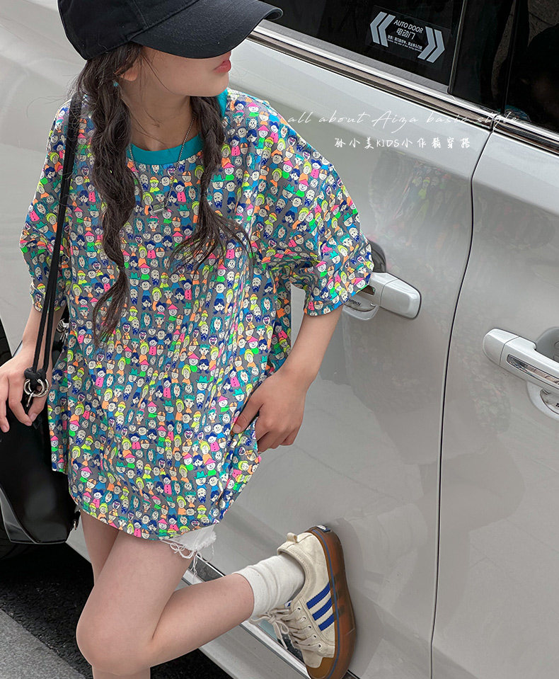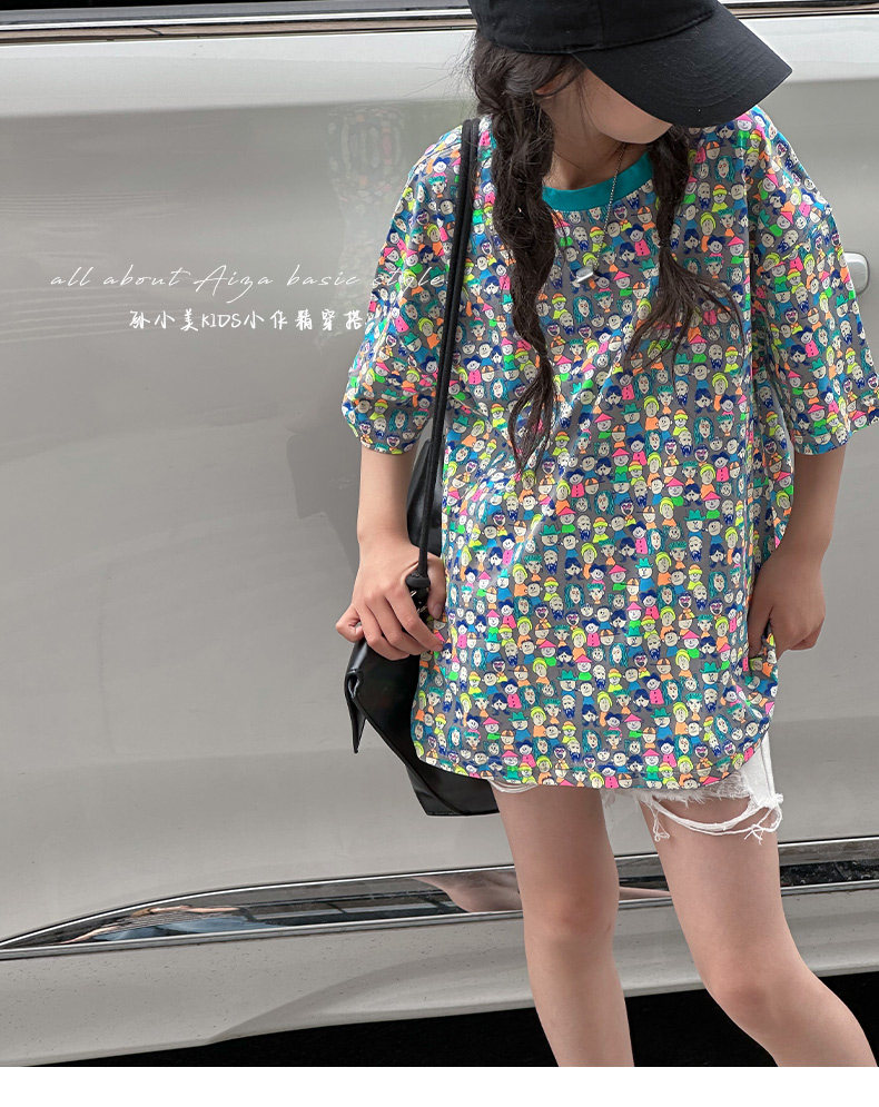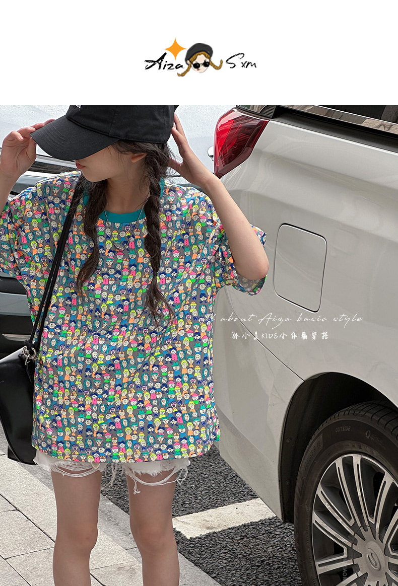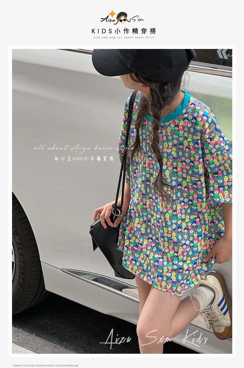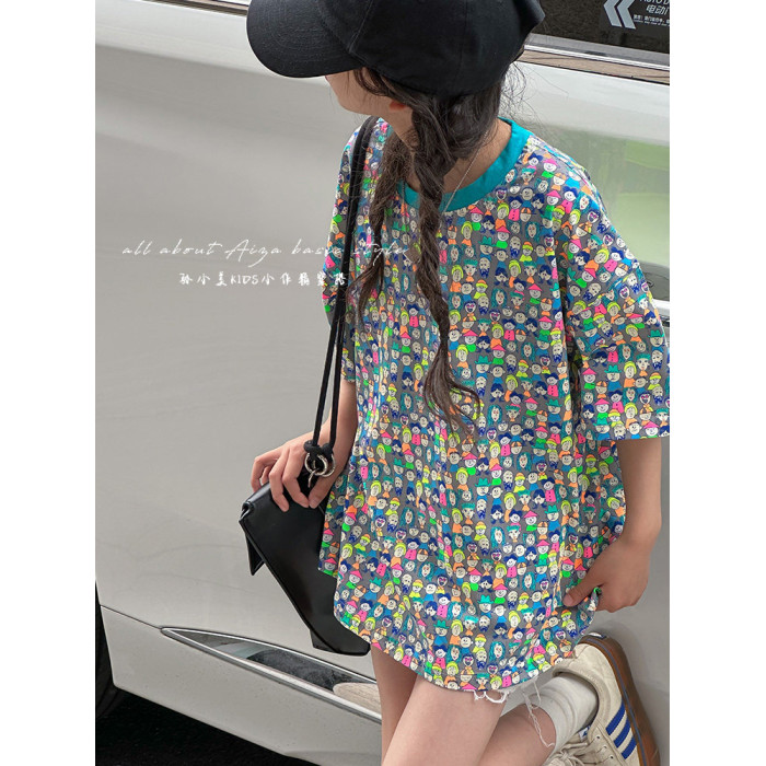 設計師新款時髦滿印女童短袖T恤兒童上衣2025夏裝韓國童裝寬鬆潮t