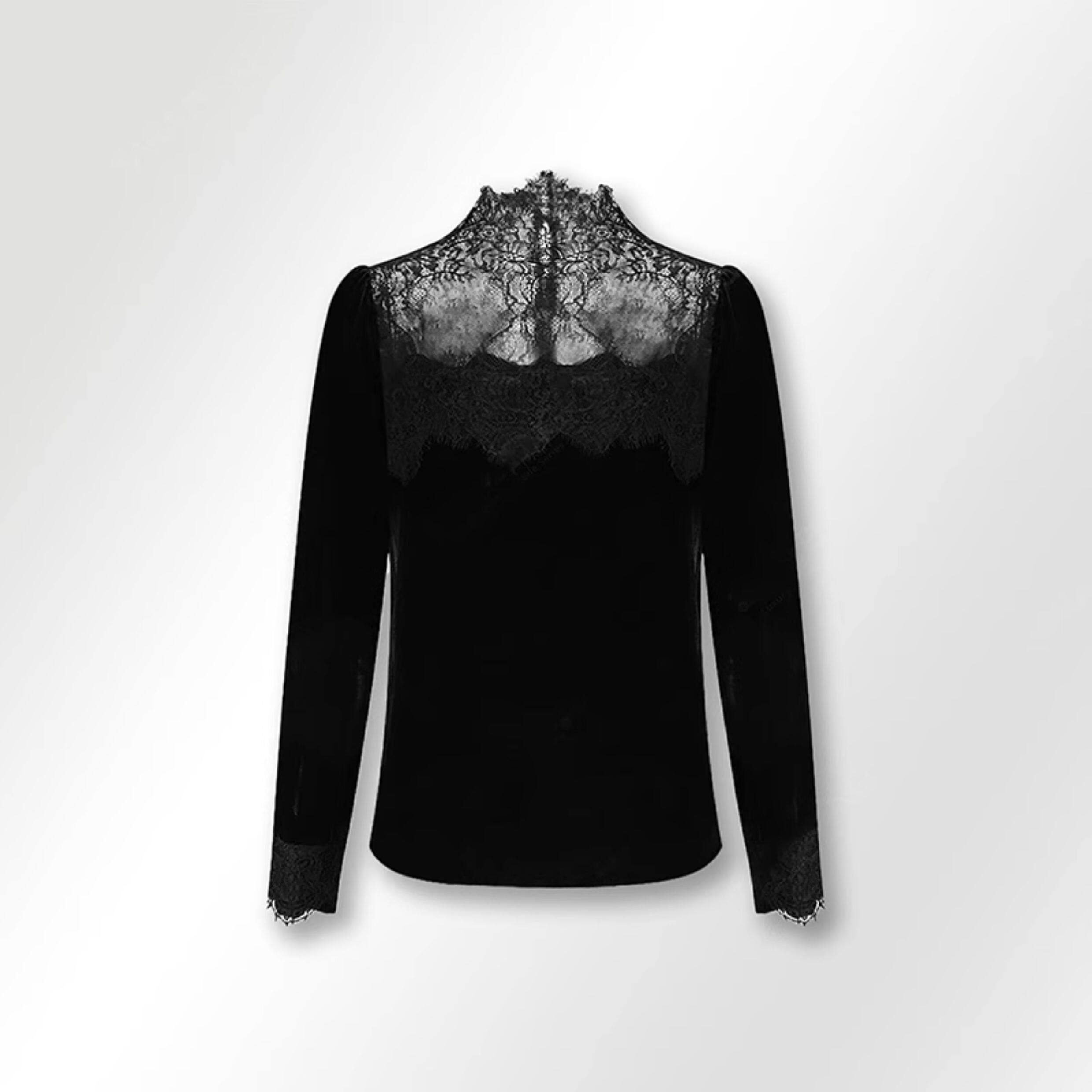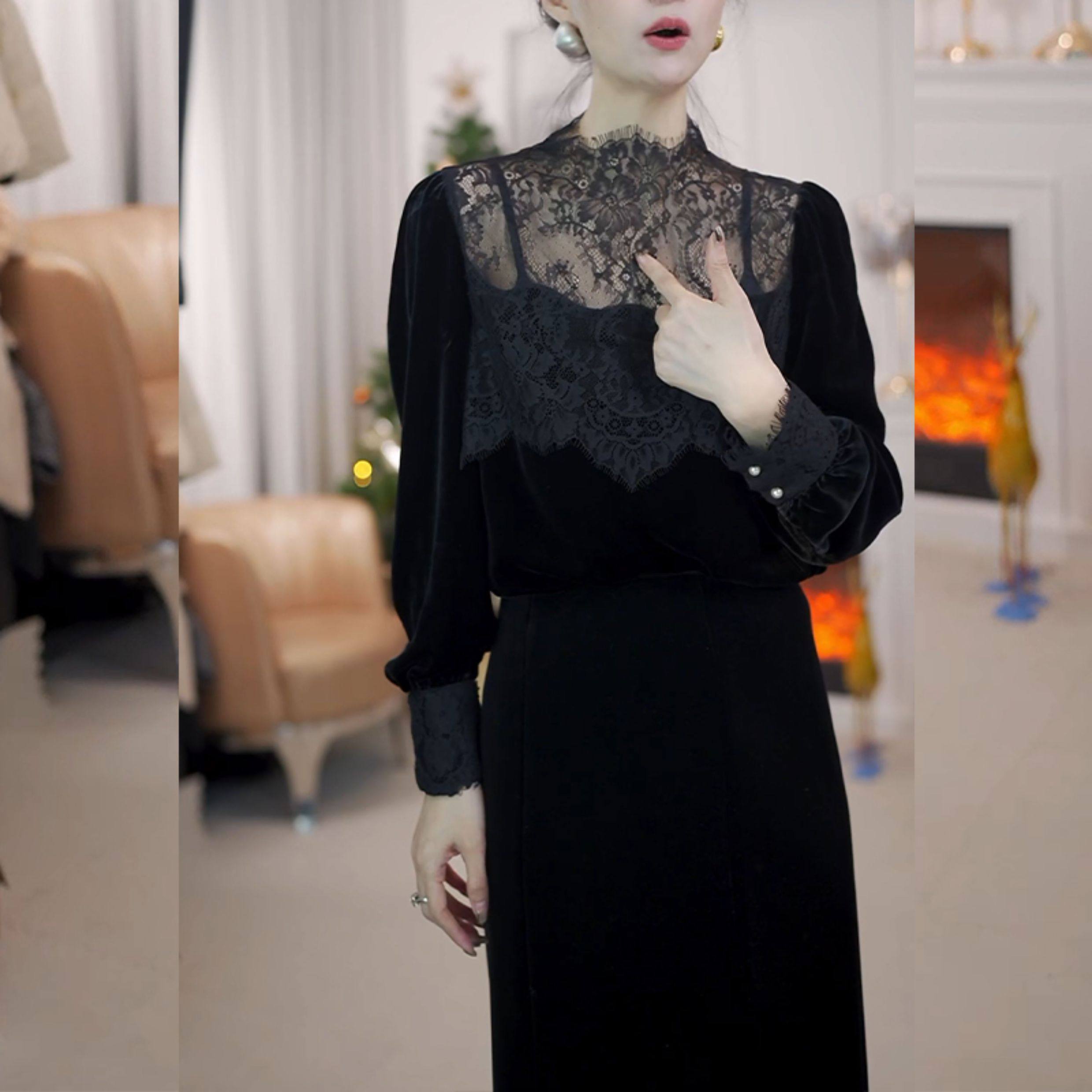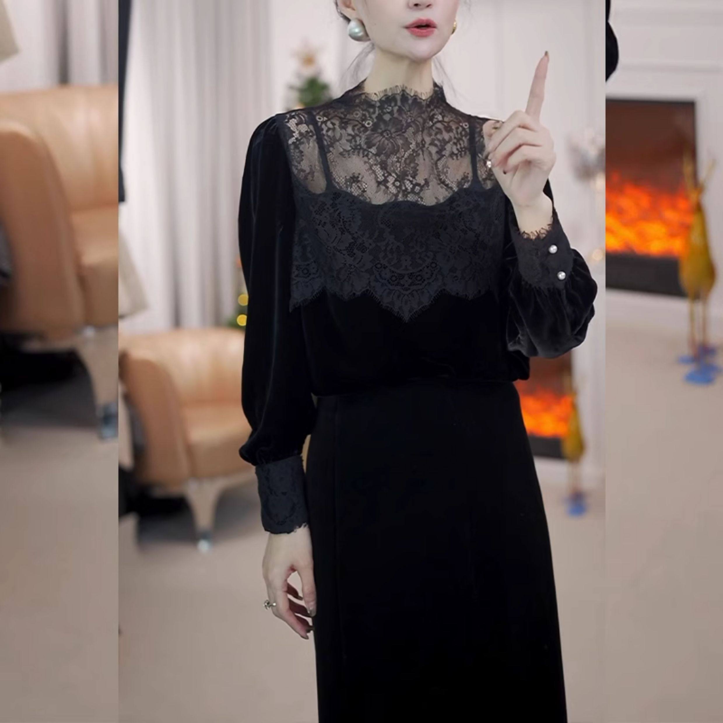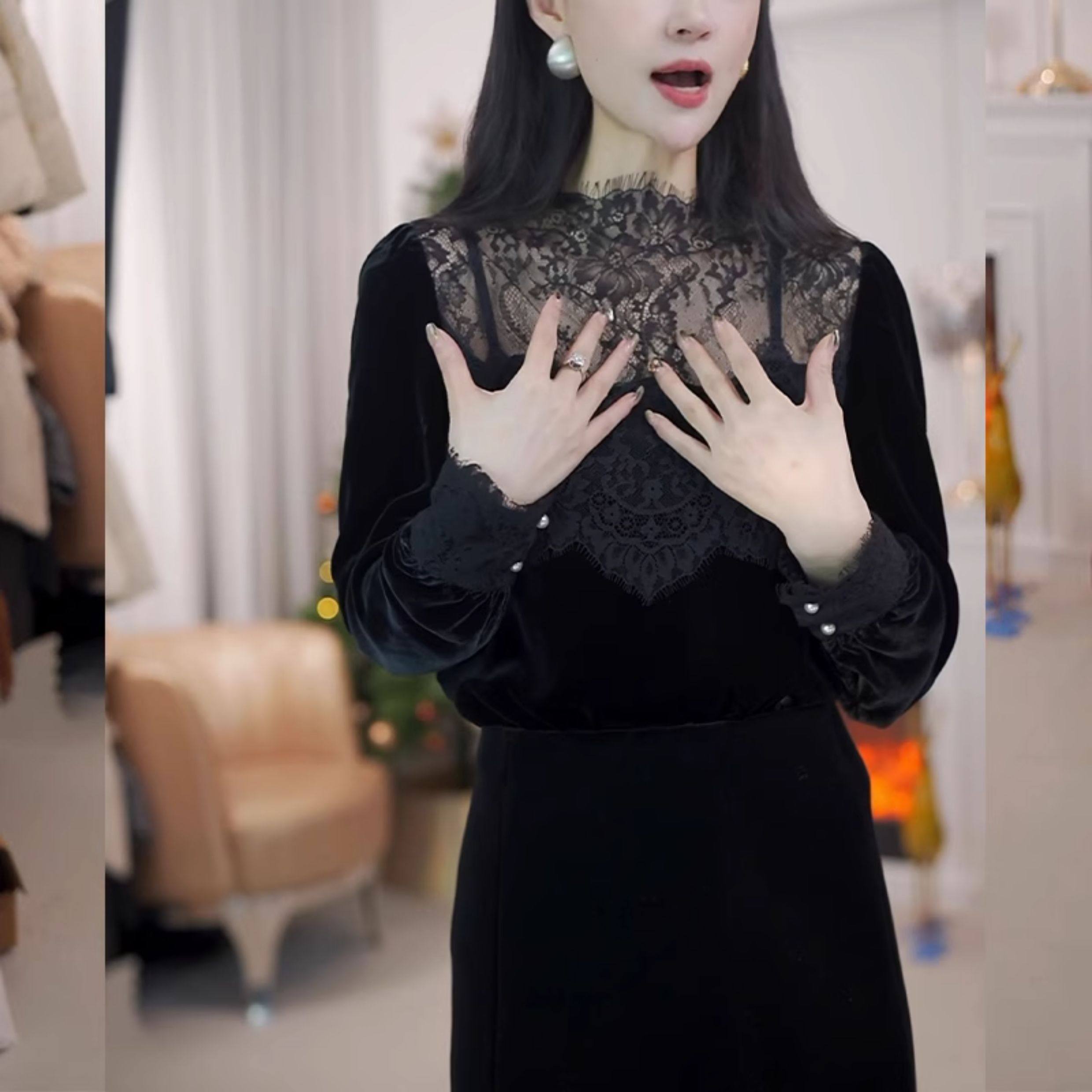 2025年秋季法式鏤空設計黑色絲絨上衣大碼女裝胖MM蕾絲拼接打底衫