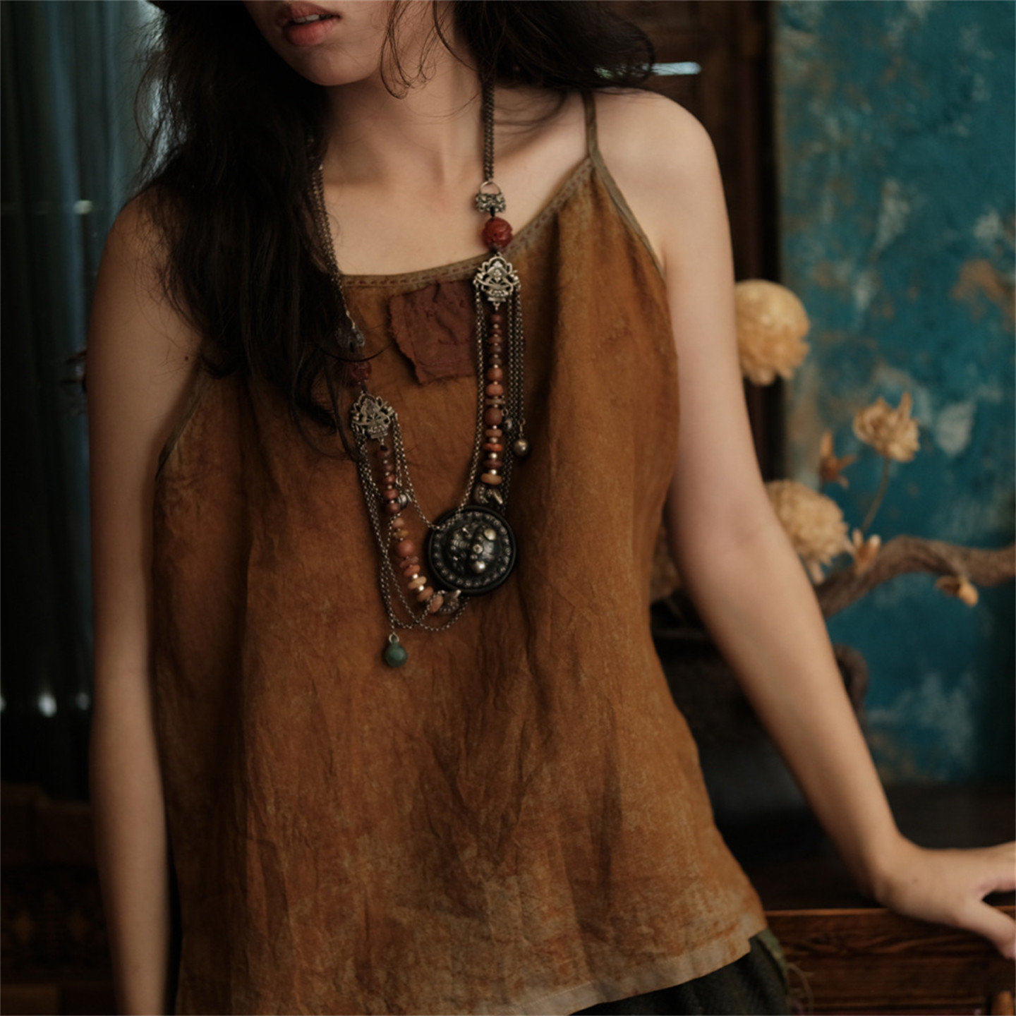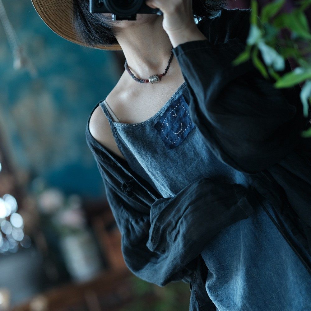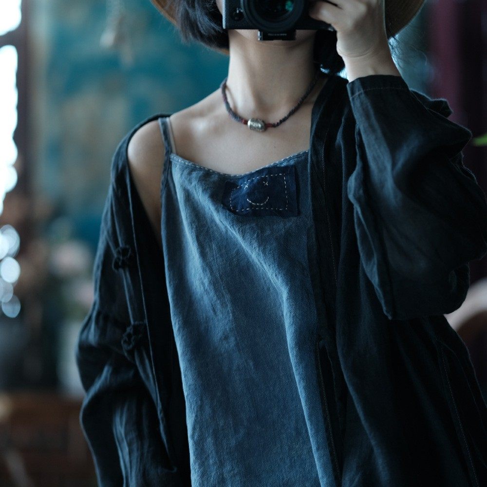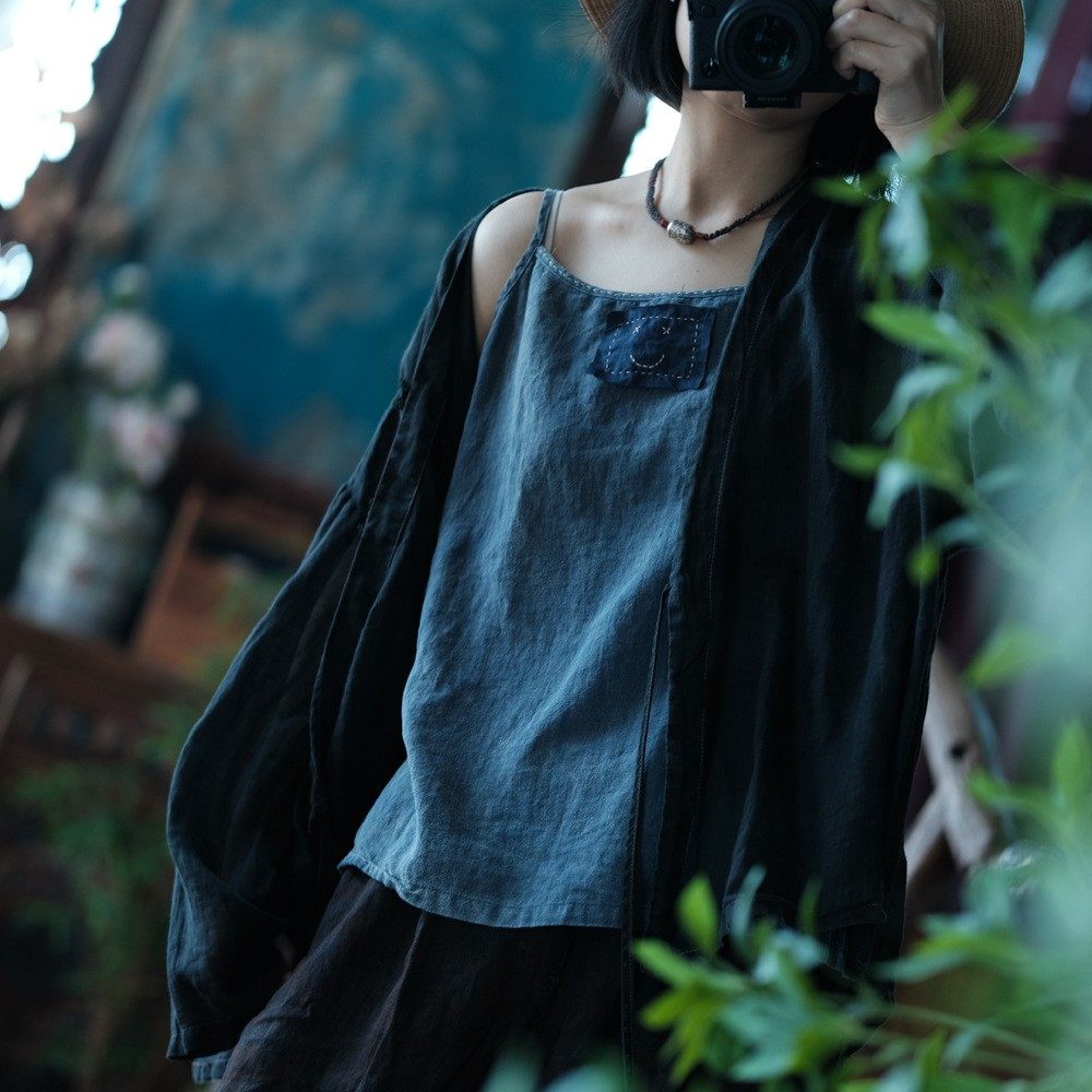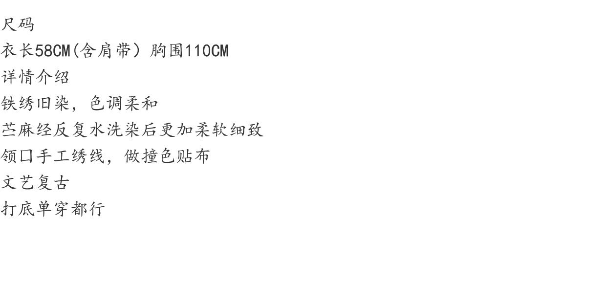 斑駁鐵綉染做舊麻料復古文藝吊帶衫幾見手工線跡貼布小背心基本款