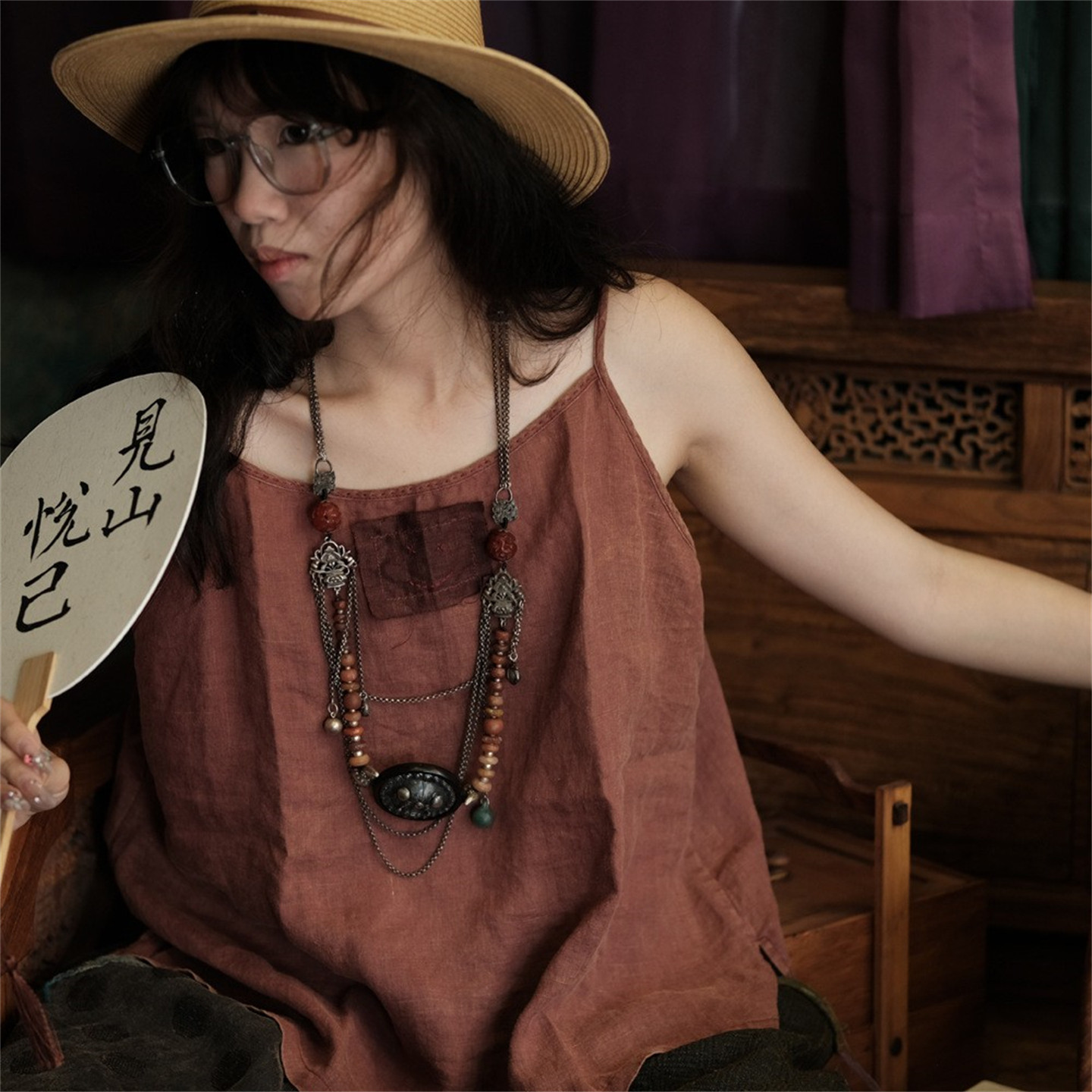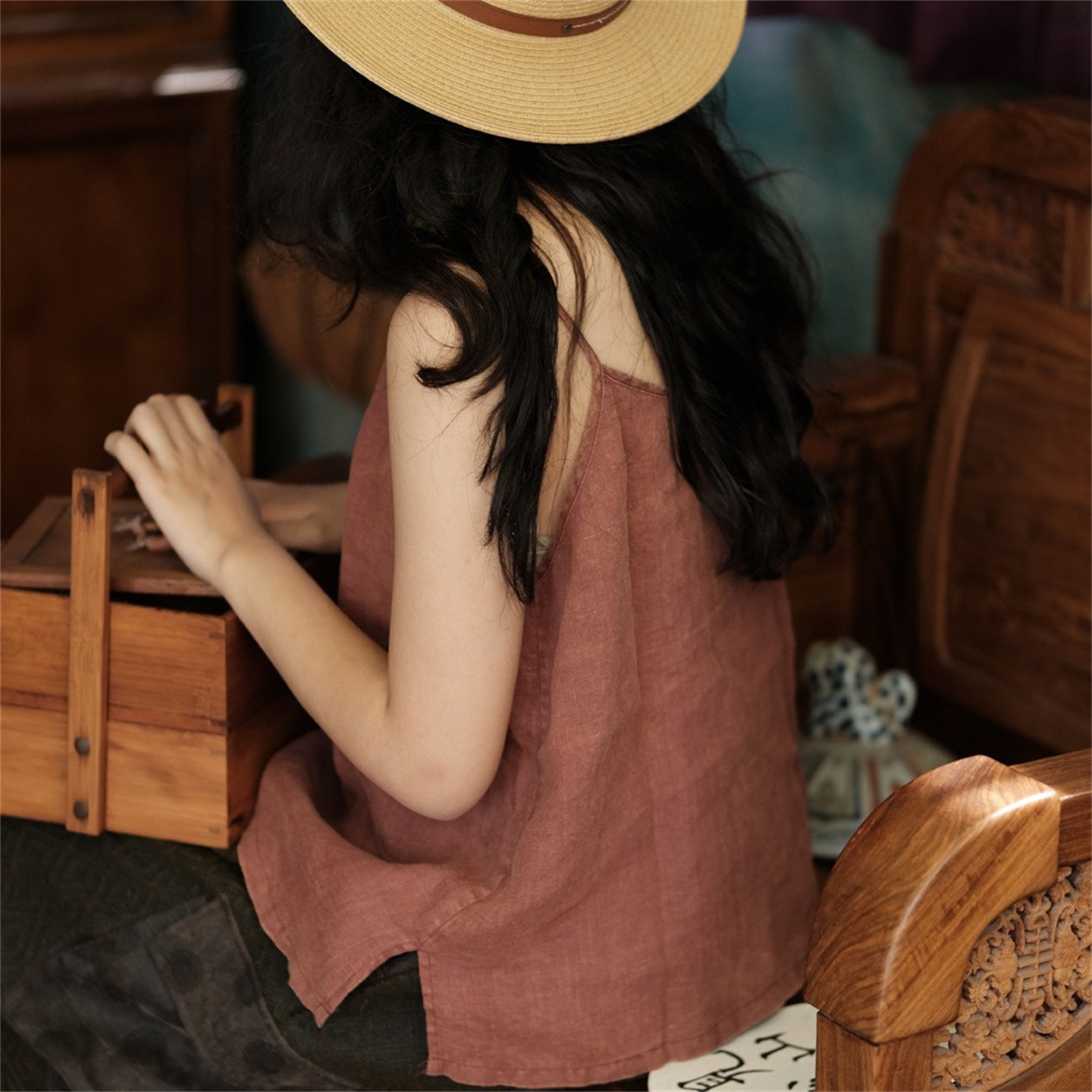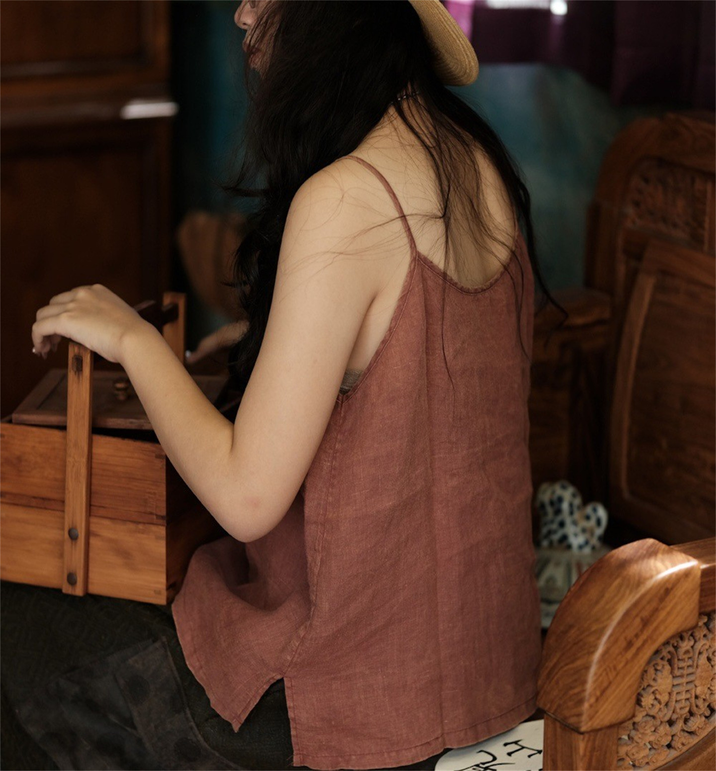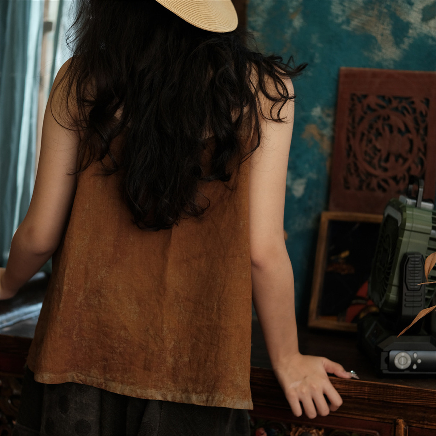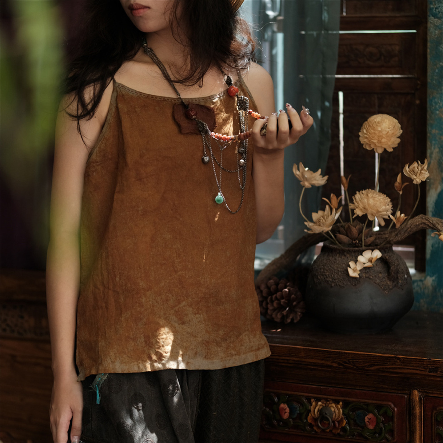 斑駁鐵綉染做舊麻料復古文藝吊帶衫幾見手工線跡貼布小背心基本款
