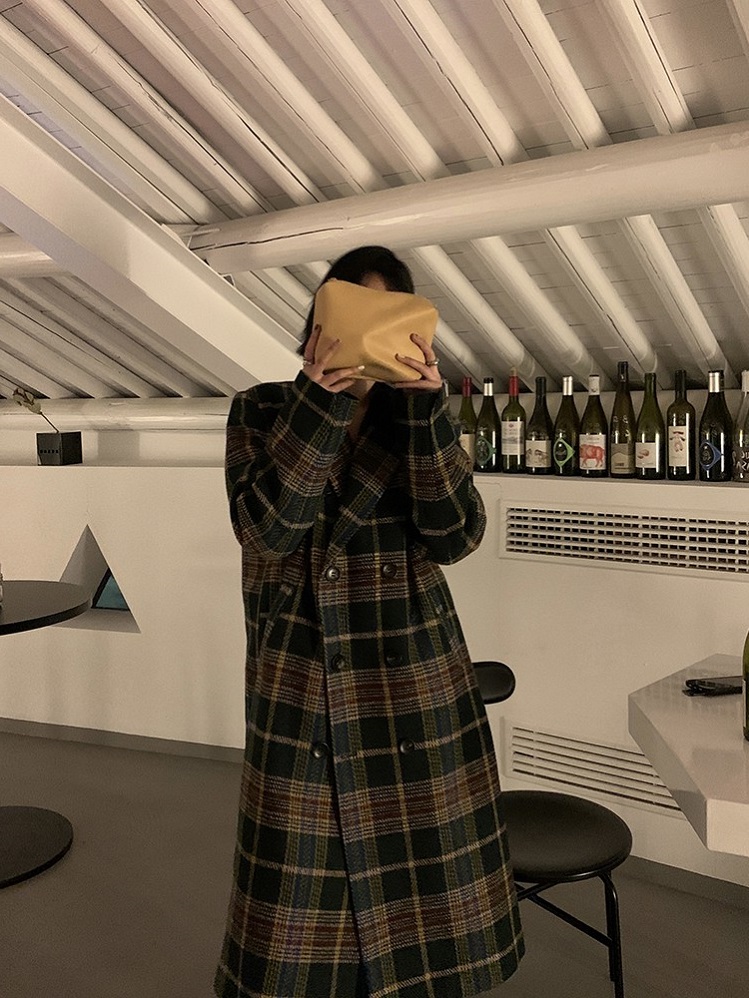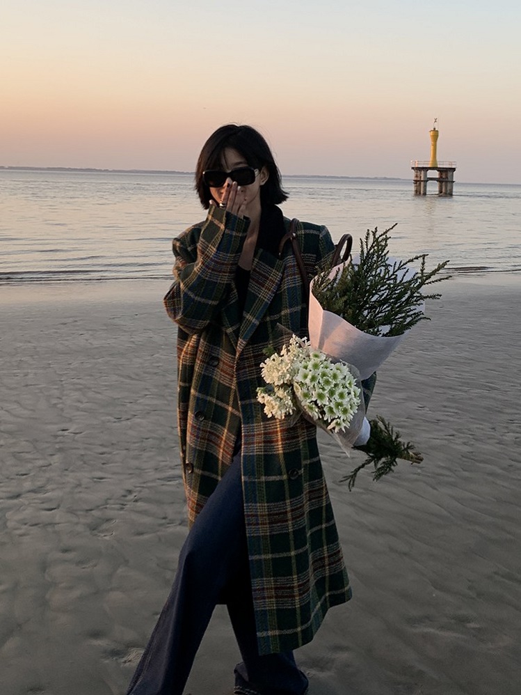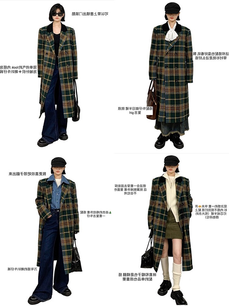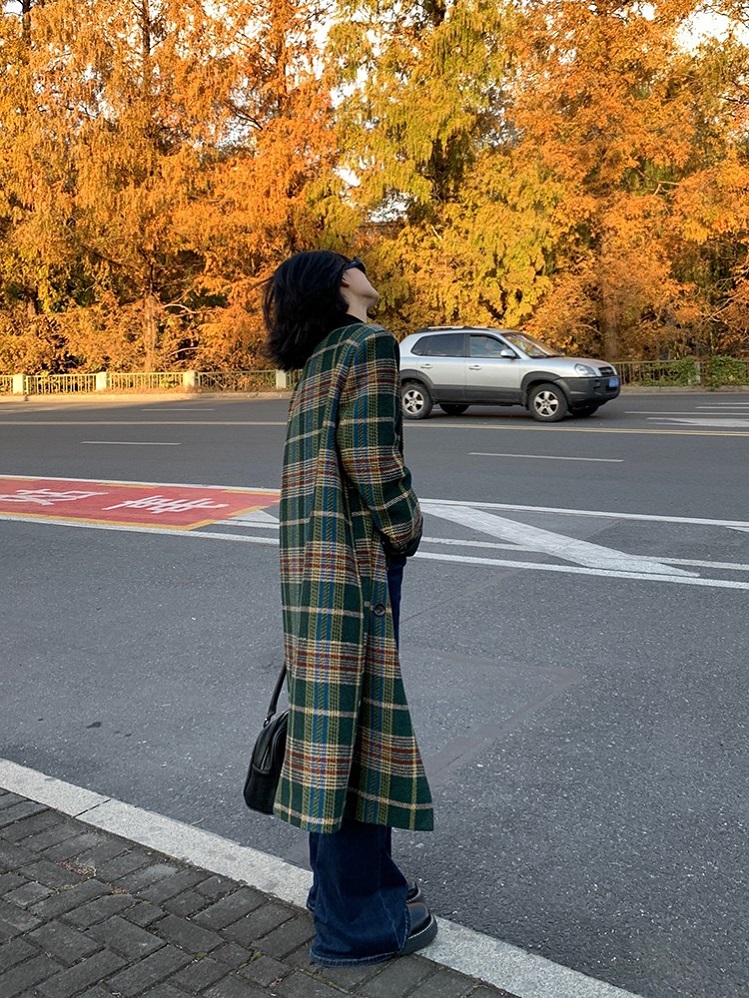 聖誕綠格子毛呢外套女冬季加厚古著vintage呢子大衣