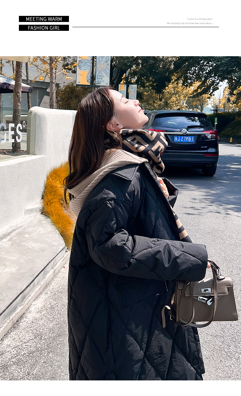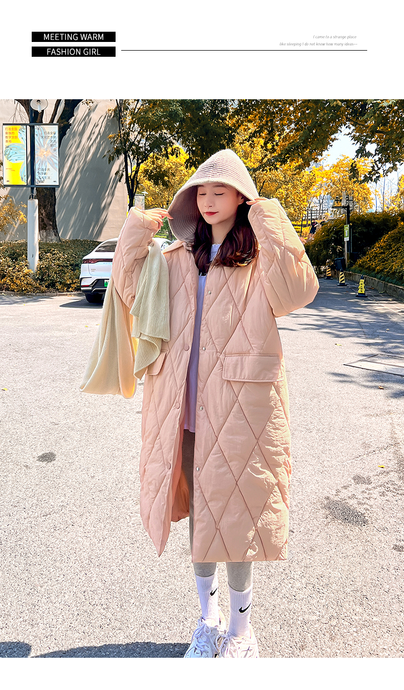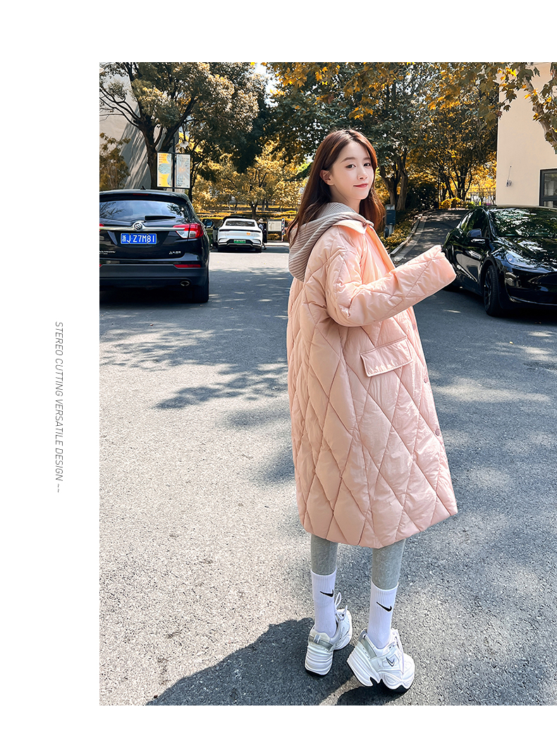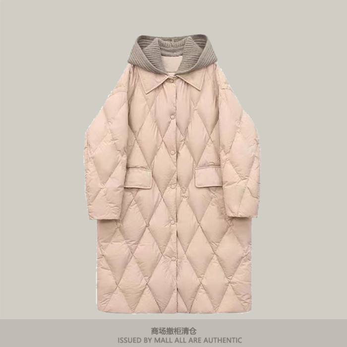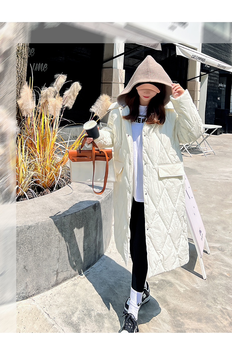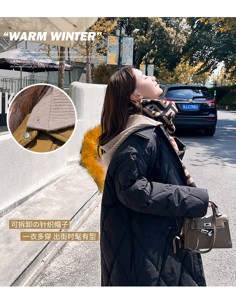 撤櫃韓版針織帽羽絨棉服女中長款冬寬松連帽菱形格過膝羽絨棉外套