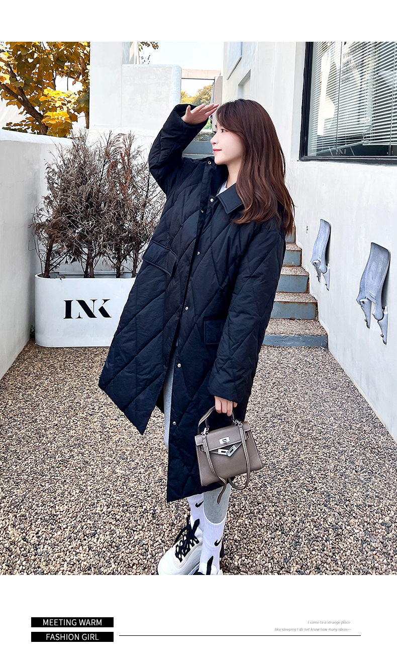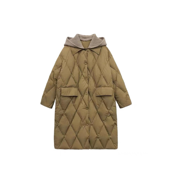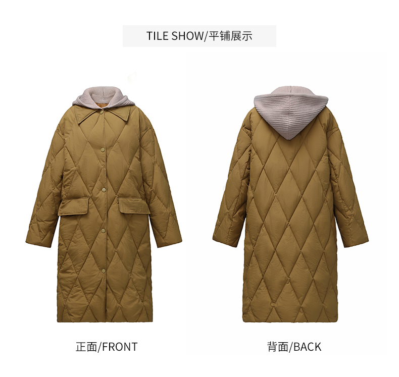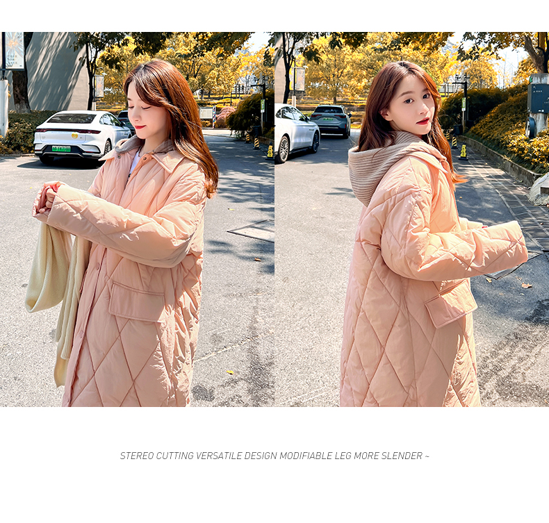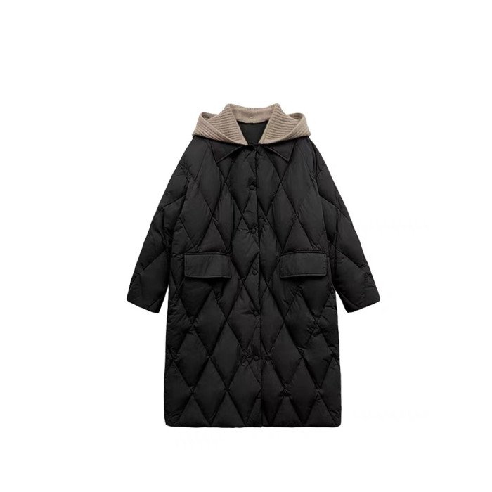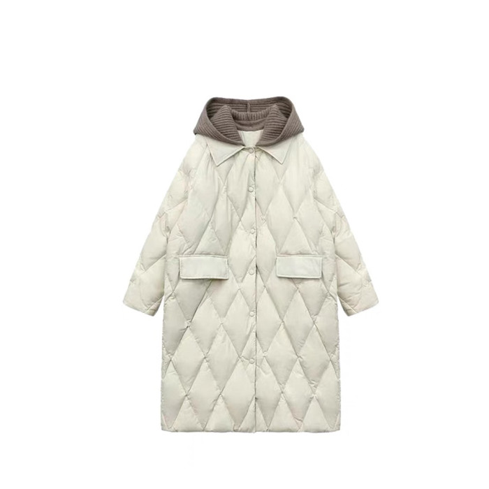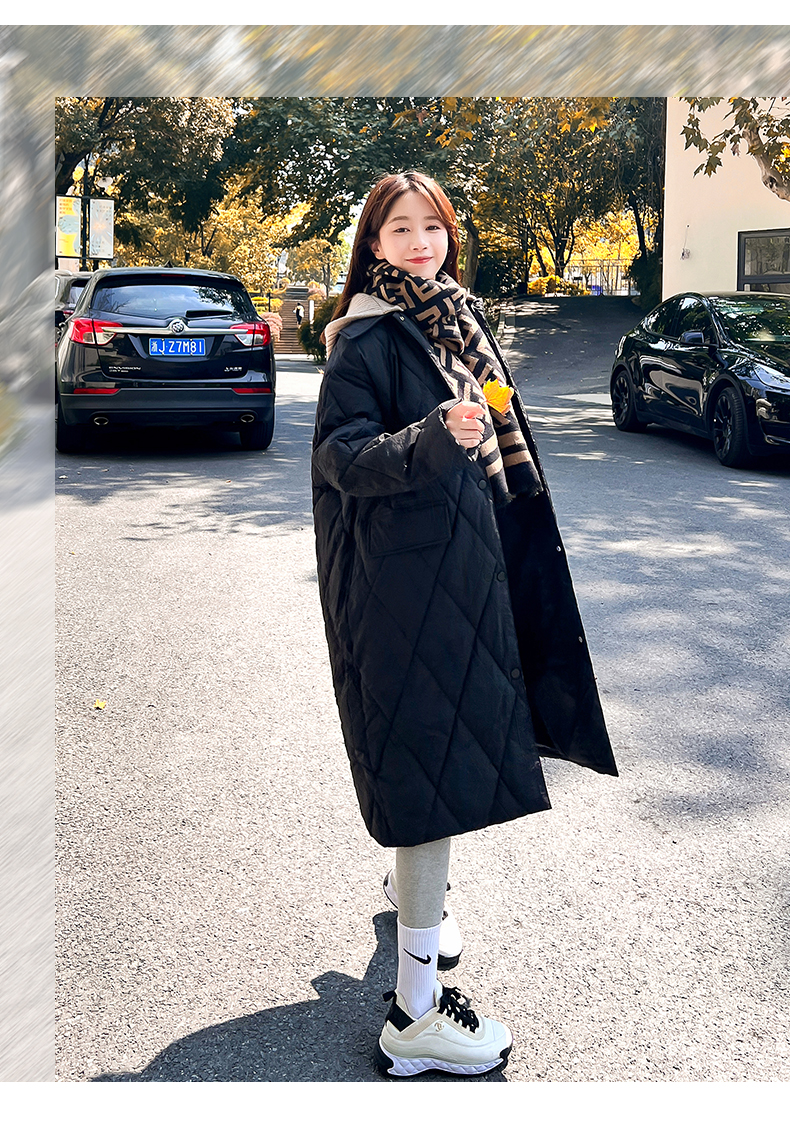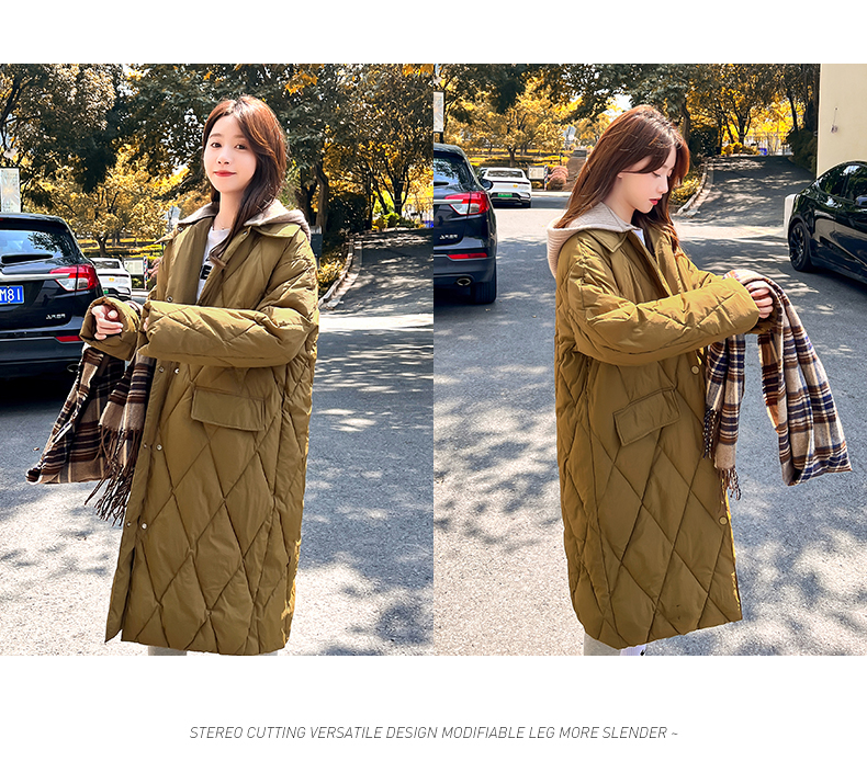 撤櫃韓版針織帽羽絨棉服女中長款冬寬松連帽菱形格過膝羽絨棉外套