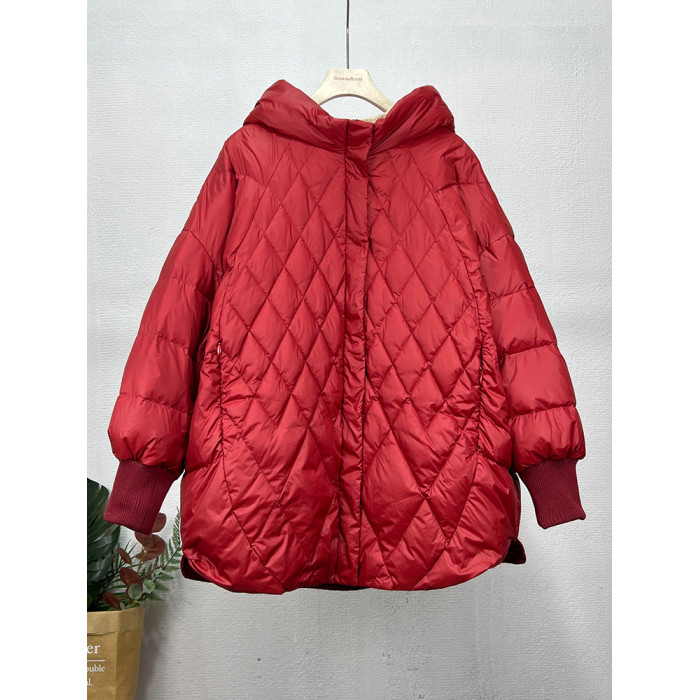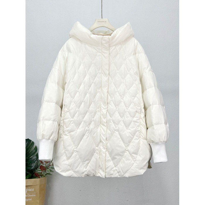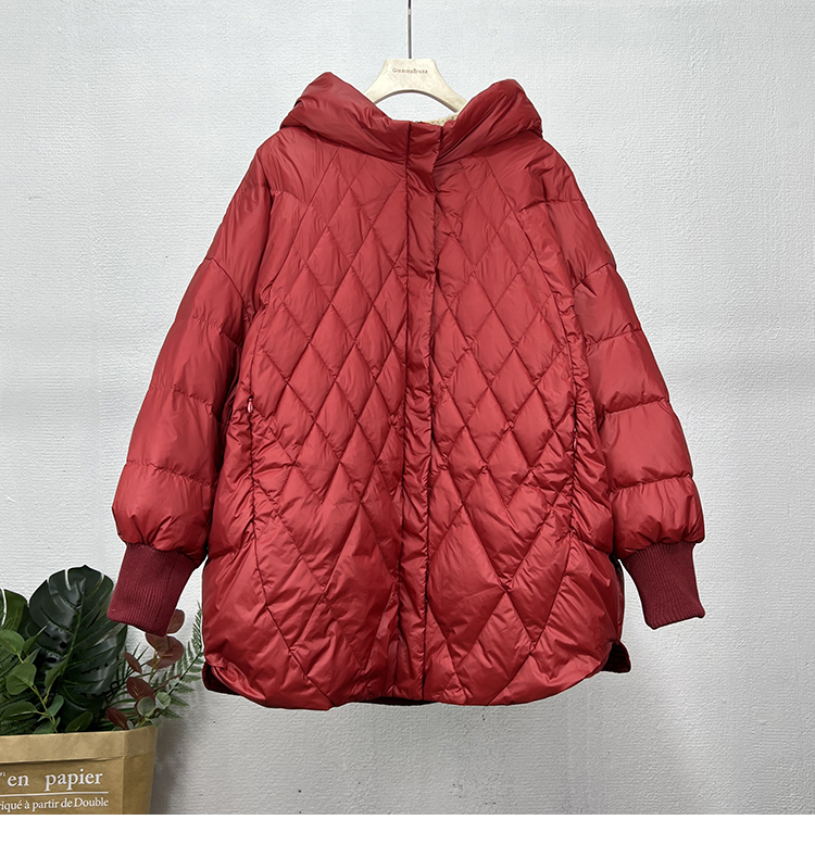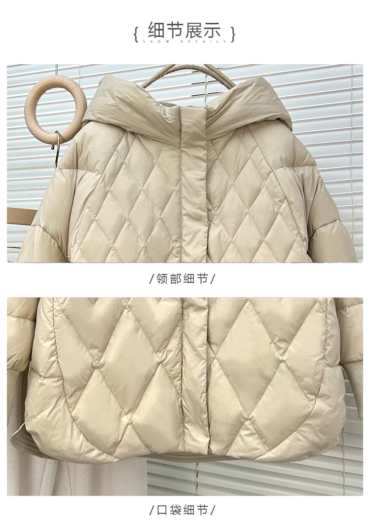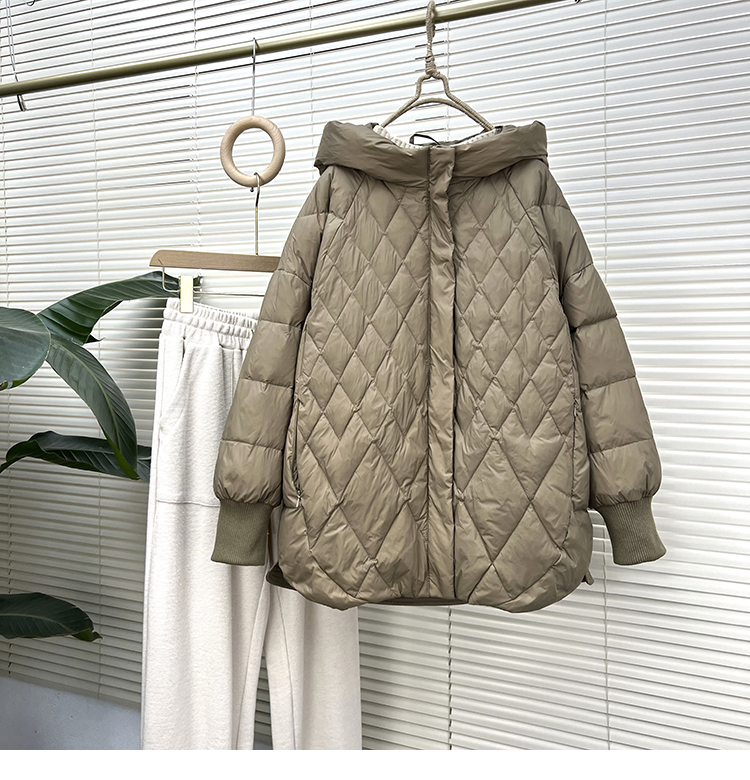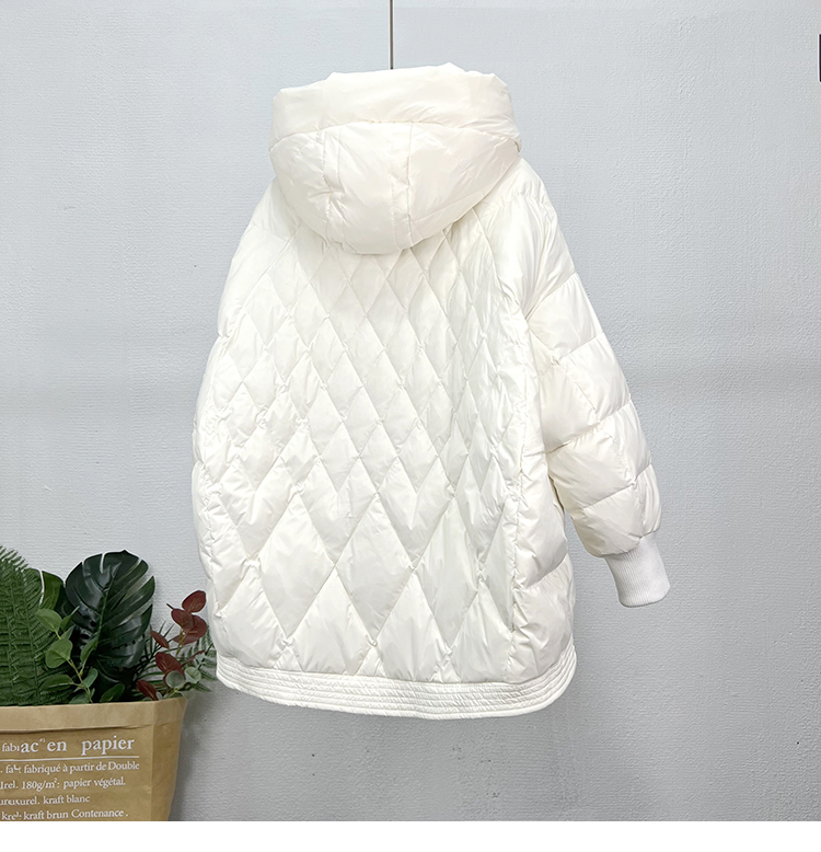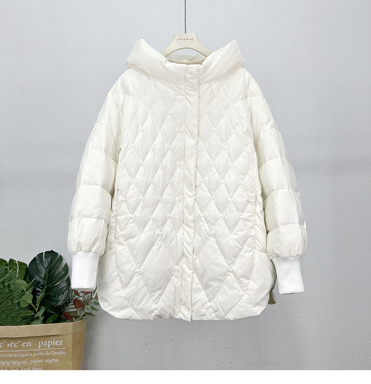 反季2025年新款中長款連帽羽絨服女繭型寬松白鴨絨時尚菱形格大碼