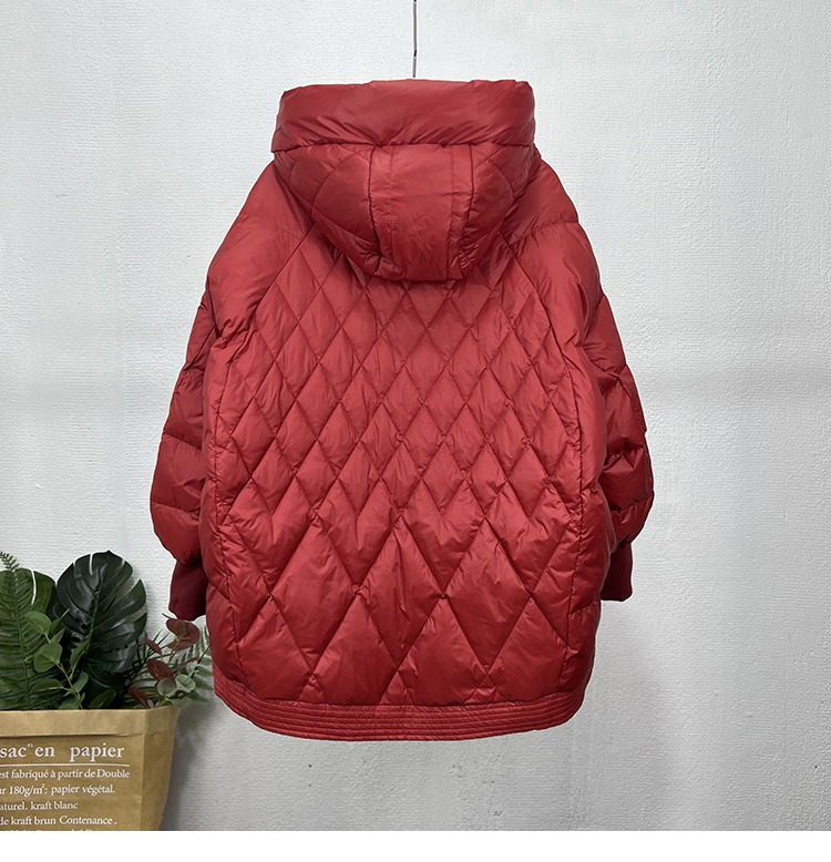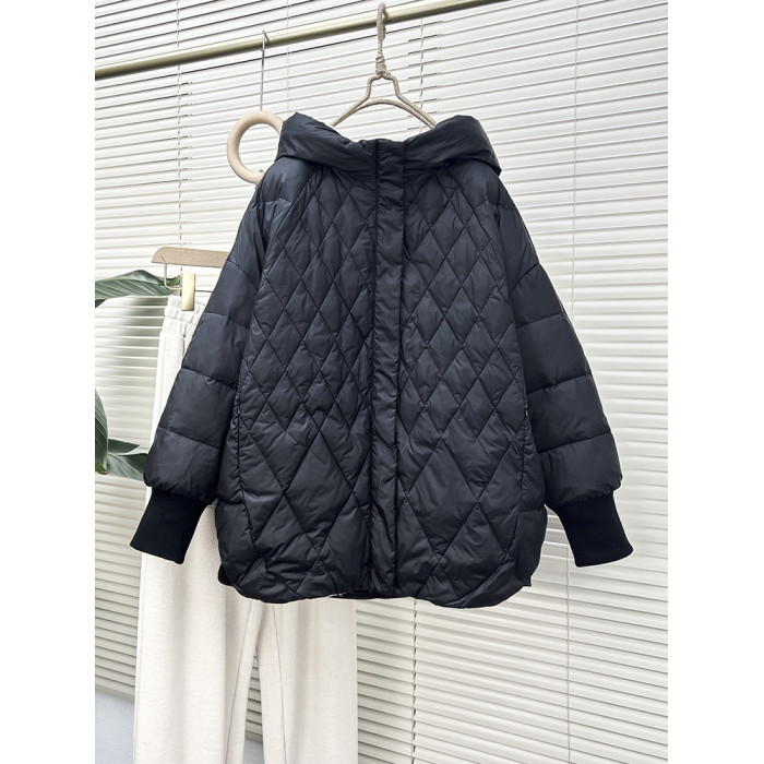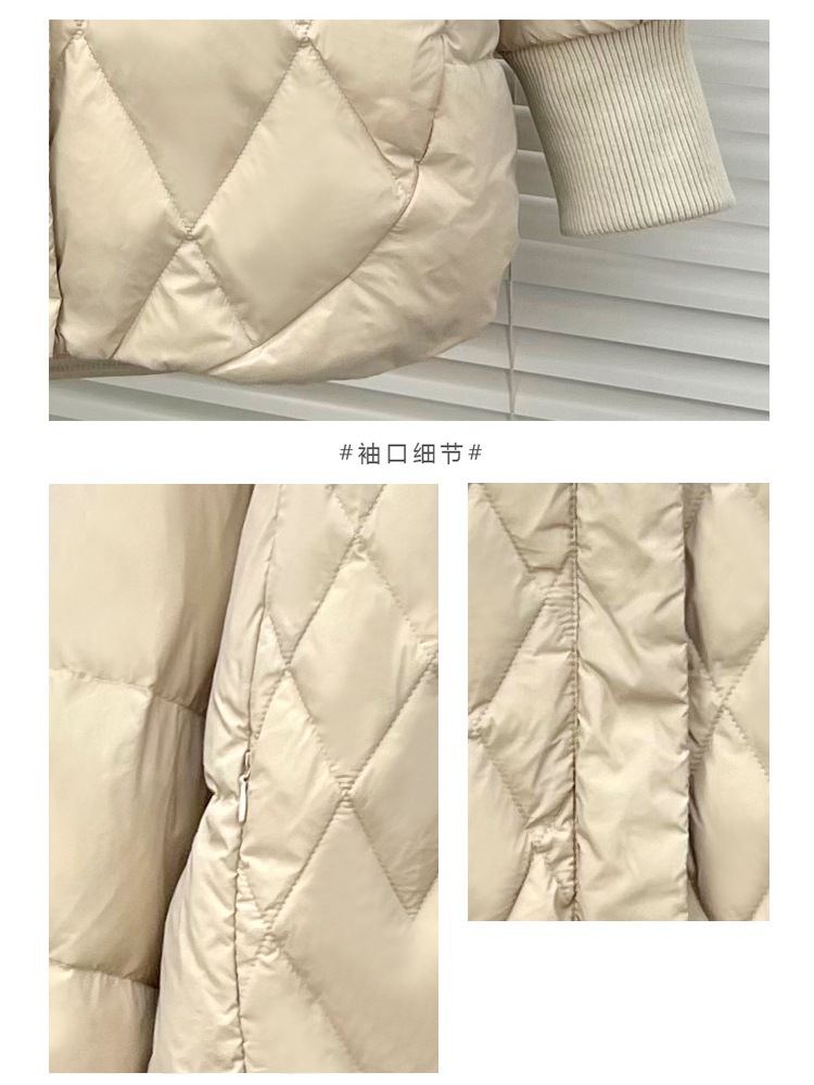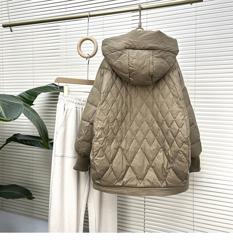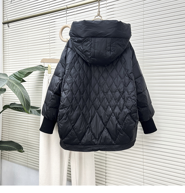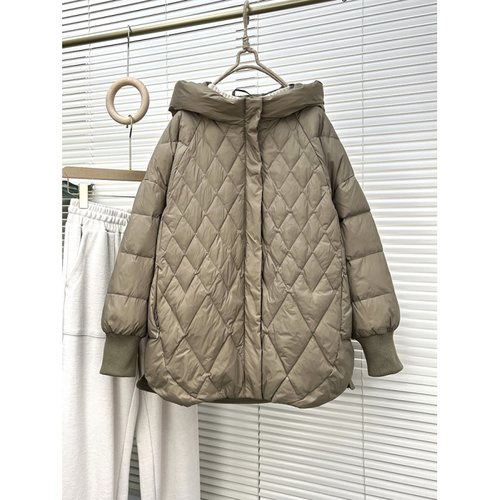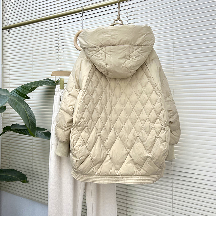反季2025年新款中長款連帽羽絨服女繭型寬松白鴨絨時尚菱形格大碼