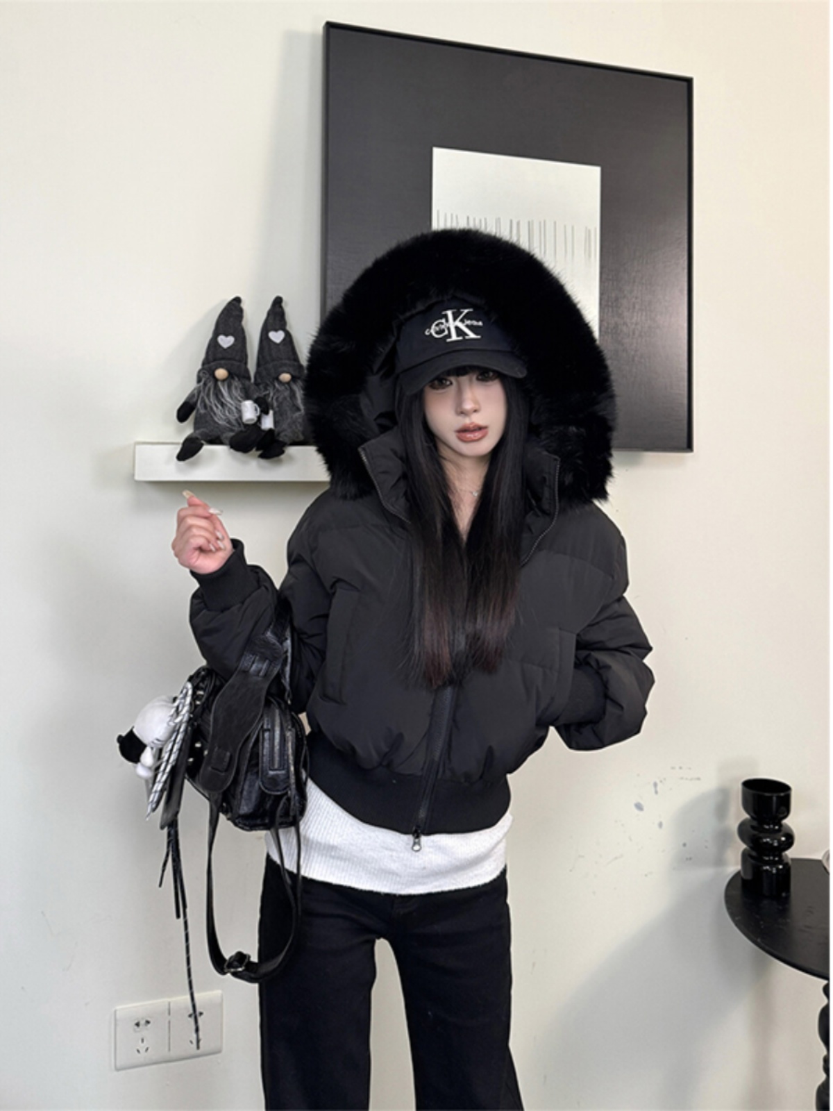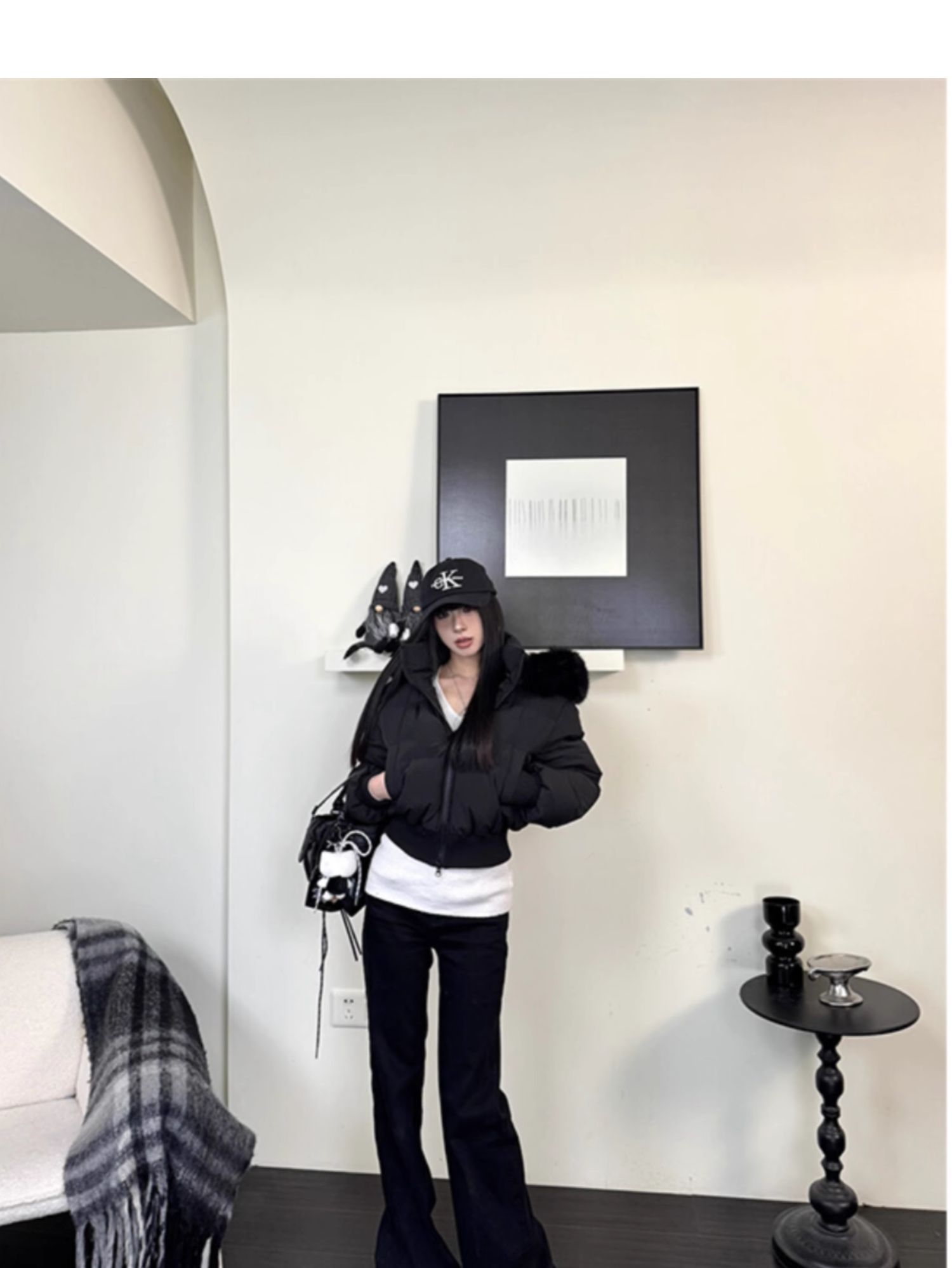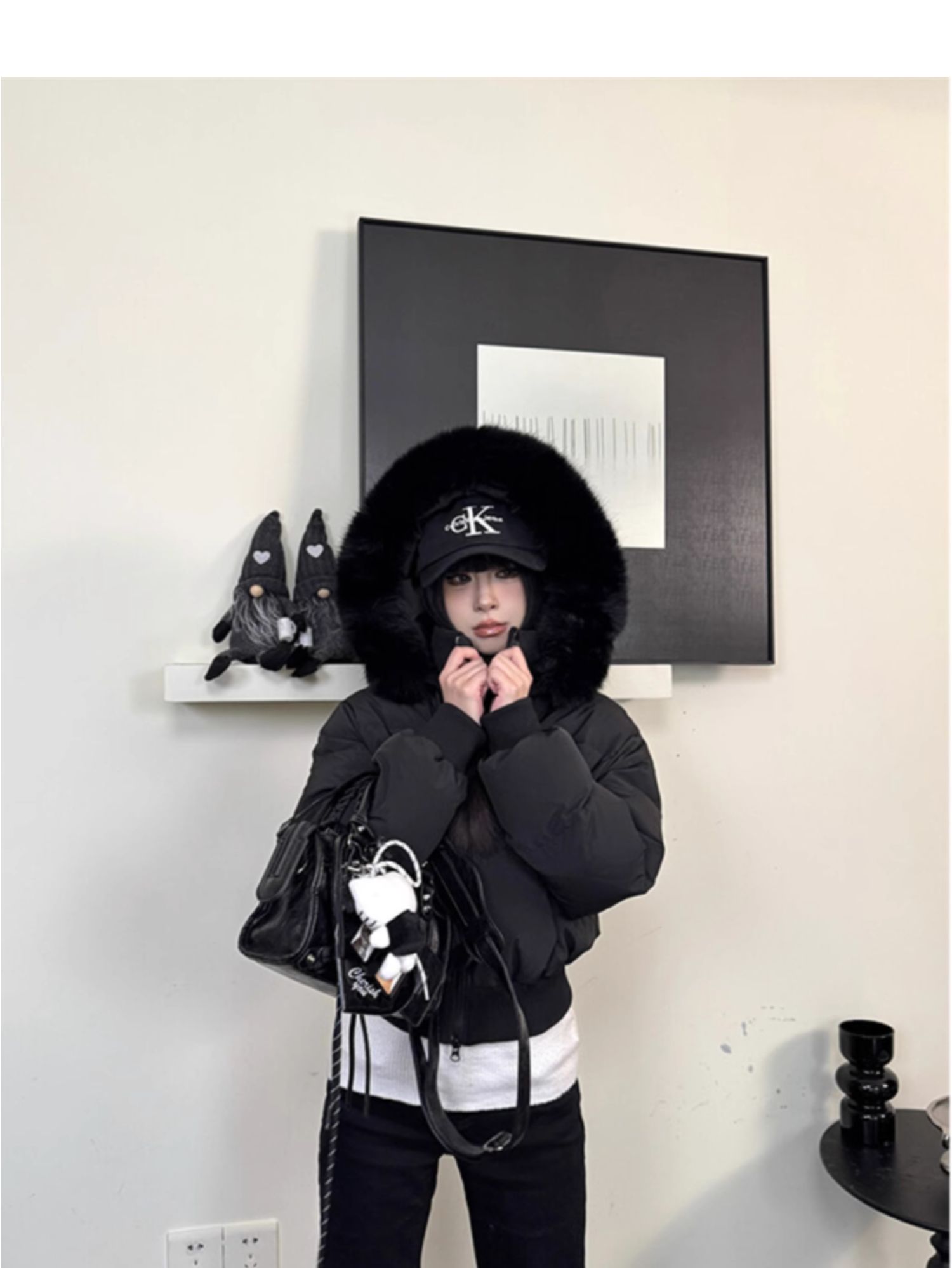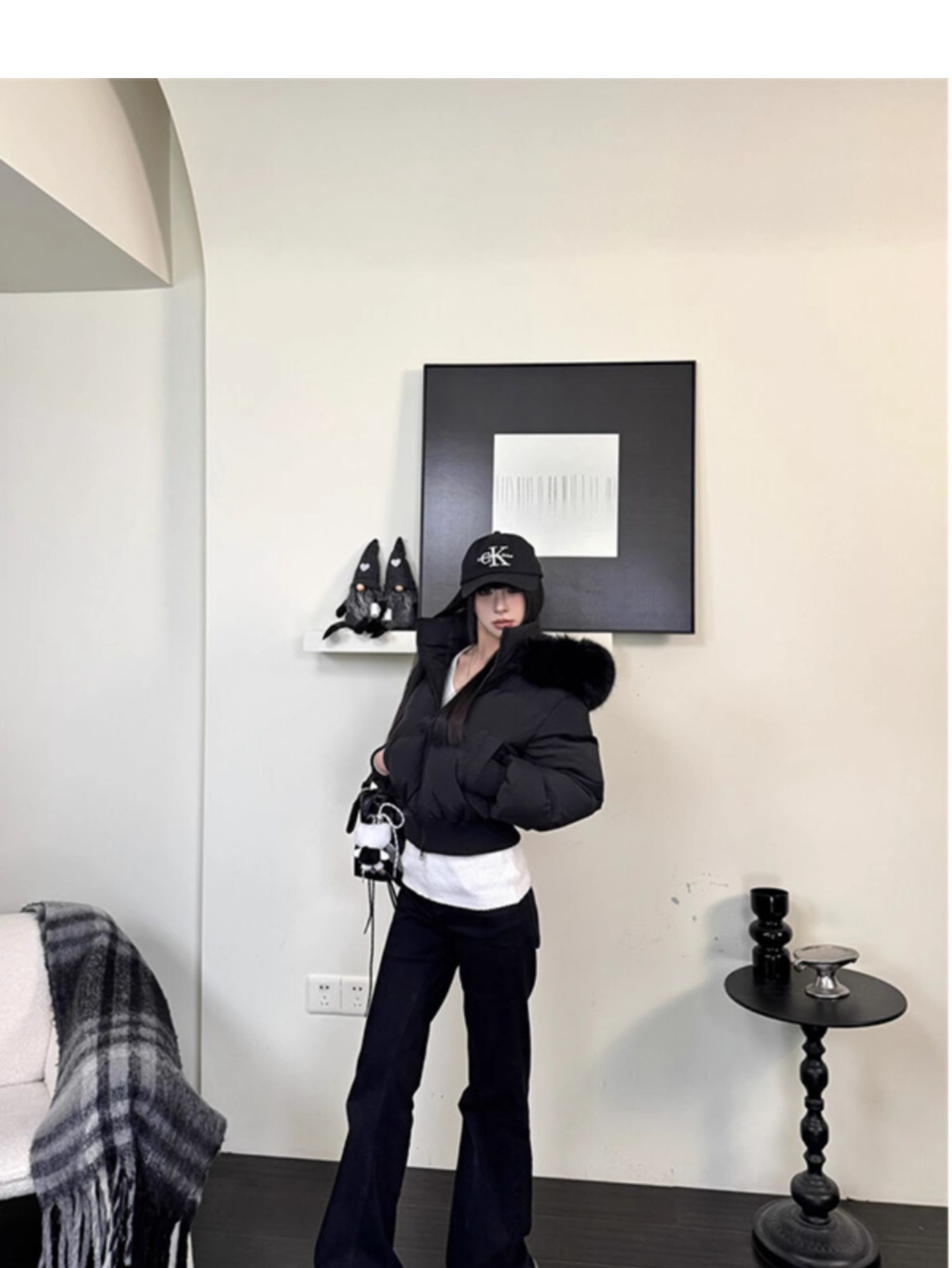 黑色大毛領連帽羽絨棉服女冬季2024新款美式加厚保暖短款棉衣外套