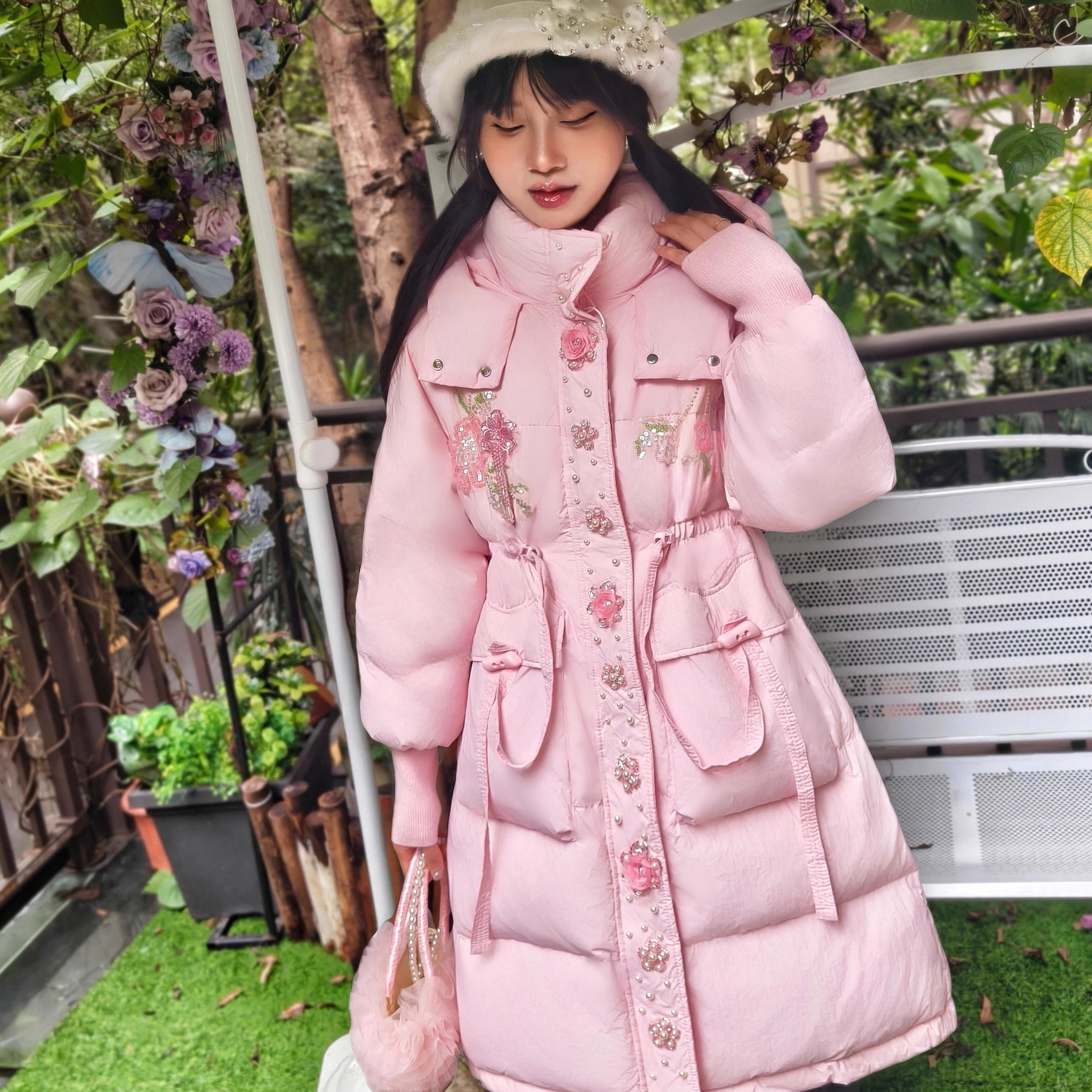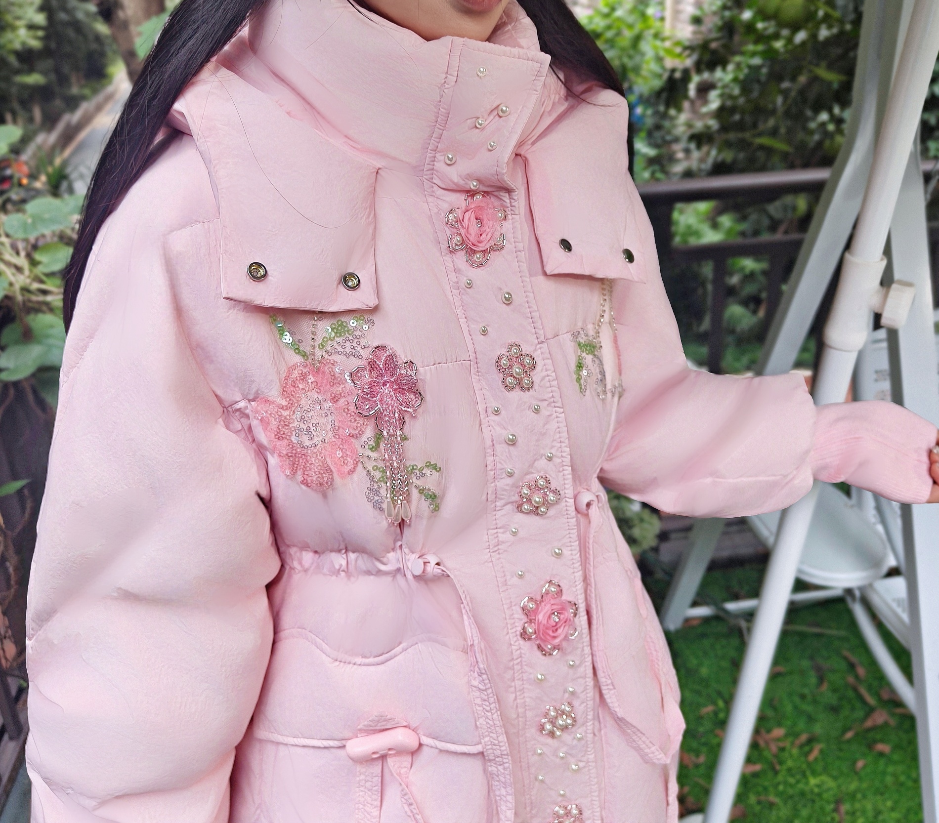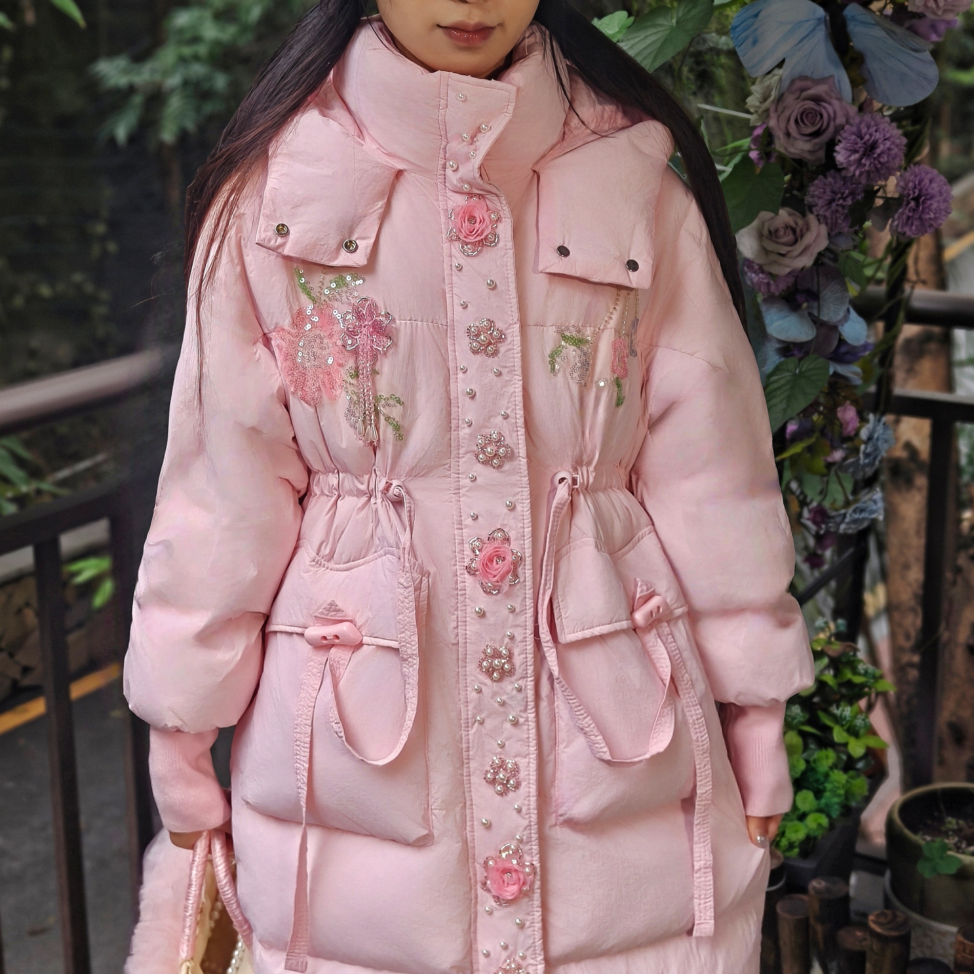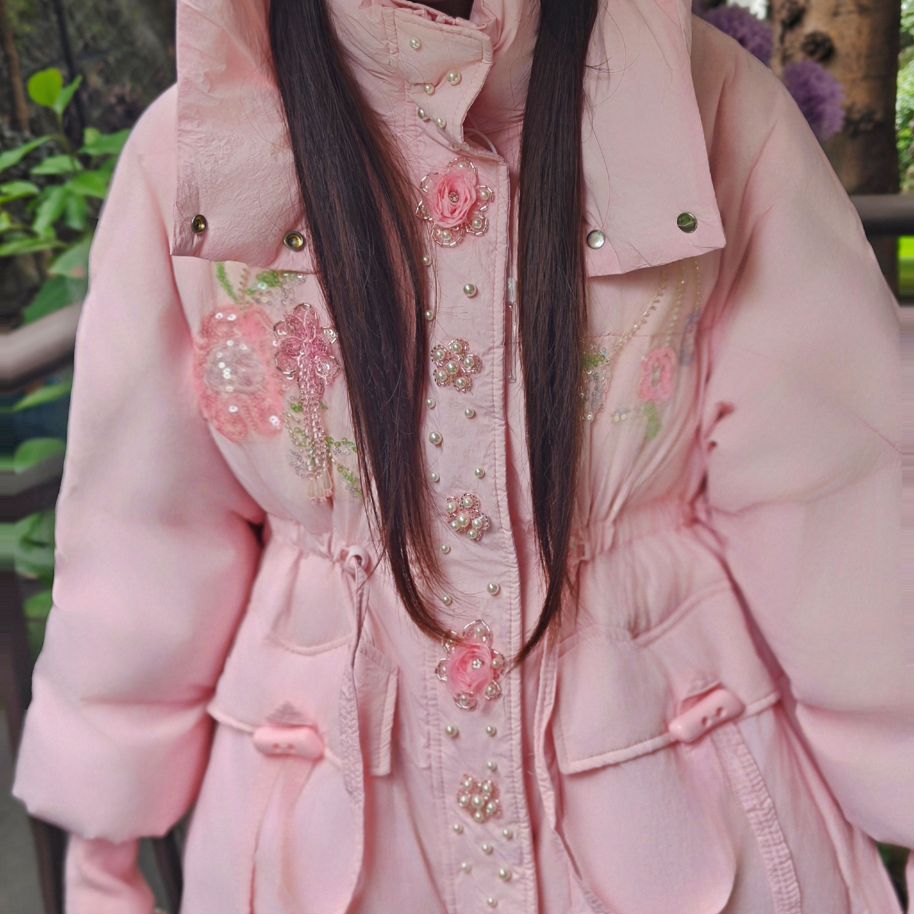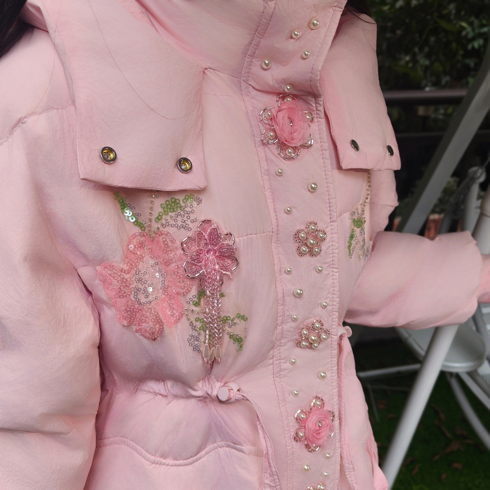 高級 不撞衣 手工粉嫩亮片串珠立體花朵加厚加厚白鴨絨外套羽絨服