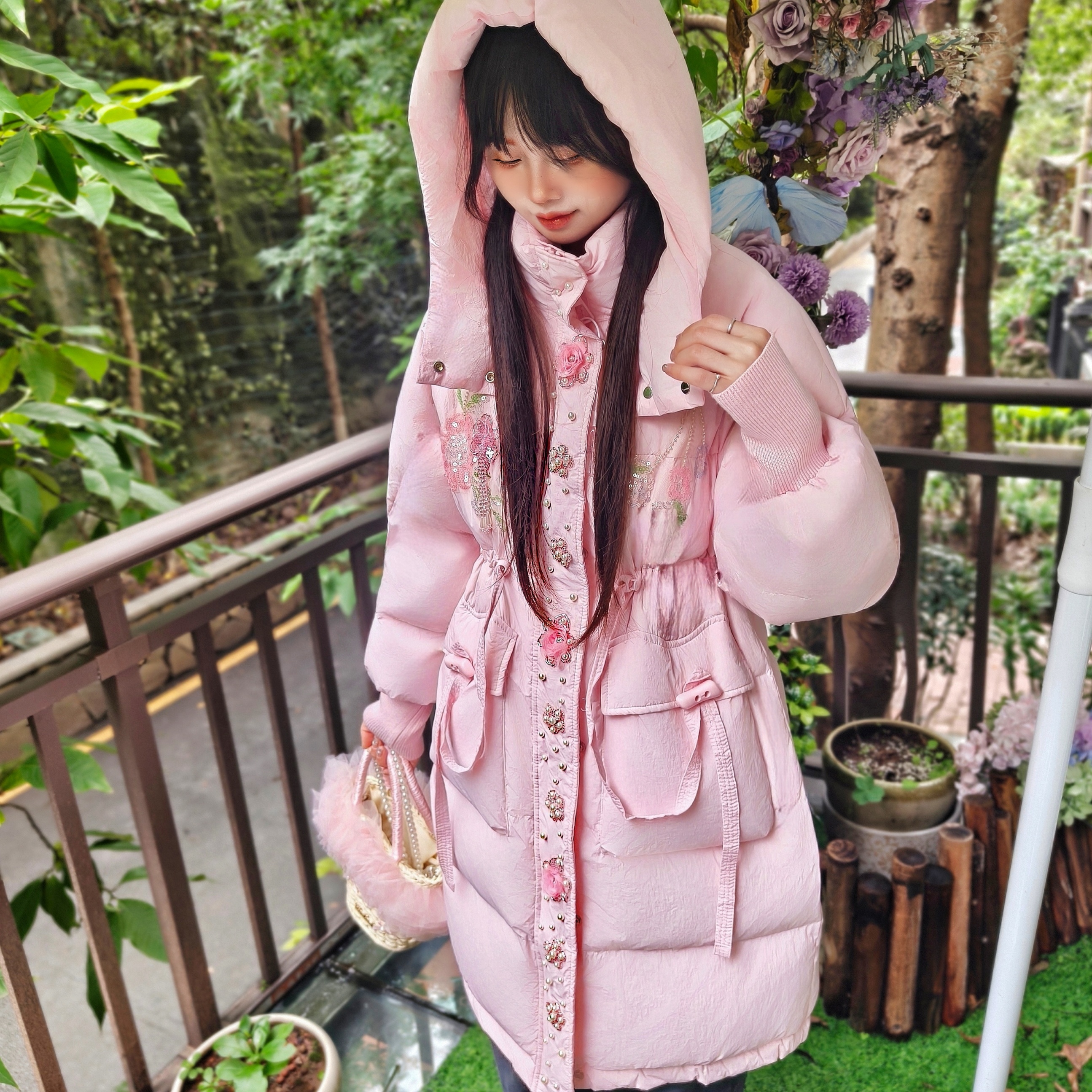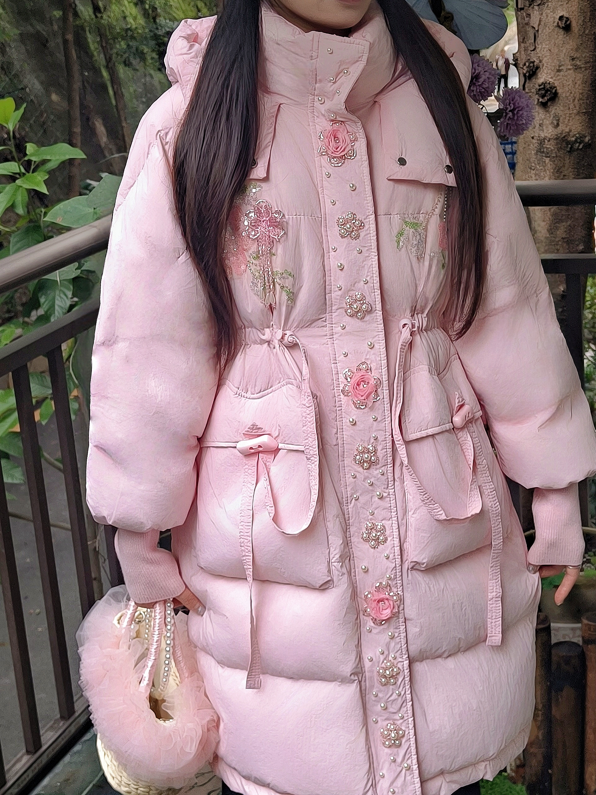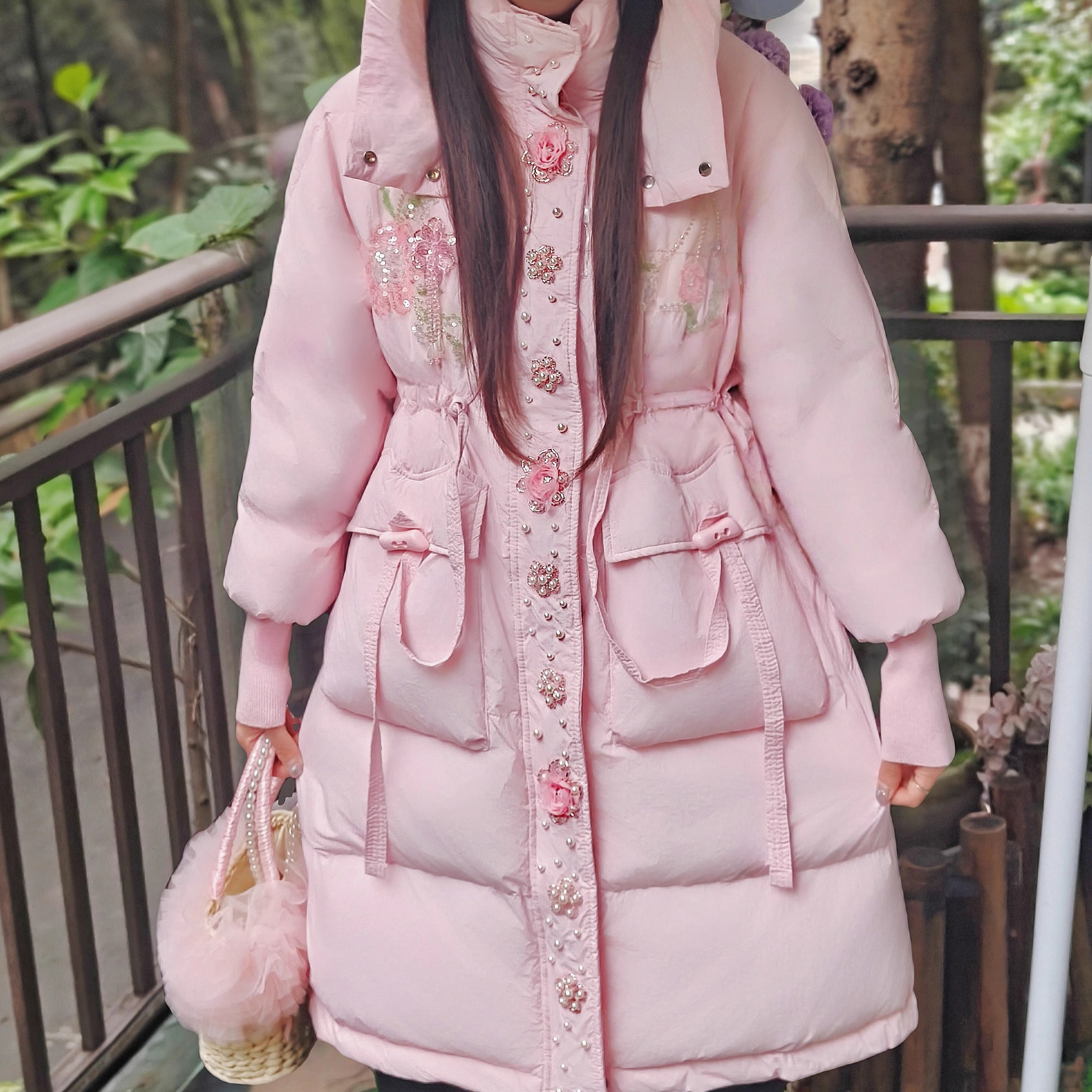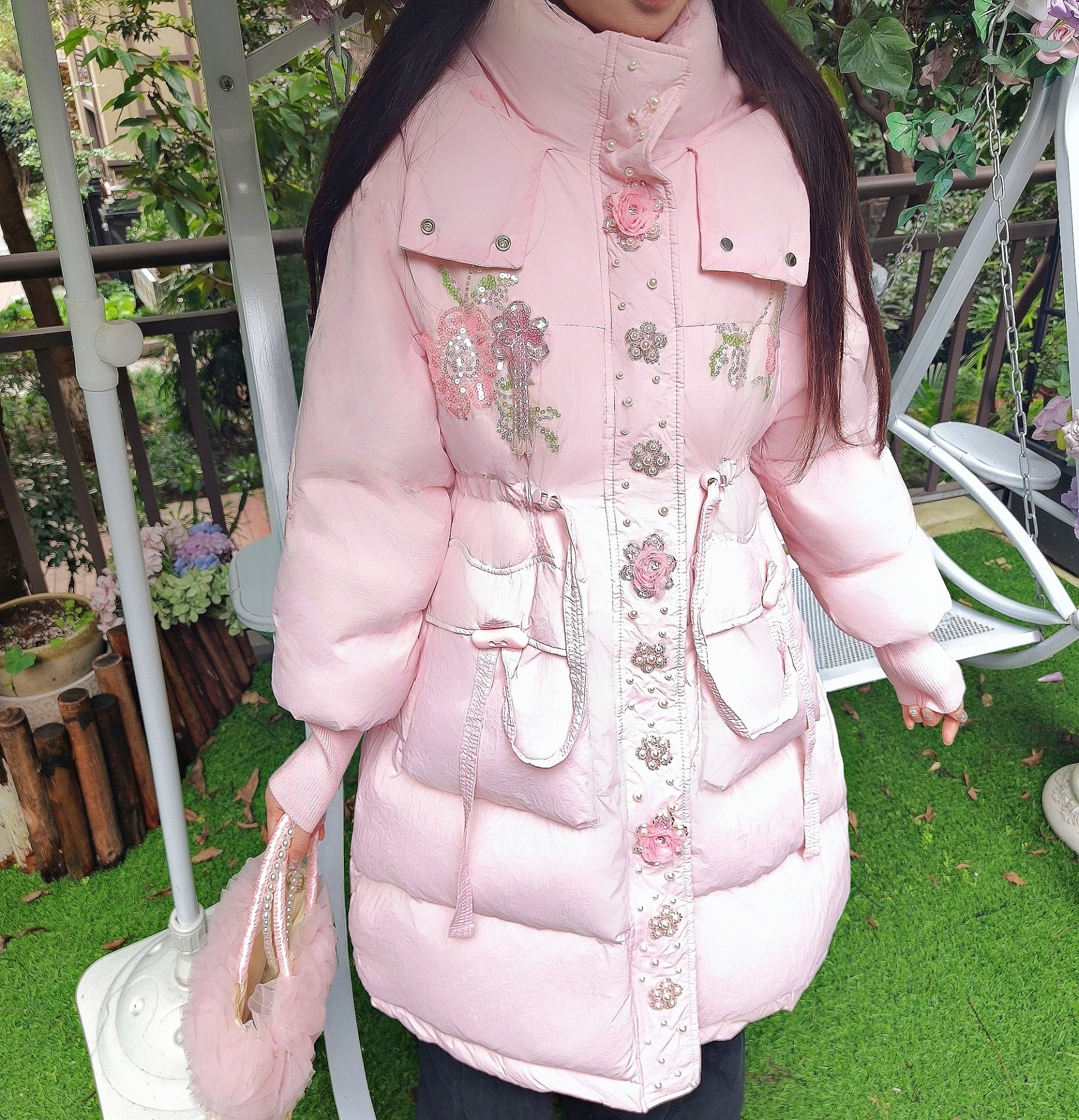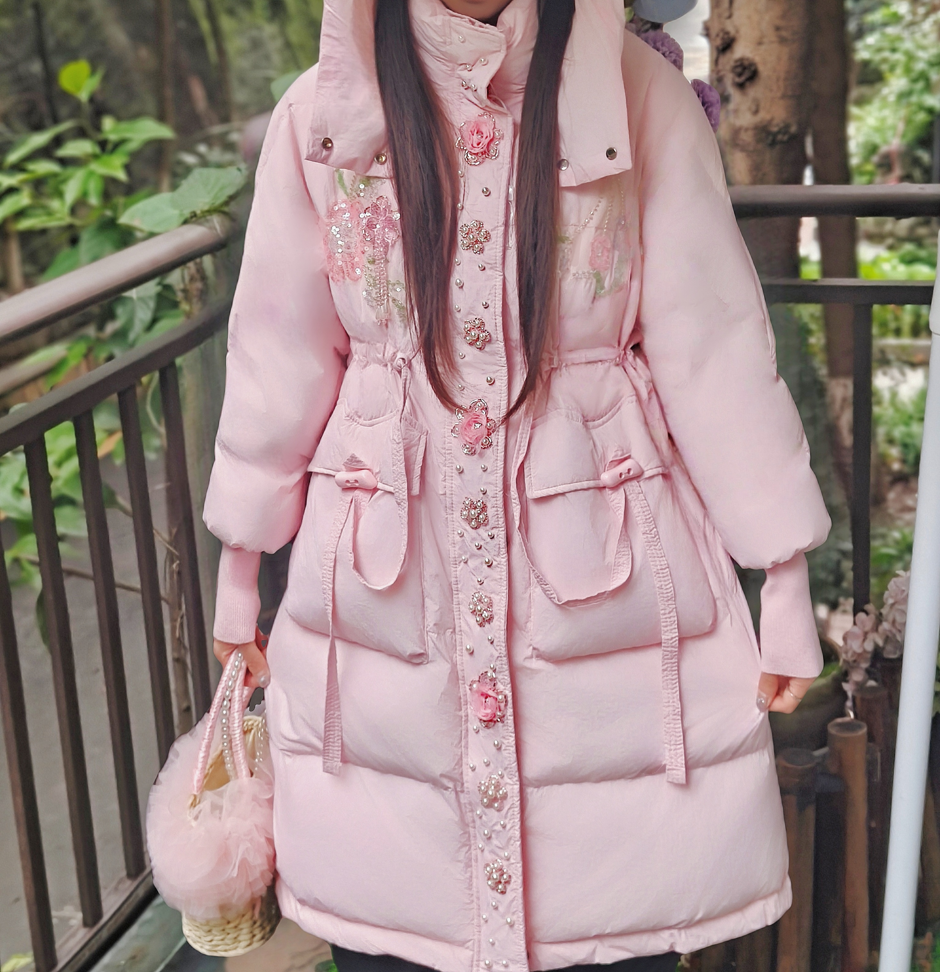 高級 不撞衣 手工粉嫩亮片串珠立體花朵加厚加厚白鴨絨外套羽絨服