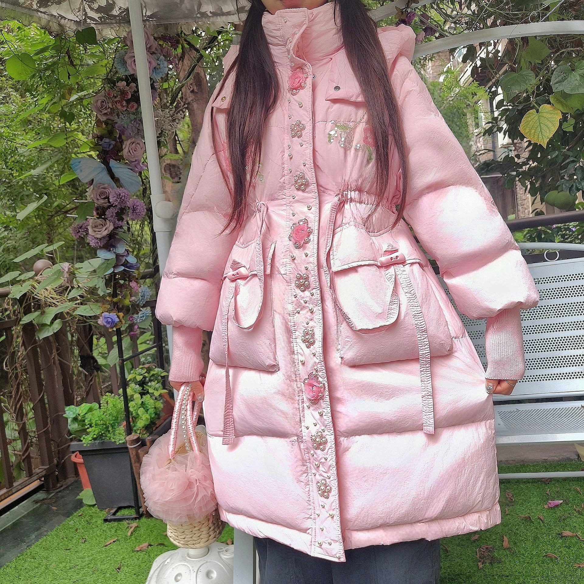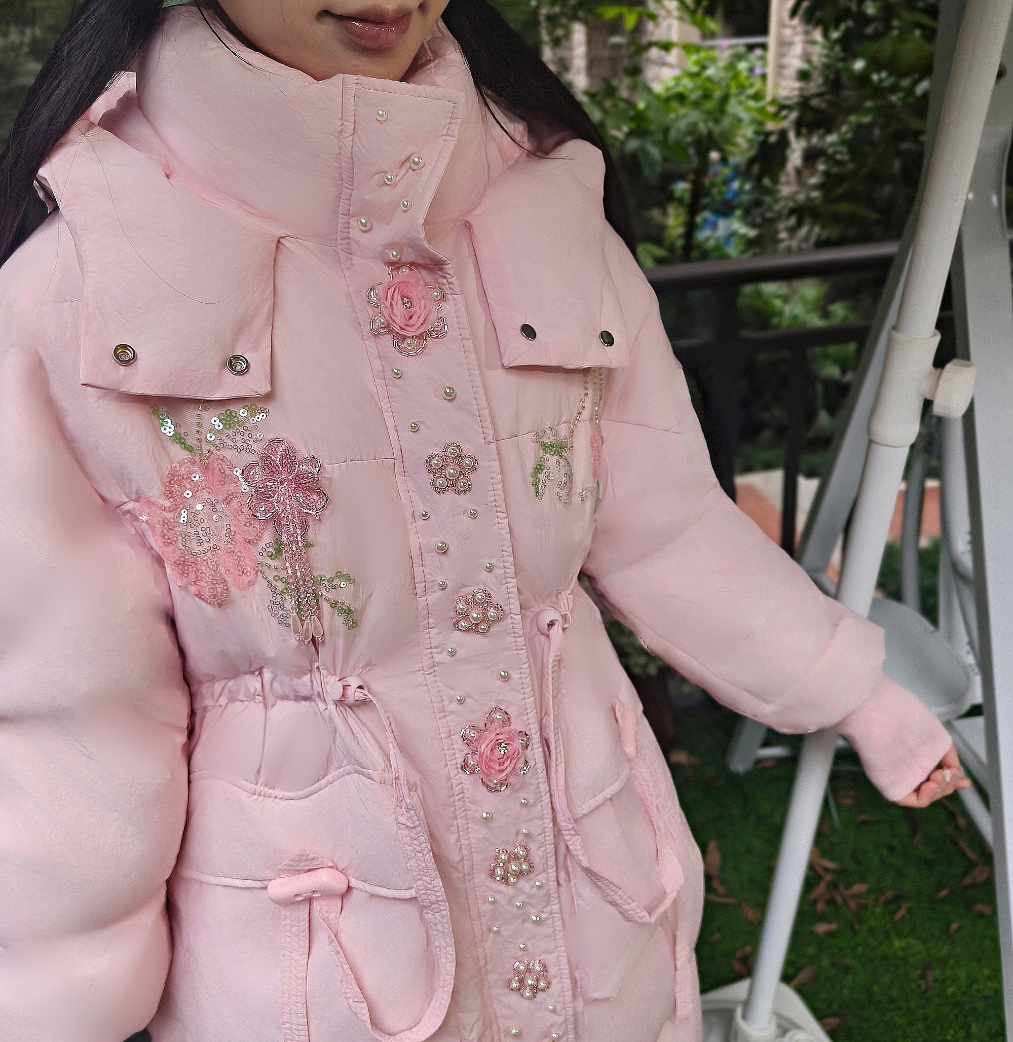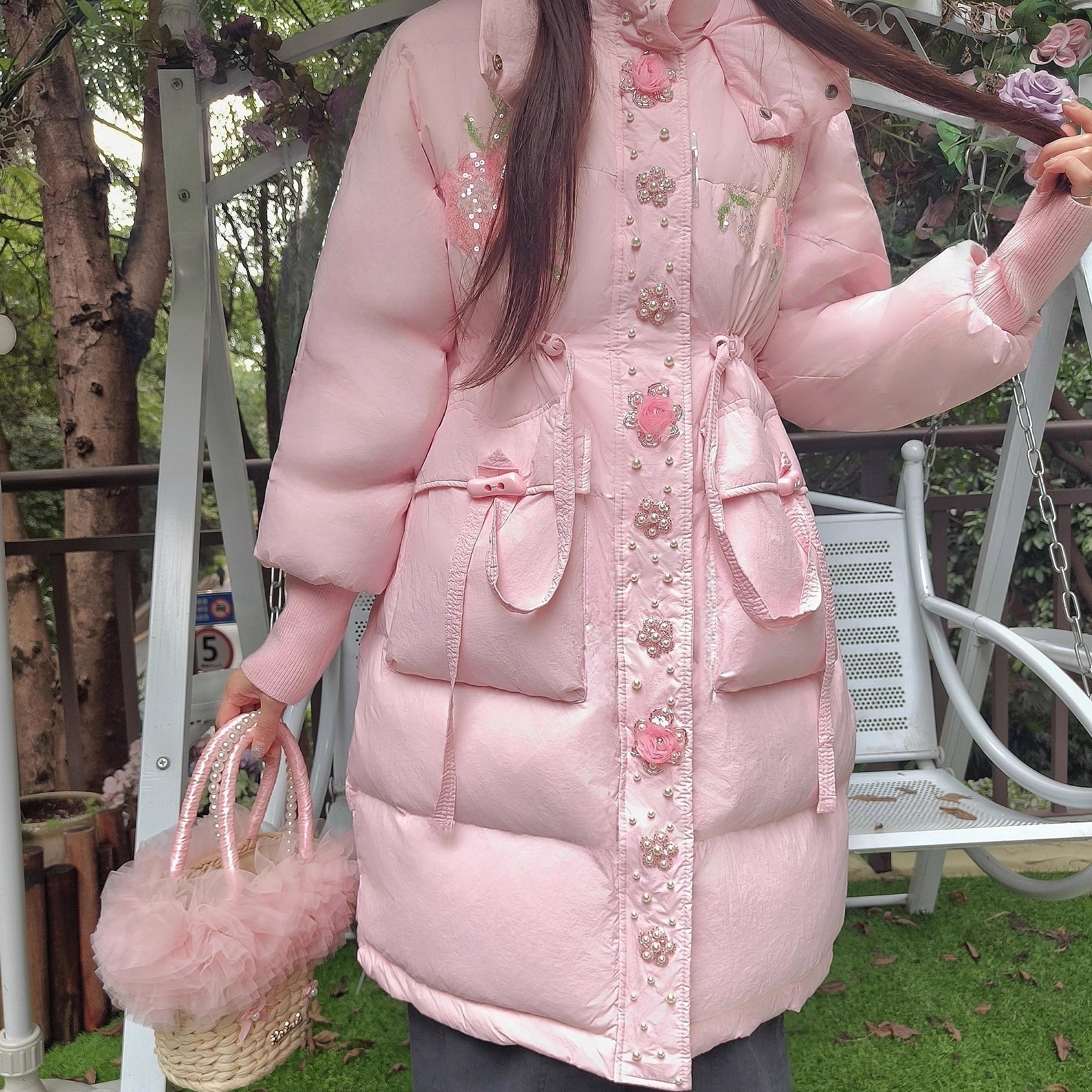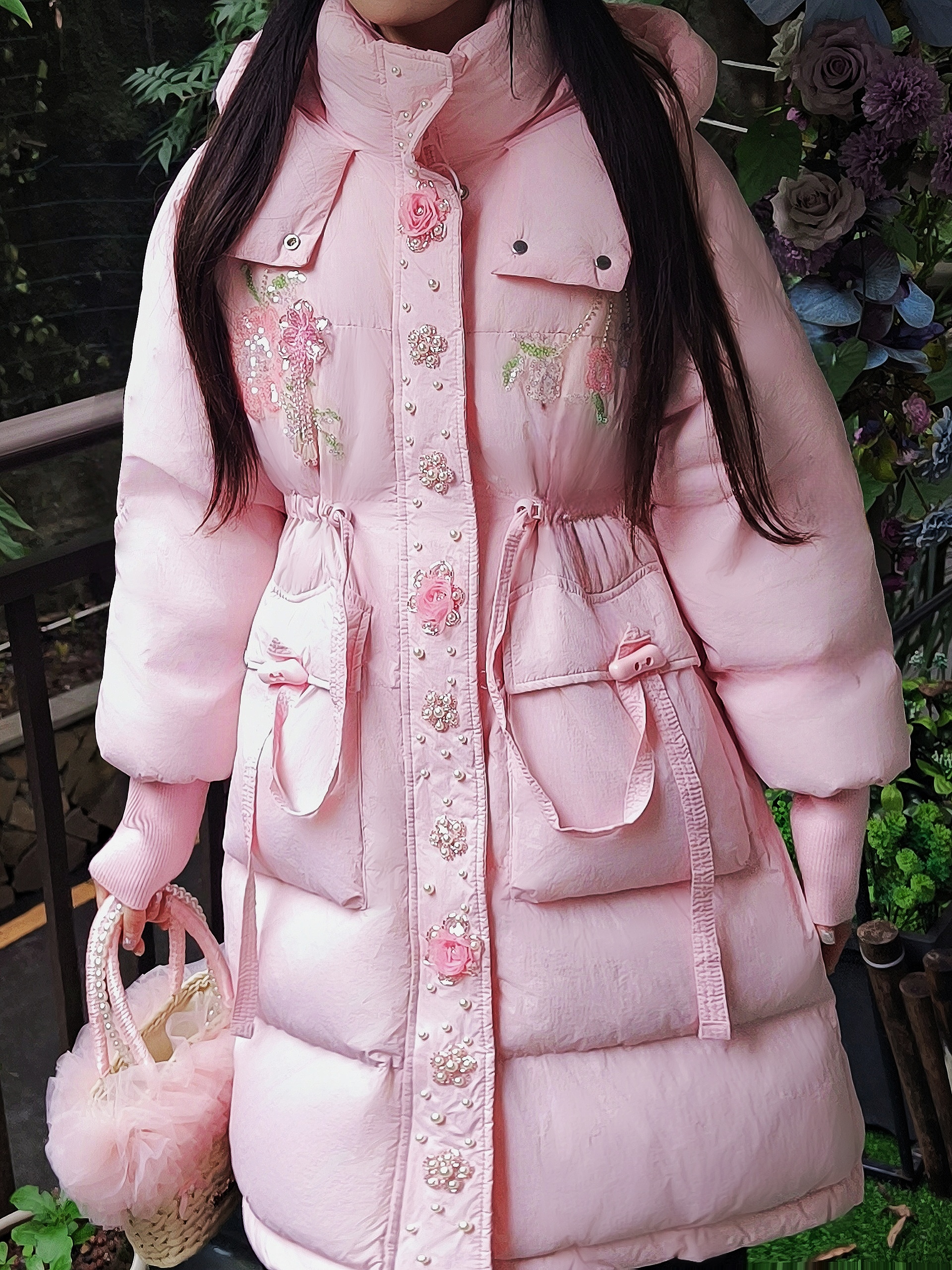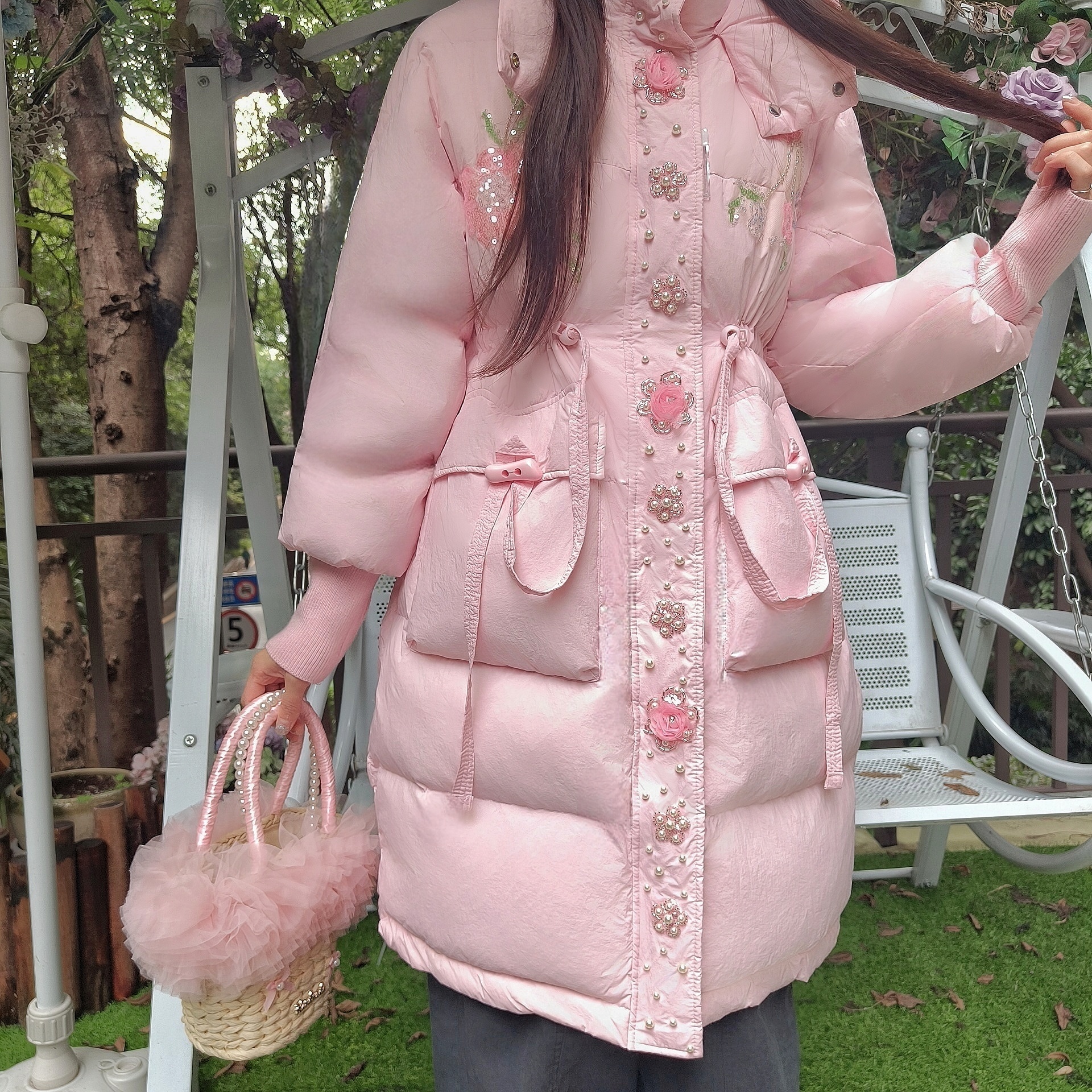 高級 不撞衣 手工粉嫩亮片串珠立體花朵加厚加厚白鴨絨外套羽絨服